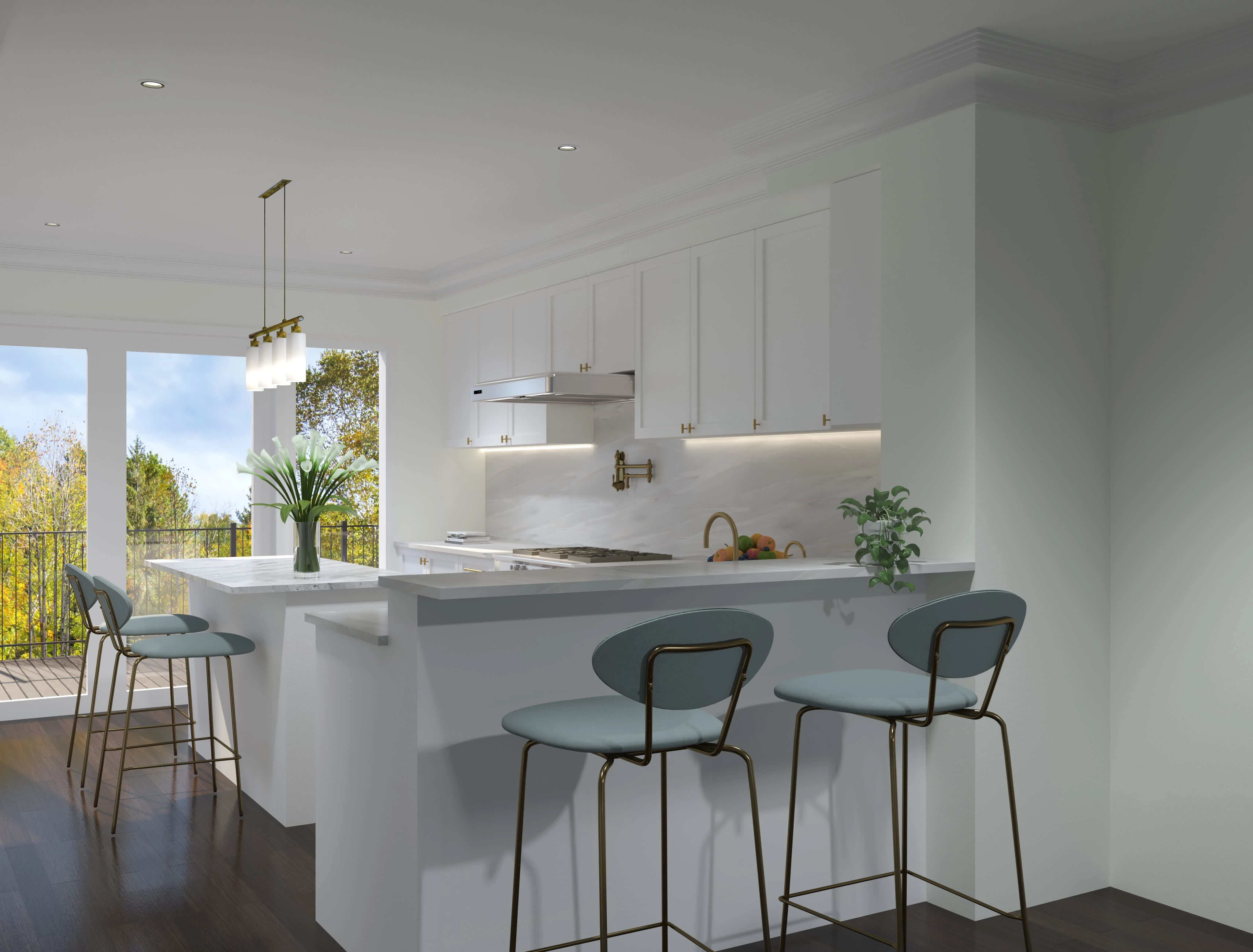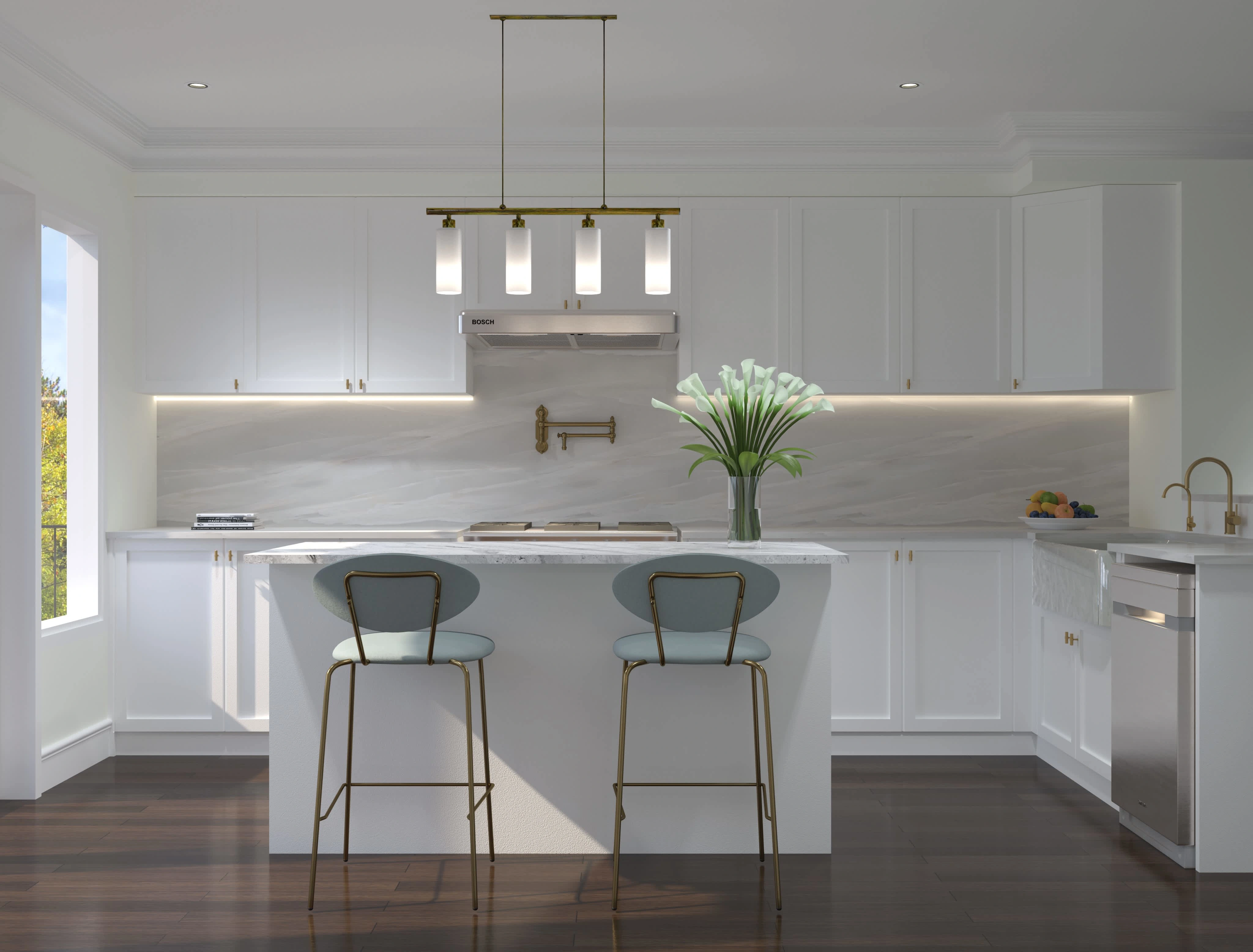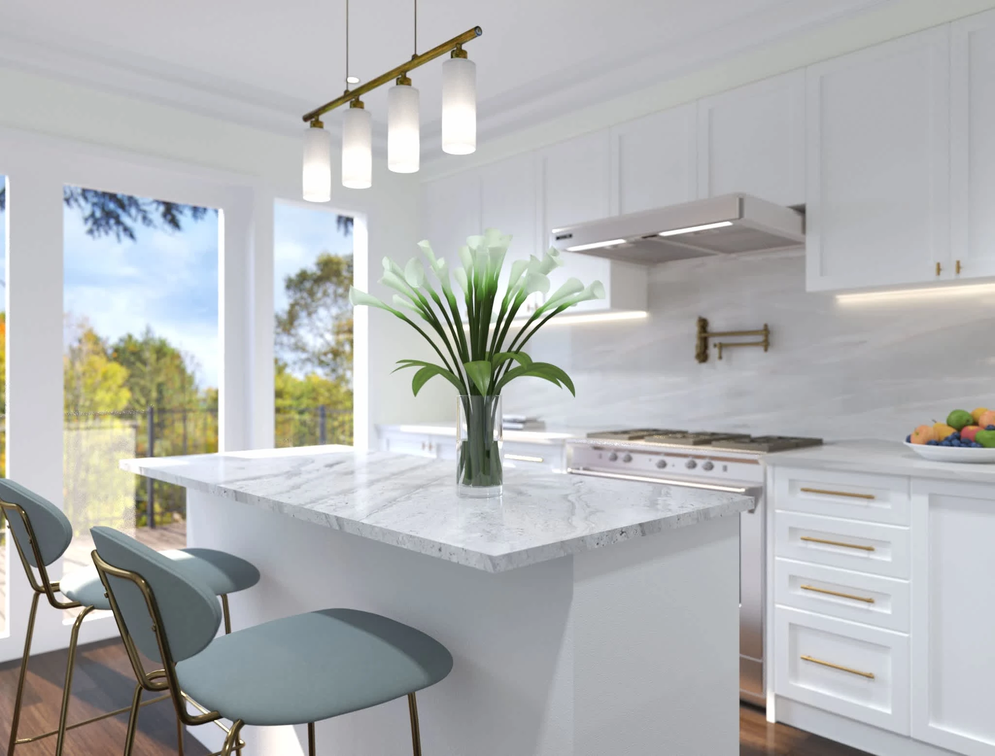 Modern, functional kitchen with neutral tones, marble finishes, gold accents, and great lighting, creating an elegant and inviting space.