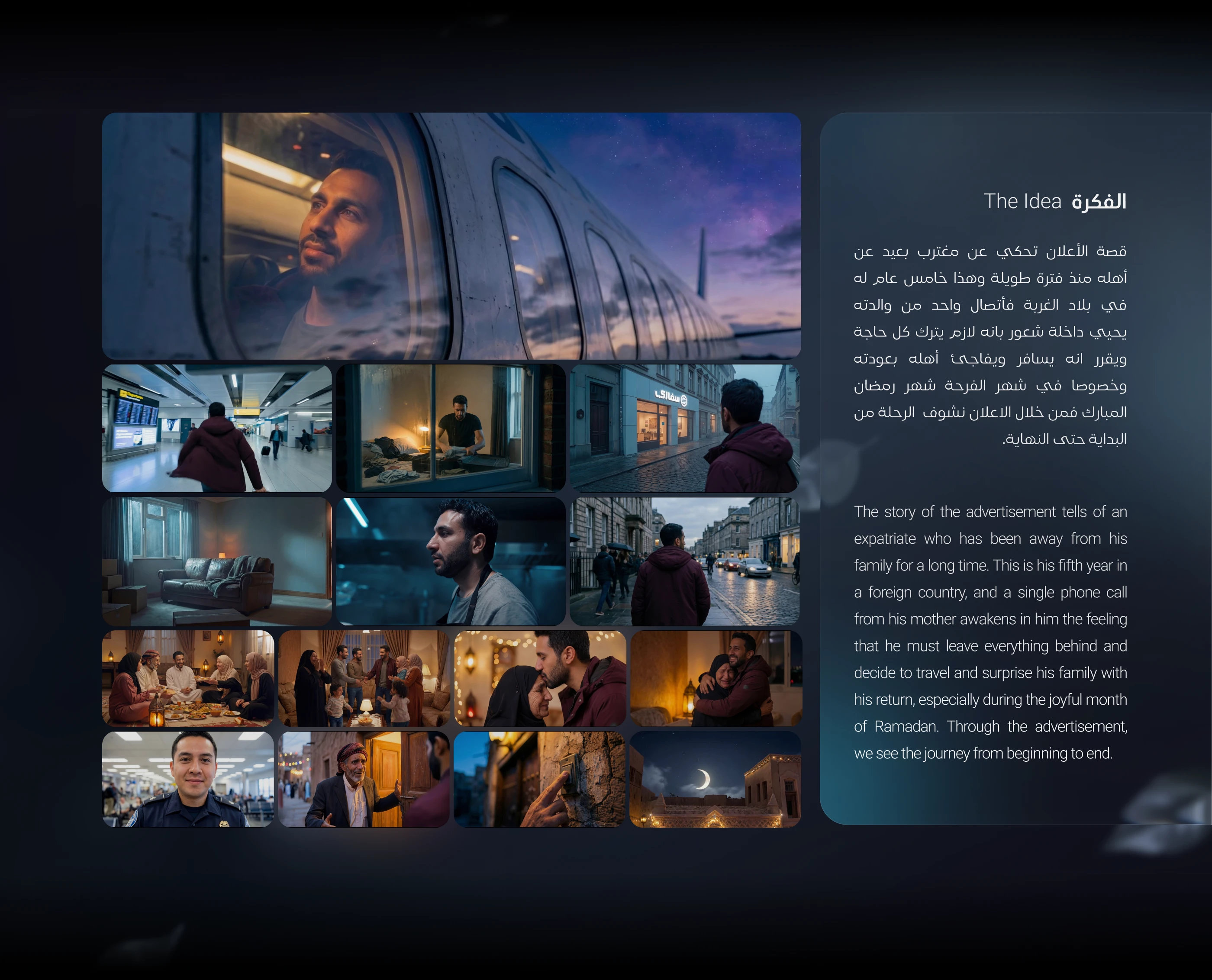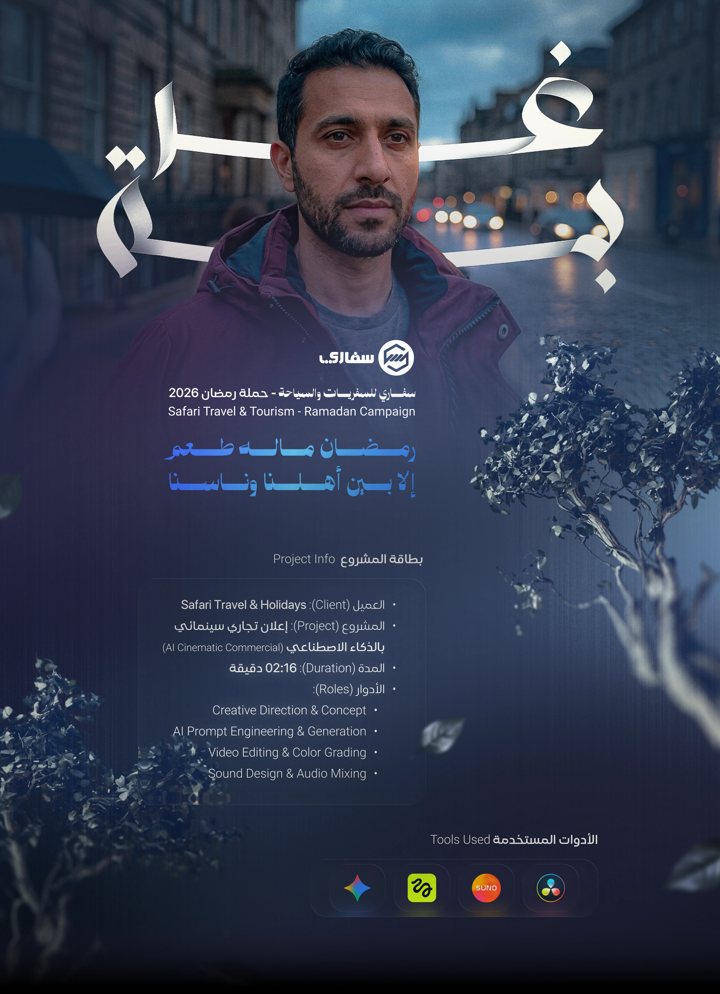 "Ramadan tastes different when you're home." A fully AI-generated cinematic commercial for a fictional travel agency (Safari Travel). The story follows an expatriate missing his family during the holy month of Ramadan. A heartfelt voice message from his mother triggers a deeply emotional journey back to the warm, ancient streets of Old Sana'a, Yemen. This project was directed, prompt-engineered, edited, and color-graded entirely by SooniGaad to demonstrate the power of Generative AI in emotional storytelling and commercial advertising. "رمضان ماله طعم إلا بين أهلنا وناسنا." إعلان سينمائي متكامل تم توليده بالكامل باستخدام أدوات الذكاء الاصطناعي لوكالة سفريات (سفاري). تدور القصة حول شاب يمني مغترب يعاني من برودة الغربة، لتأتيه رسالة صوتية مليئة بالشوق من والدته، تدفعه لحزم أمتعته والعودة إلى دفء عائلته في أزقة صنعاء القديمة في ليالي رمضان. تم تنفيذ الفكرة، كتابة الأوامر (Prompts)، المونتاج، والتلوين السينمائي بالكامل من قبلي لإبراز قوة الذكاء الاصطناعي في السرد البصري العاطفي وصناعة ا