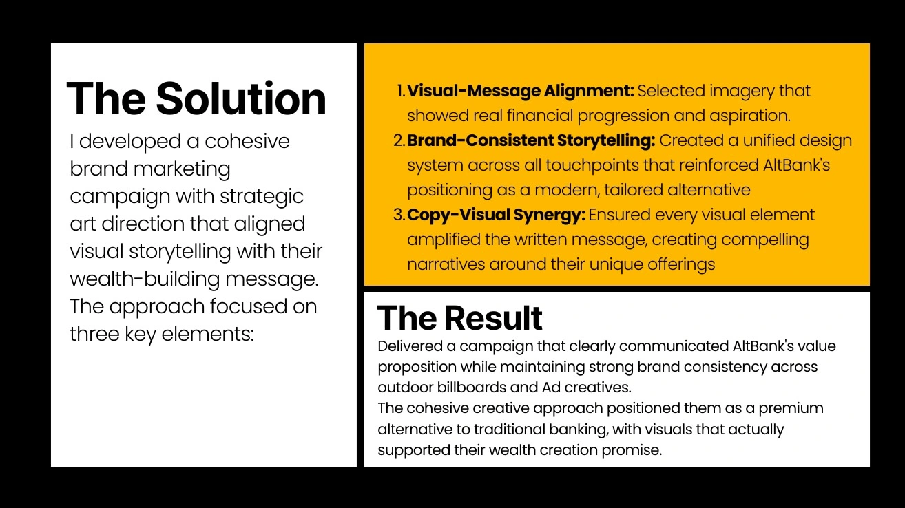 Delivered a campaign that clearly communicated AltBank's value proposition while maintaining strong brand consistency across outdoor billboards and Ad creatives