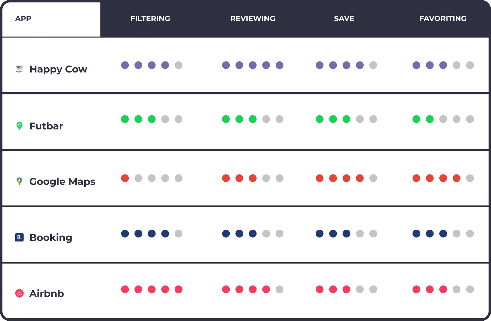 I performed a benchmark of various apps related to the main functionality, comparing features like filtering bars/pubs/houses, reviewing a place, saving a place for later, or favoriting an item.