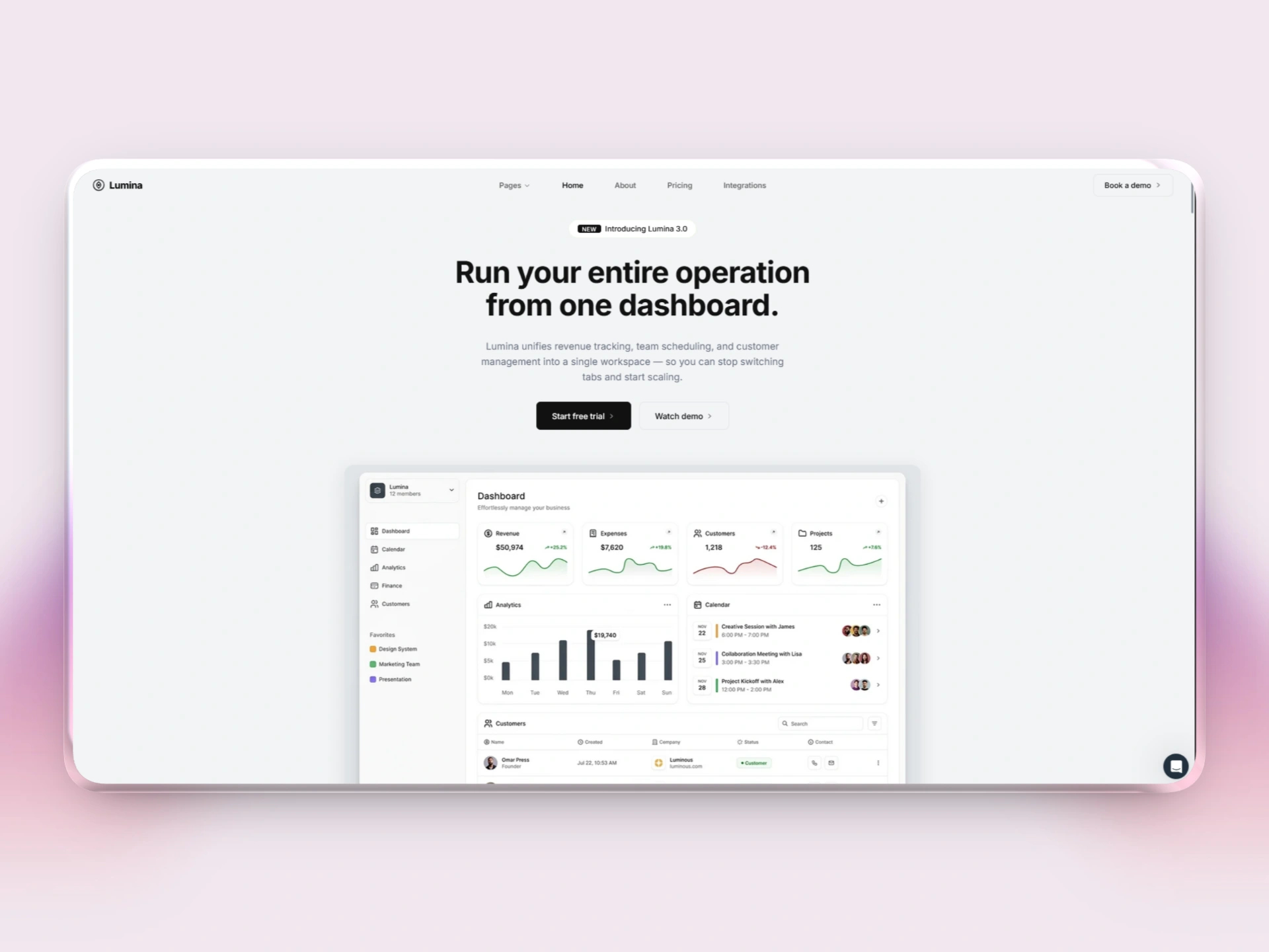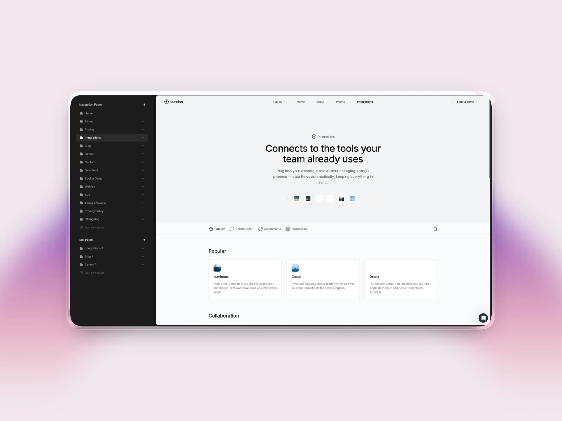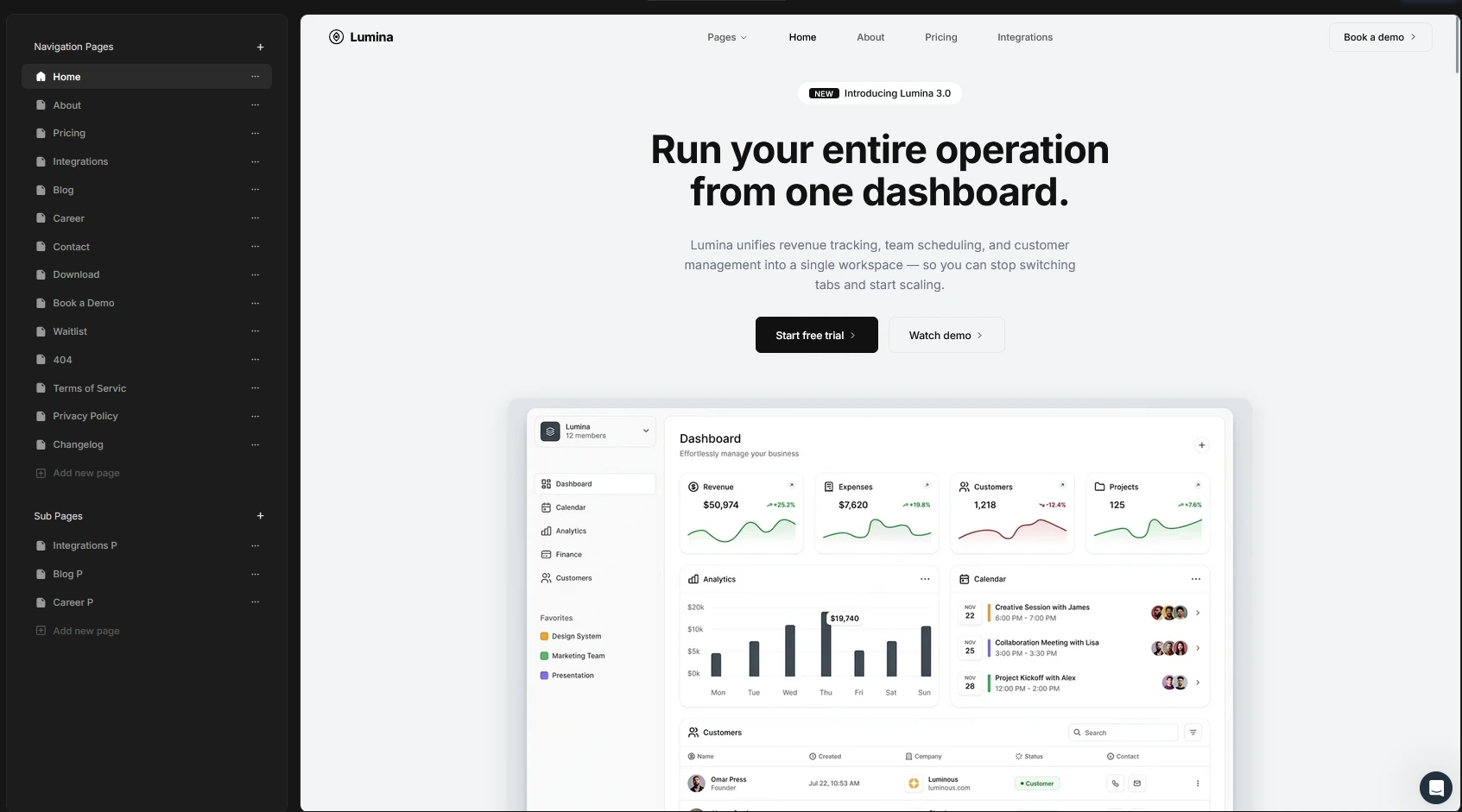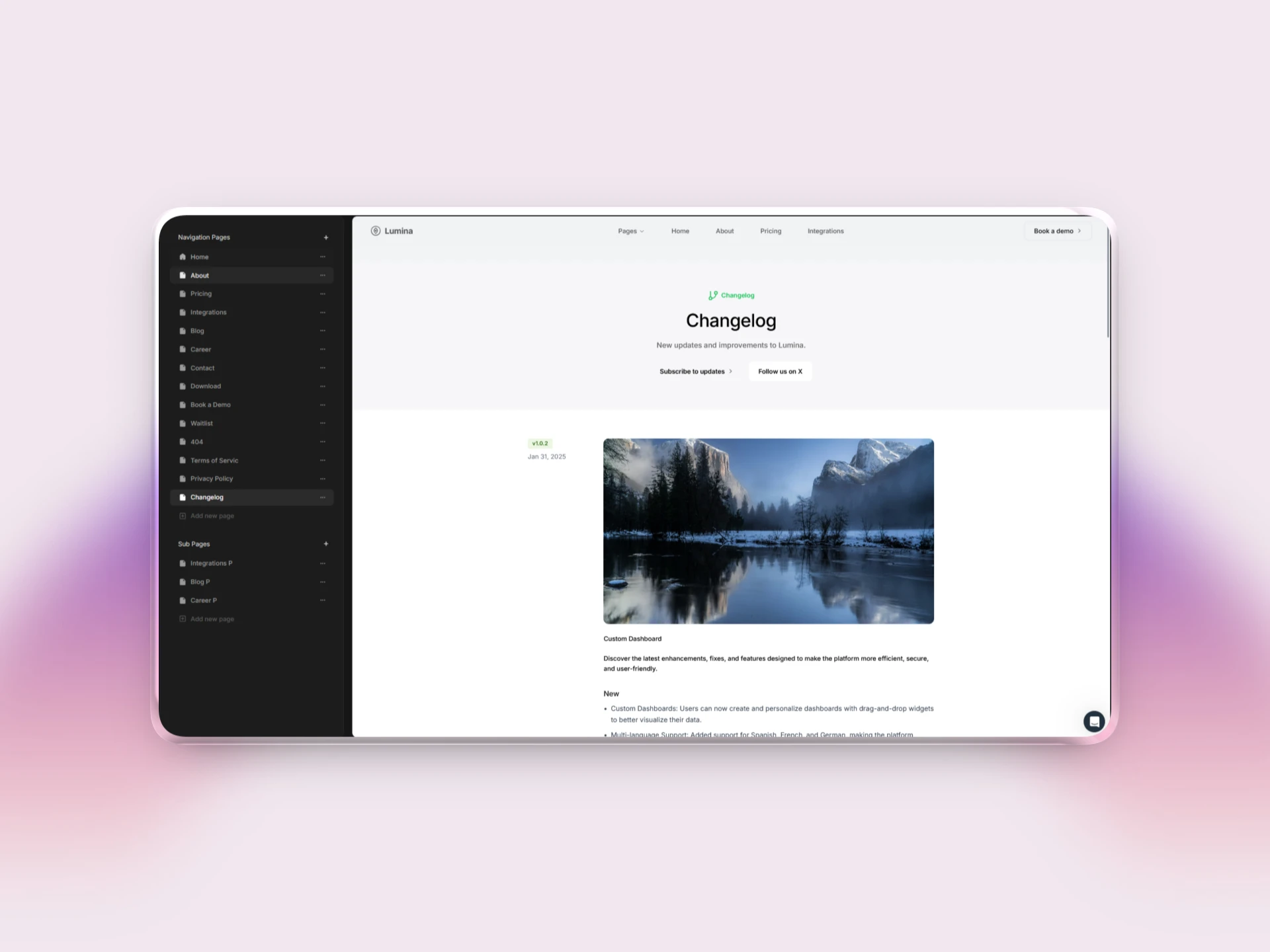 Lumina 3.0 is the strongest template out of a collection of 10 I built for Framekit, an AI website builder. It's a complete SaaS website with 14 fully designed pages — from landing page and pricing to blog, changelog, integrations, and more.