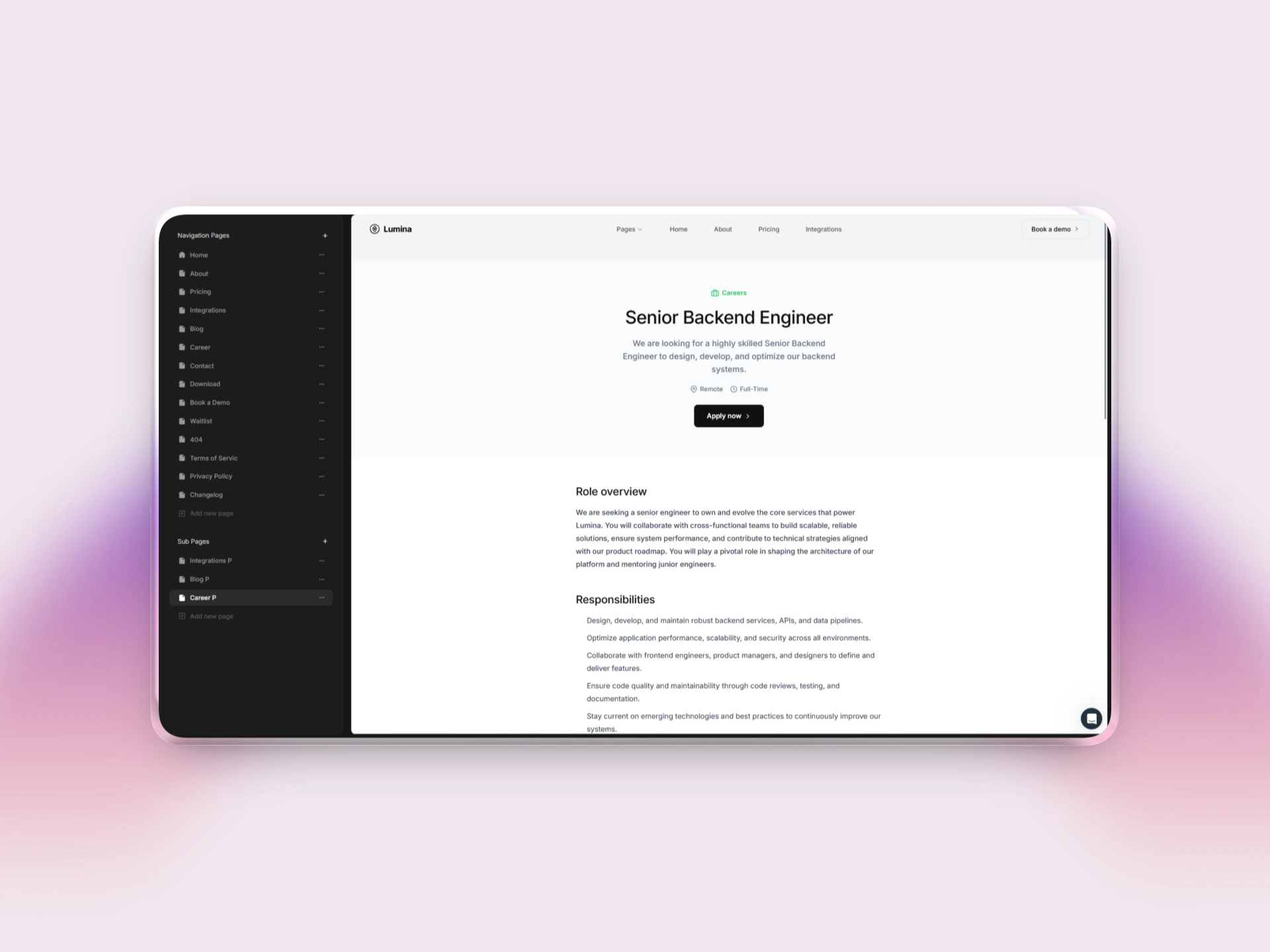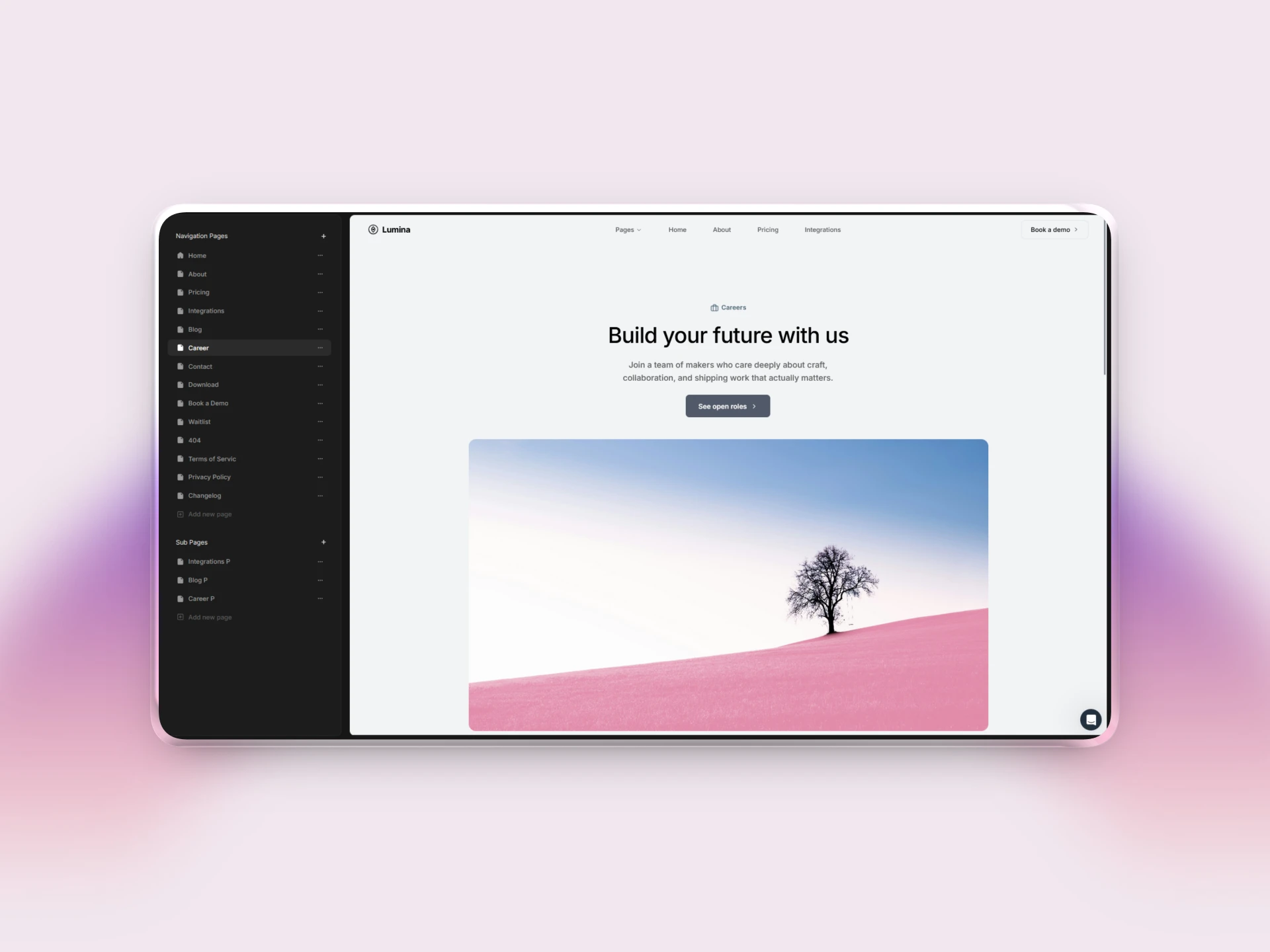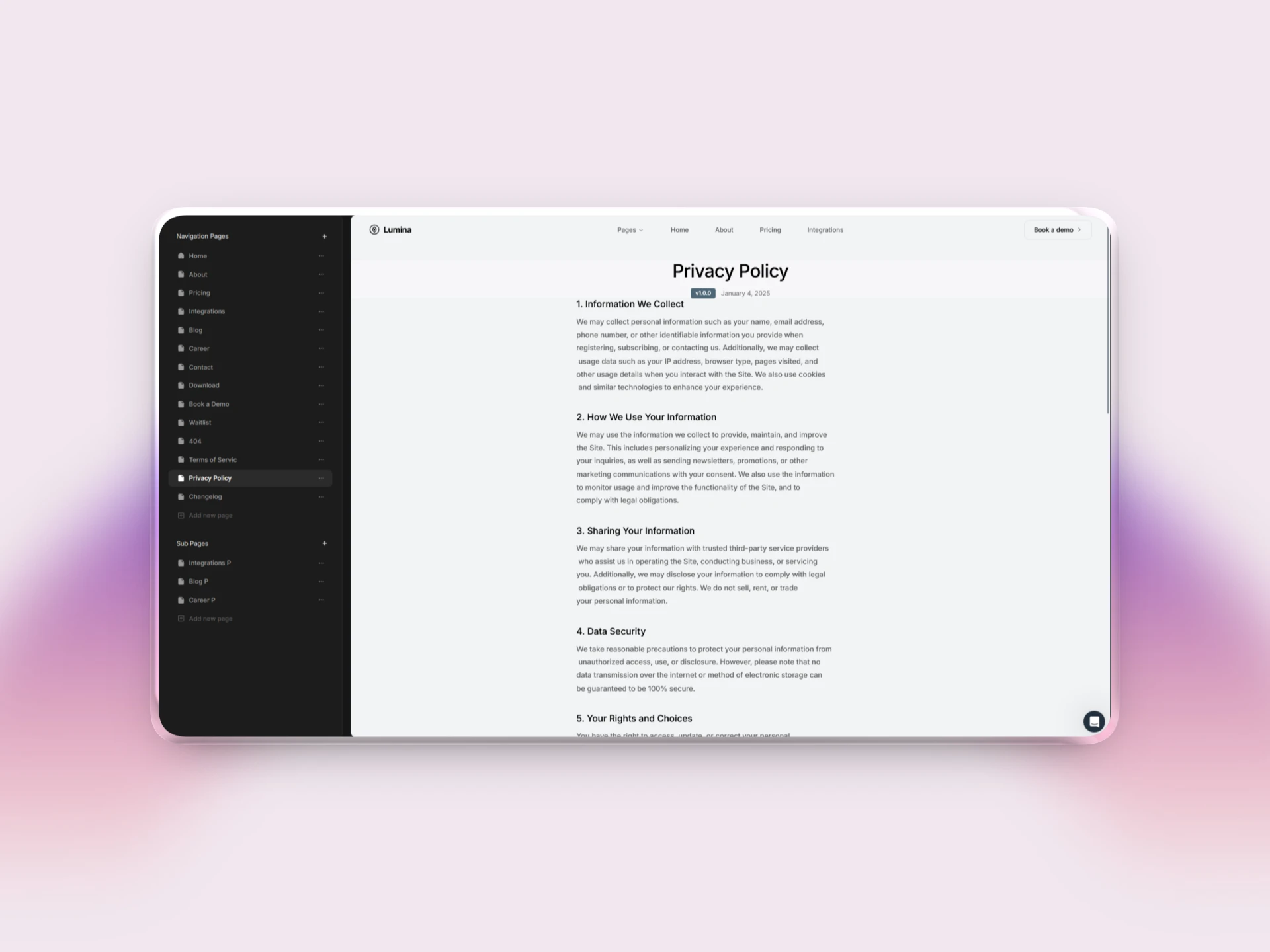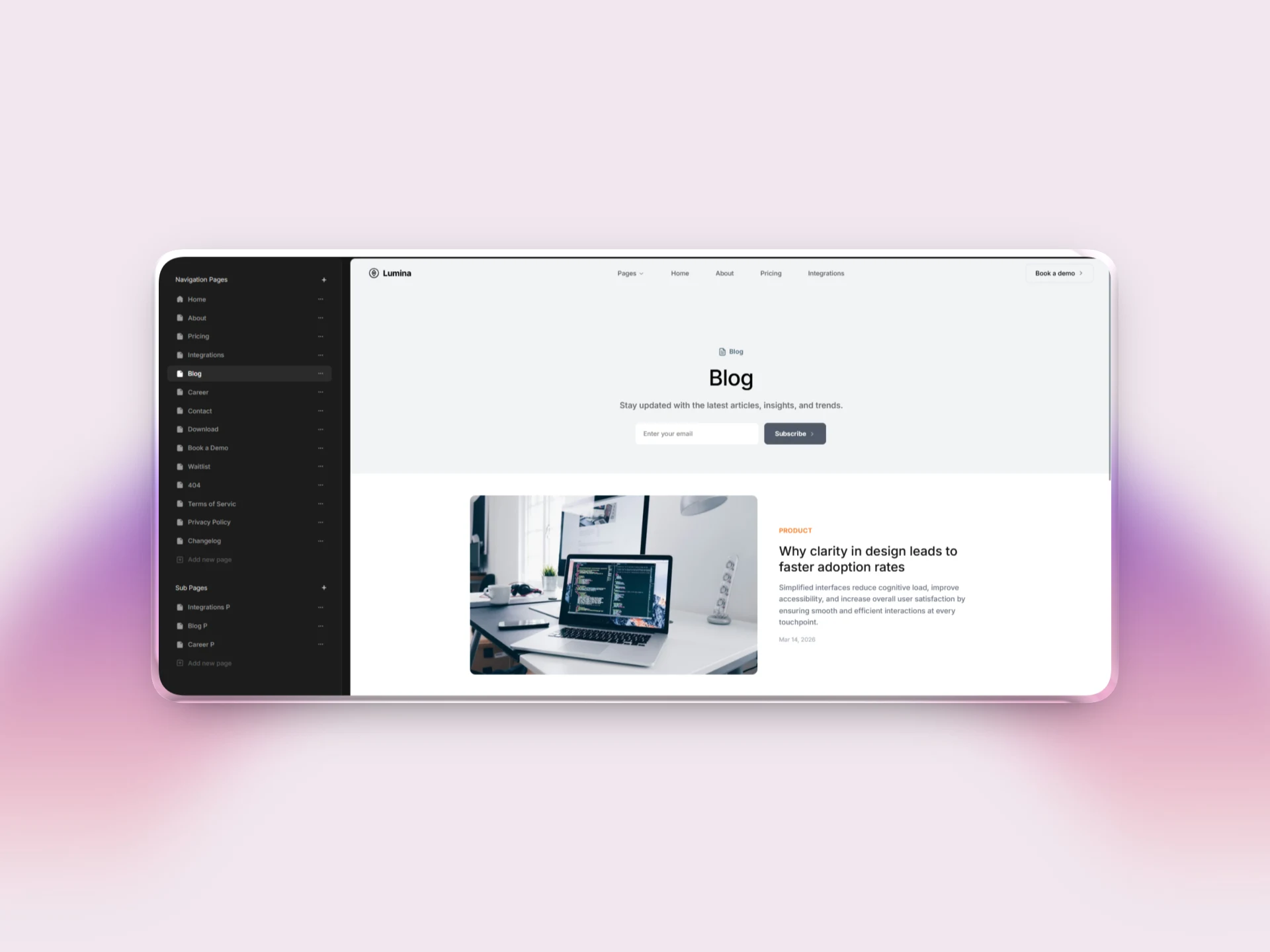 Lumina 3.0 is the strongest template out of a collection of 10 I built for Framekit, an AI website builder. It's a complete SaaS website with 14 fully designed pages — from landing page and pricing to blog, changelog, integrations, and more.