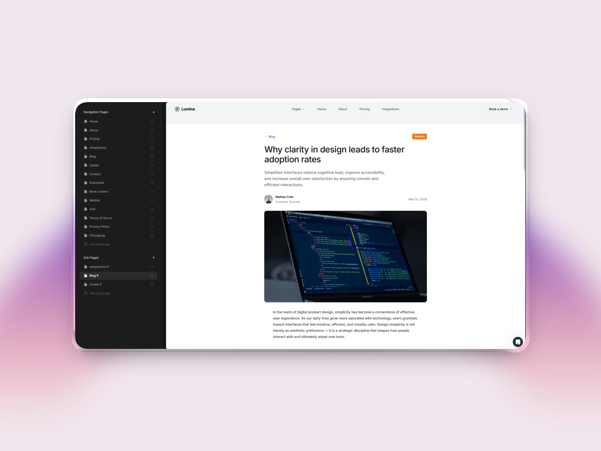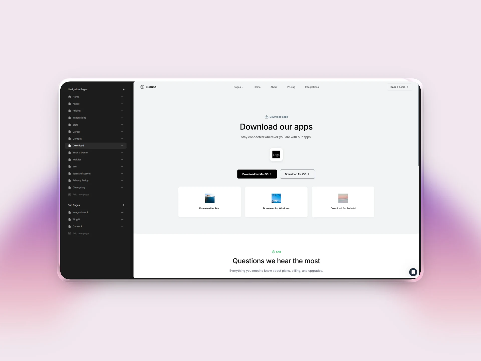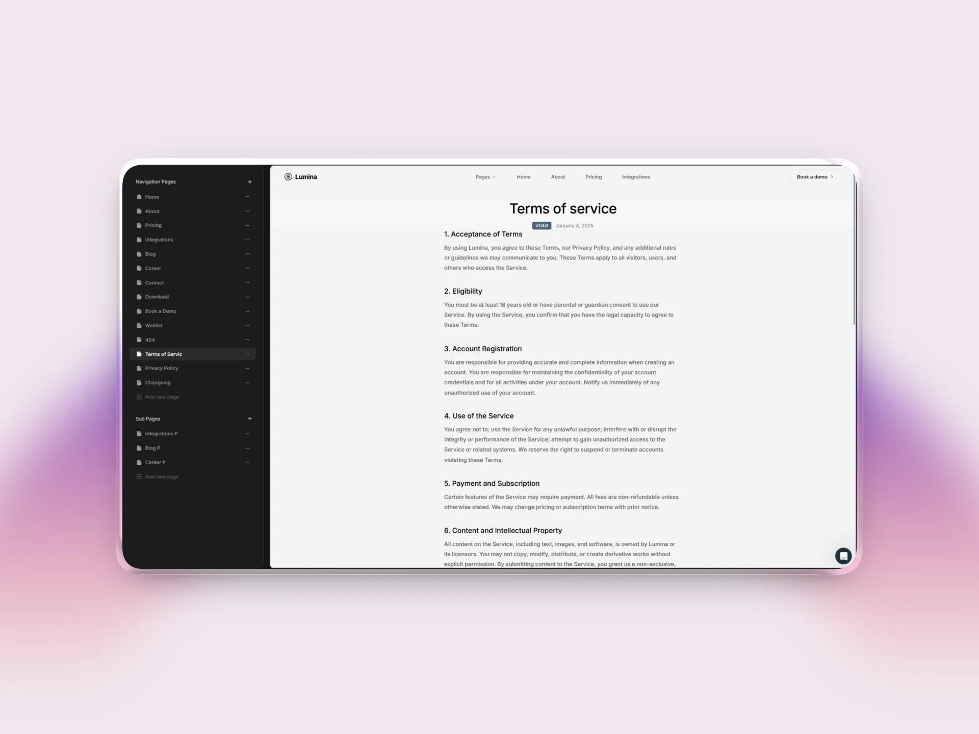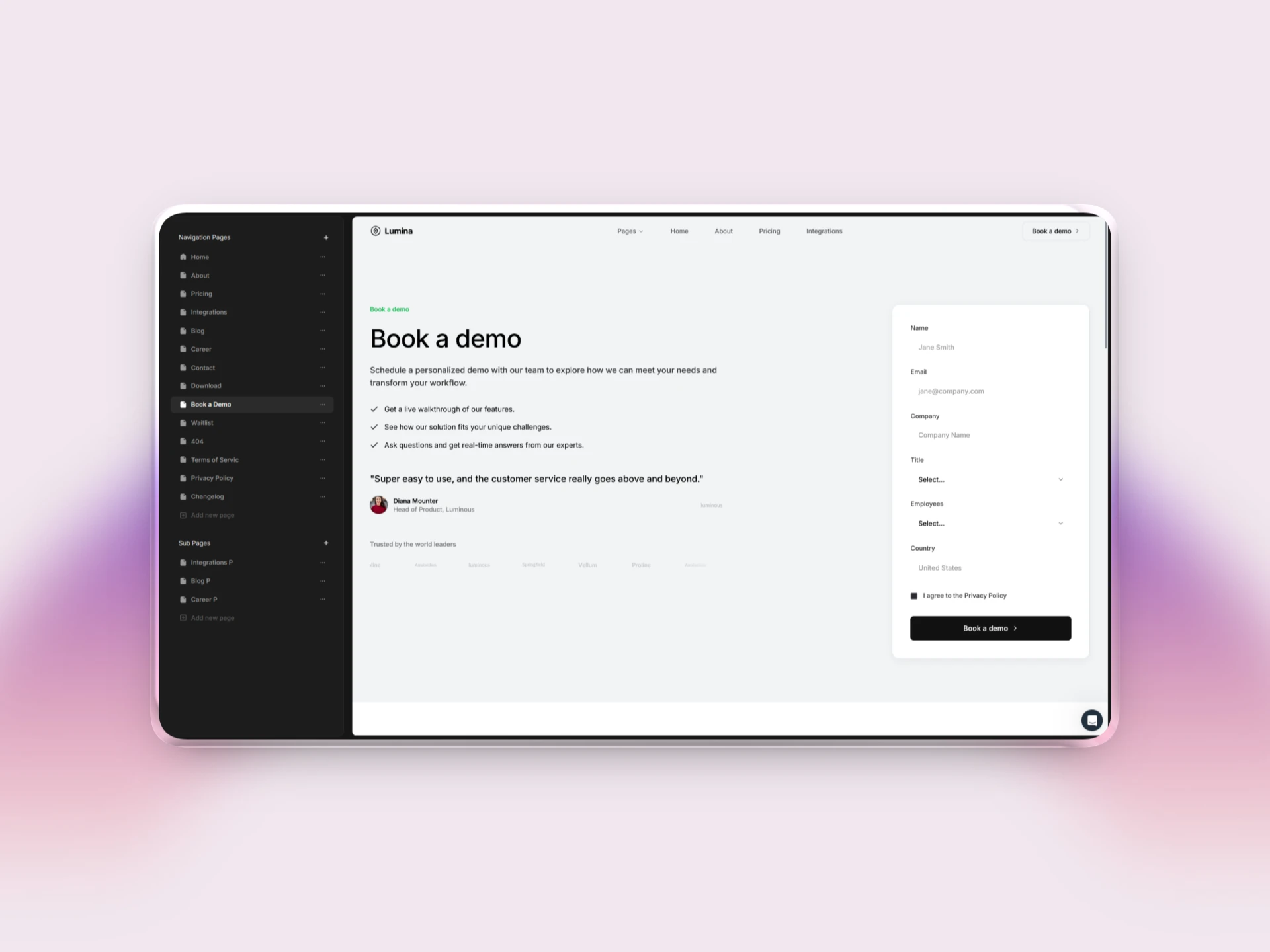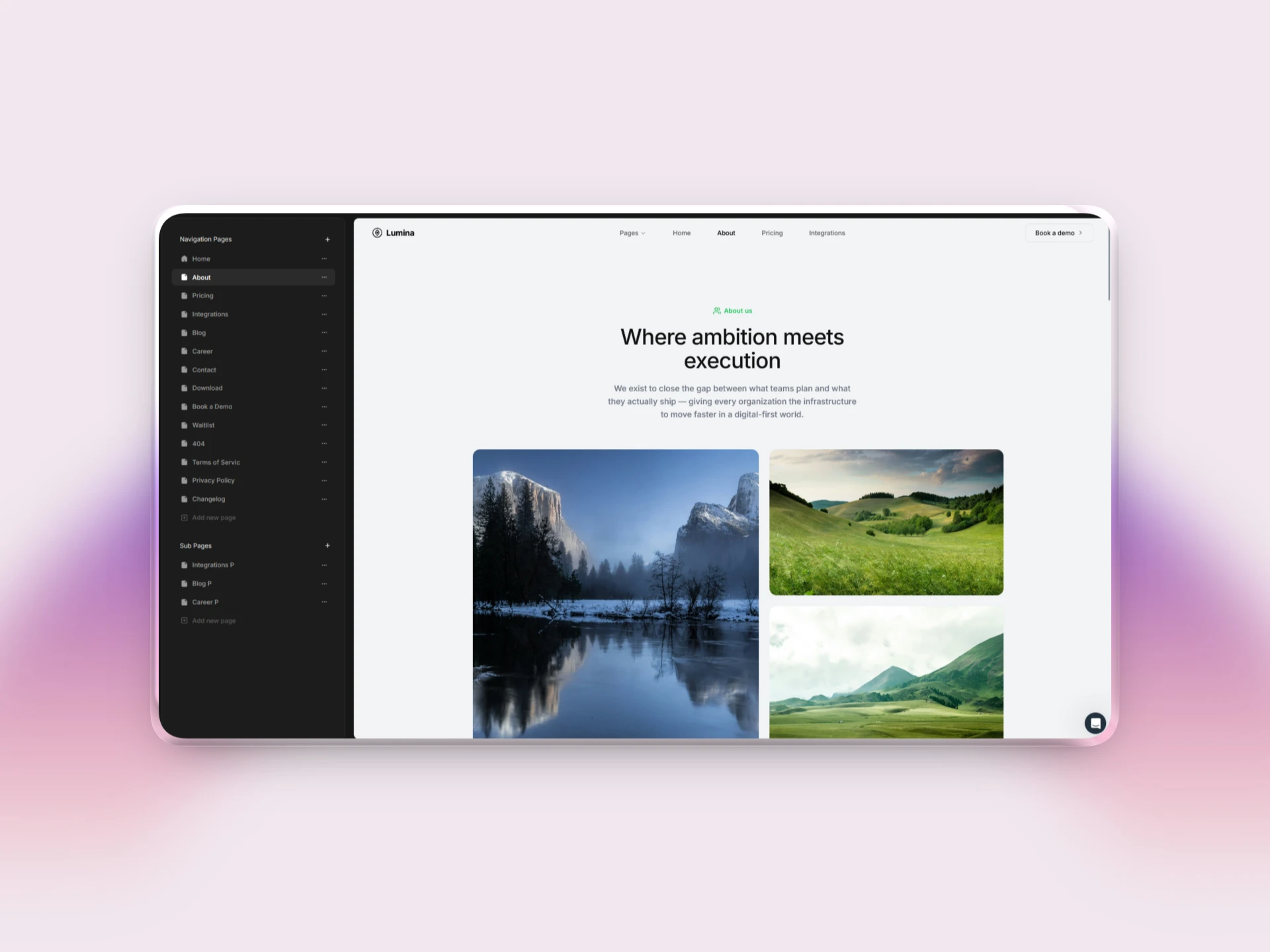 Lumina 3.0 is the strongest template out of a collection of 10 I built for Framekit, an AI website builder. It's a complete SaaS website with 14 fully designed pages — from landing page and pricing to blog, changelog, integrations, and more.