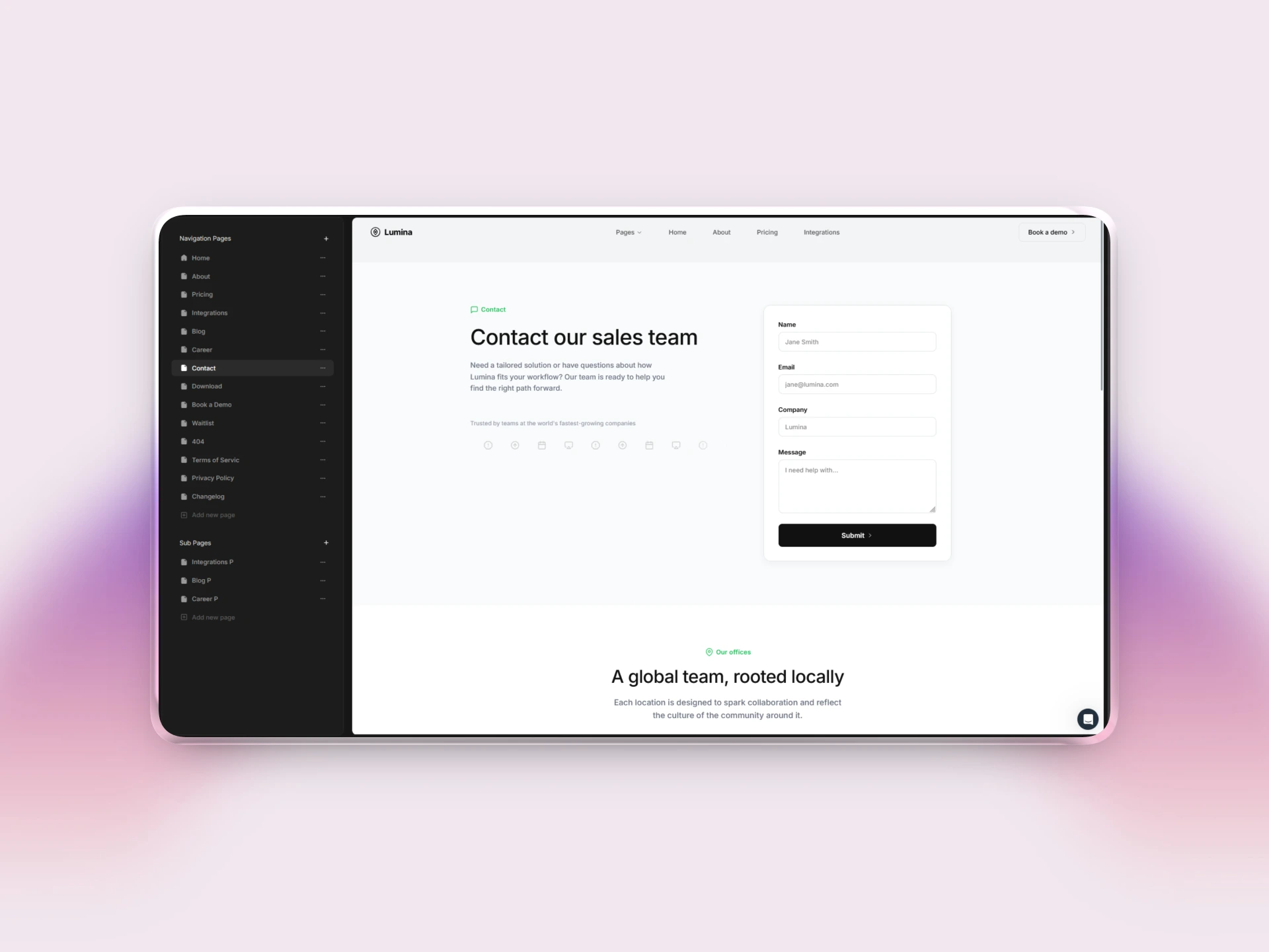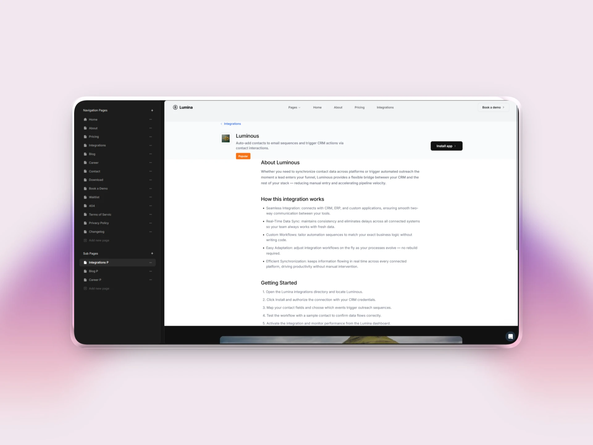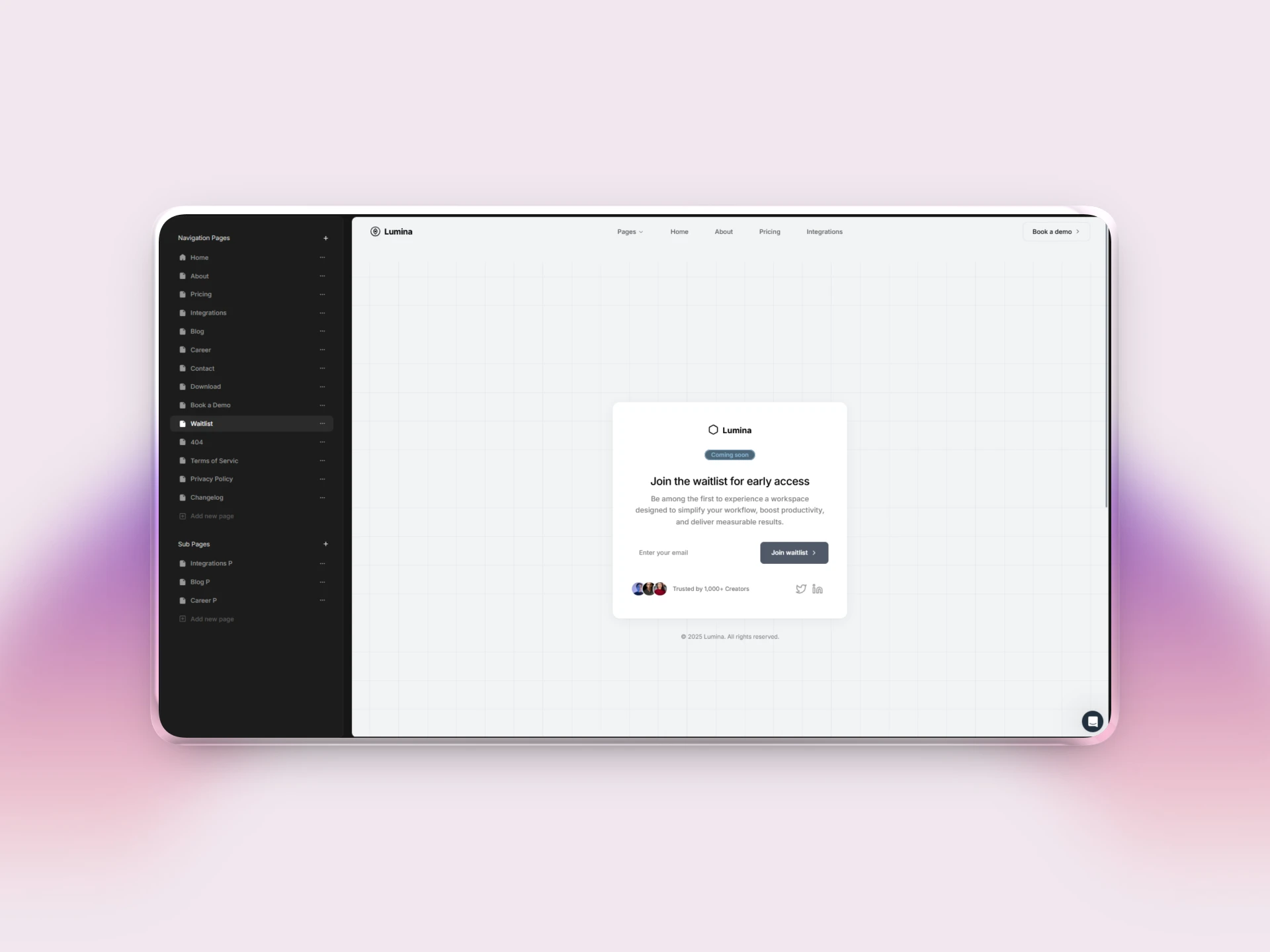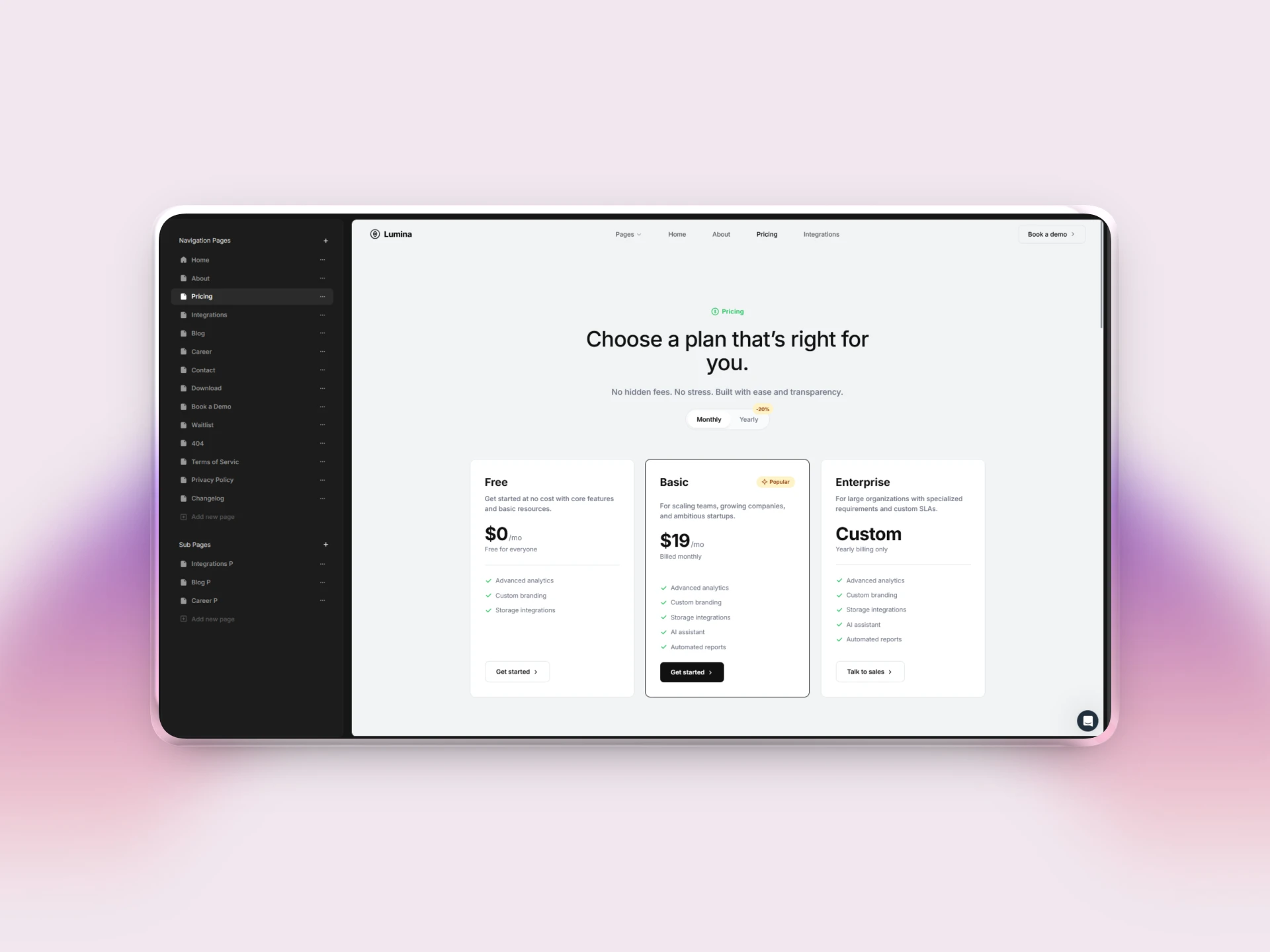 Lumina 3.0 is the strongest template out of a collection of 10 I built for Framekit, an AI website builder. It's a complete SaaS website with 14 fully designed pages — from landing page and pricing to blog, changelog, integrations, and more.