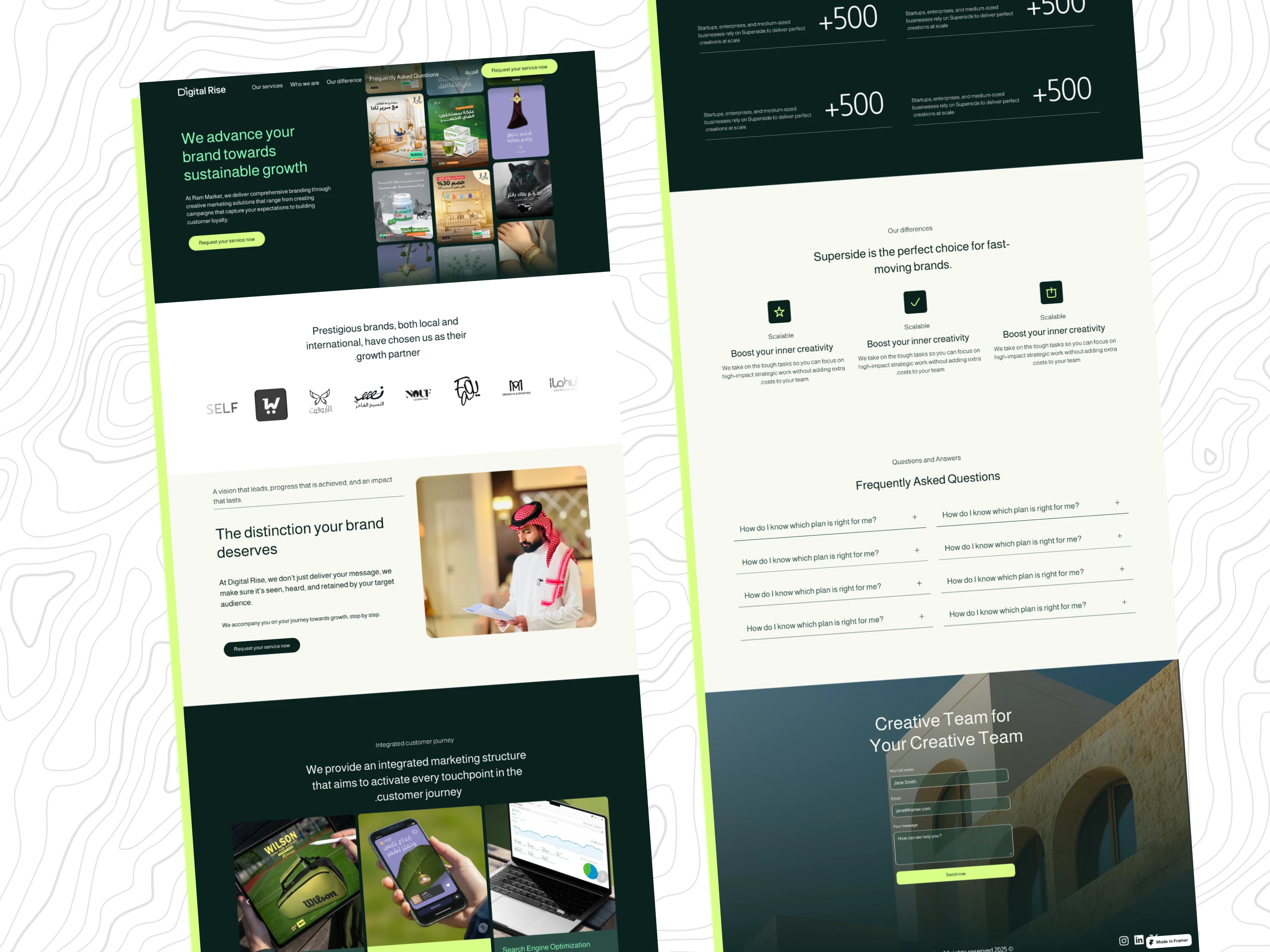 The finished Digital Rise website reflects the agency’s forward-thinking approach, visually engaging, easy to navigate, and strategically designed for conversion. With its bilingual interface and clean layout, the site positions Digital Rise as a trusted partner for ambitious brands seeking long-term marketing growth and creative distinction. Built with Framer, it ensures flexibility, speed, and scalability for future updates and campaigns.