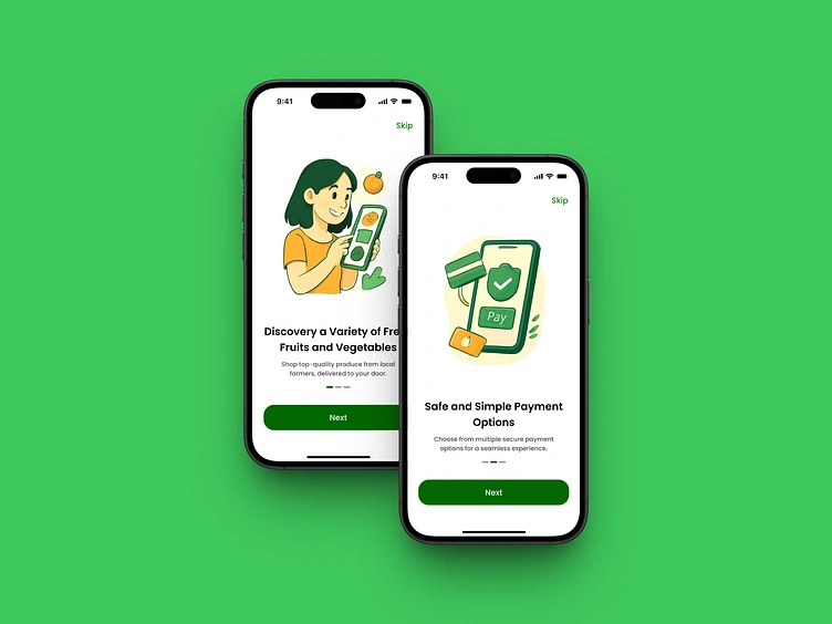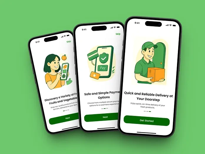 Every great experience starts with a good first impression. This three-step onboarding is built to instill confidence, one screen at a time. Starting with product discovery, then moving into payment flexibility, and finally highlighting the speed of delivery, the flow reflects what users value most: simplicity, security, and speed. We intentionally used soft illustration styles and familiar gestures to ease the learning curve. Combined with bold headlines and compact copy, each message lands quickly, just like your order will.