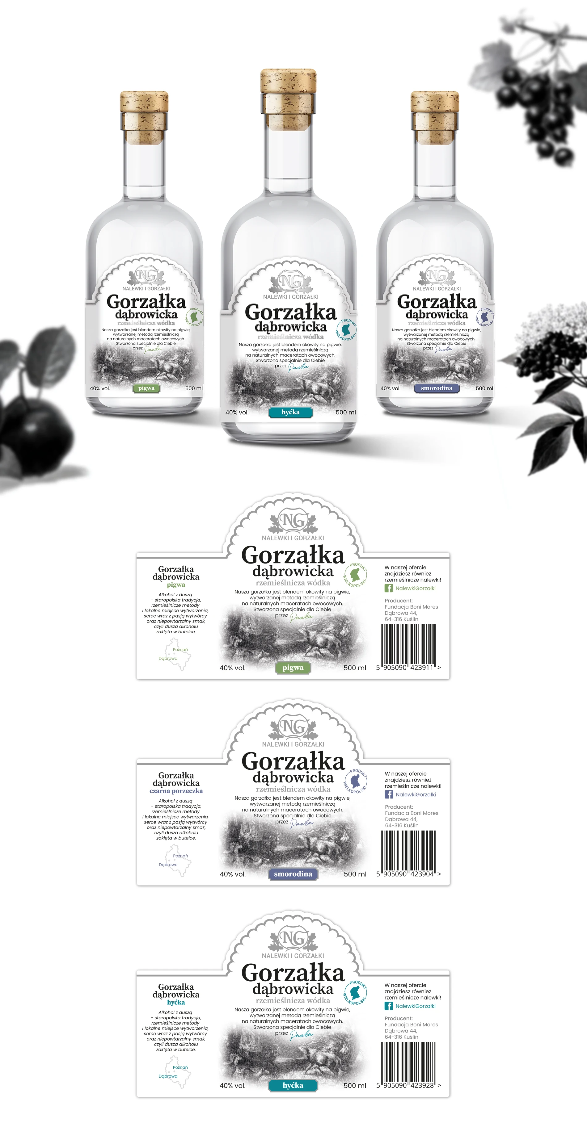 I was commissioned to design the label for a small-batch craft vodka brand. The product’s name includes a reference to its origin — Dąbrowa, a village near Poznań, Poland. Since the vodka is produced in a forest where deer and roe deer are commonly seen, these animals naturally became a key visual element of the packaging. The vodka is made using traditional, artisanal methods. Each spirit is a unique blend of okowita (a Polish-style eau-de-vie) infused with natural fruit macerates. Every batch is crafted by the owner himself, and each label features a handwritten-style signature stating that this drink was made especially for you. The label also clearly communicates the product’s regional origin, proudly highlighting its Polish roots. To emphasize the premium nature of the vodka, the label was enhanced using multiple printing techniques: silver hot stamping, embossed lettering, and high-quality textured paper — all carefully selected to reflect the craftsmanship and authenticity behind the product.