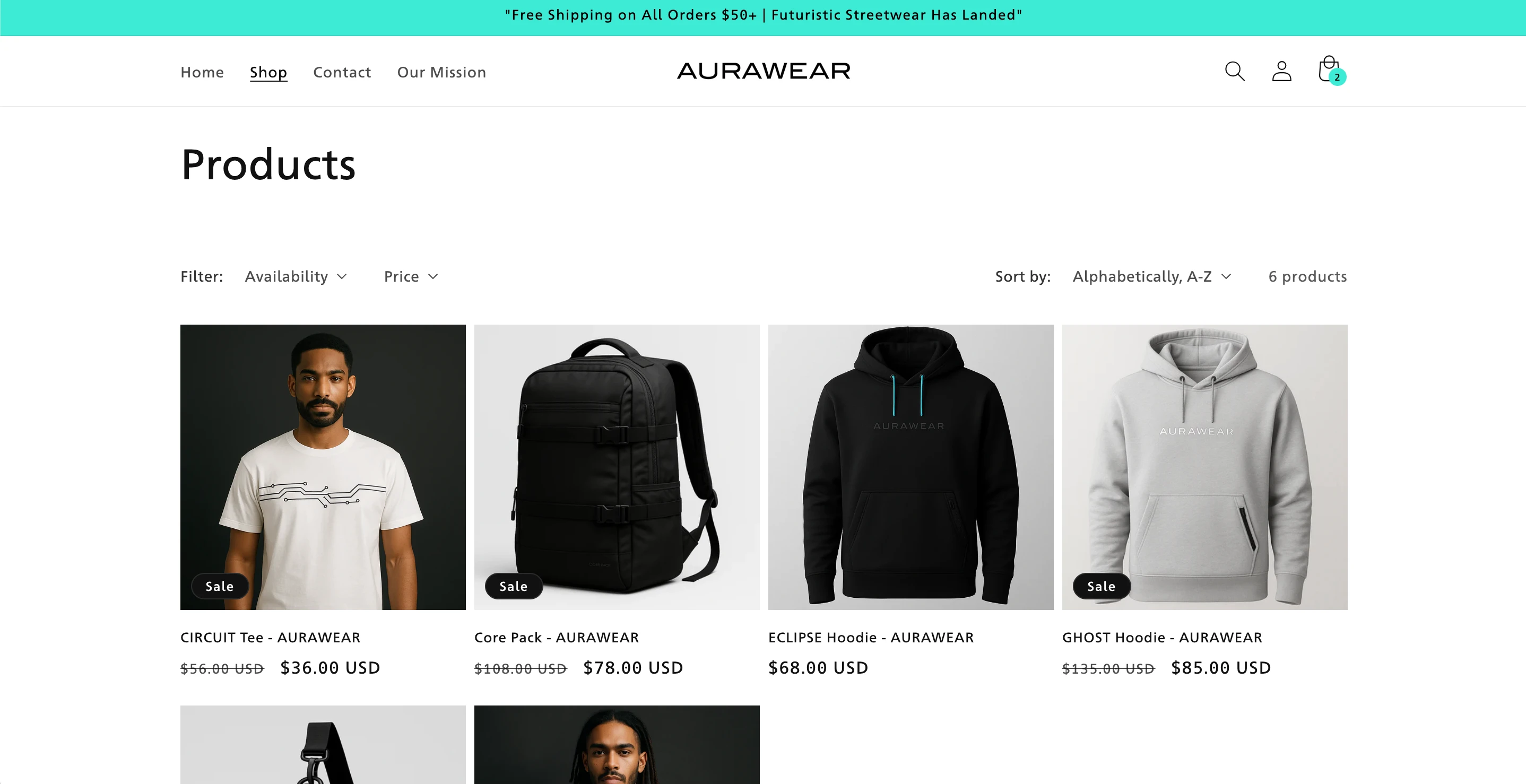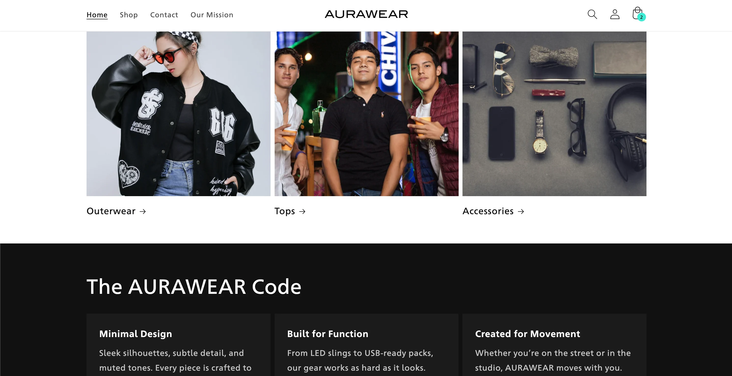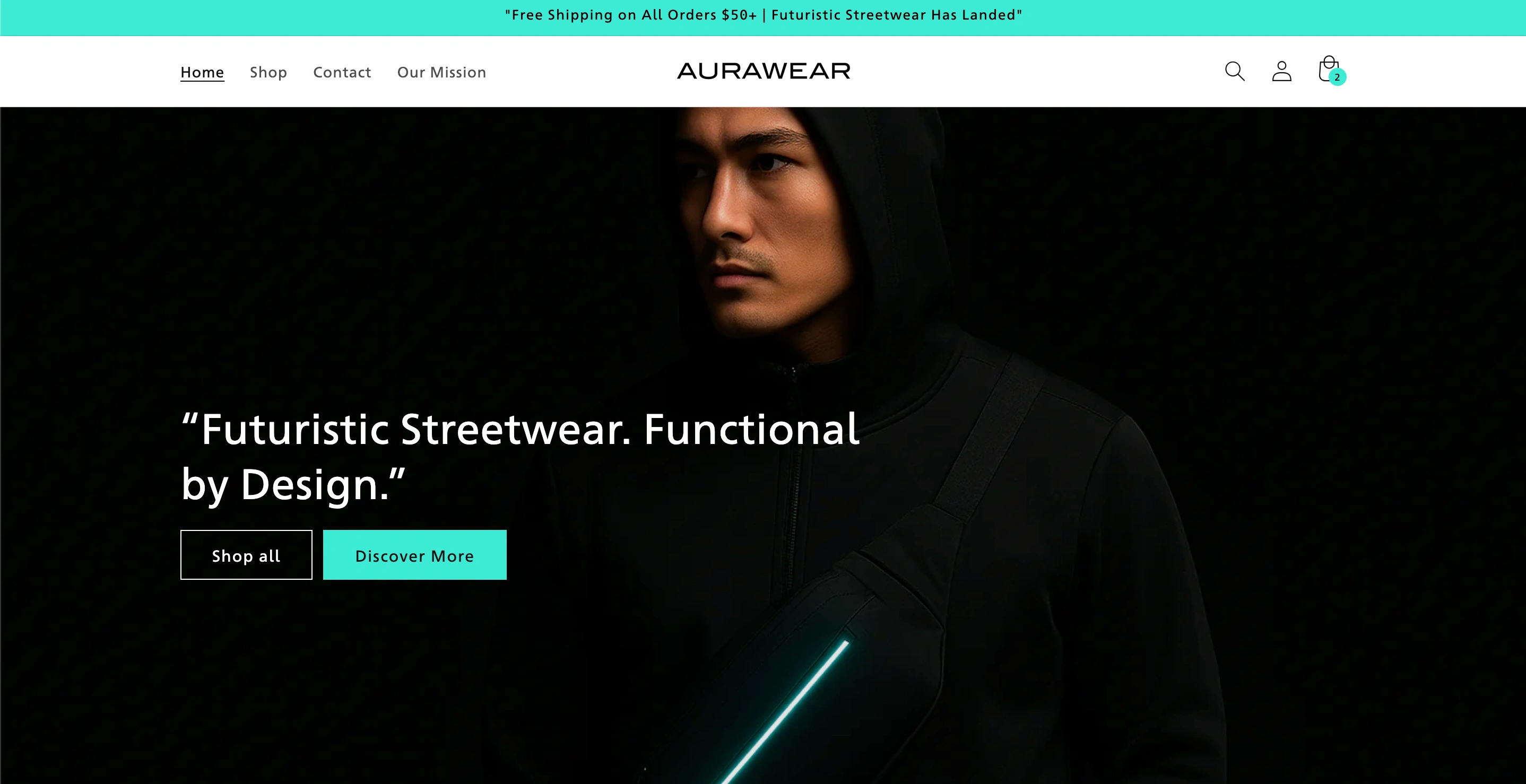 Aurawear is a bold streetwear brand focused on tech-inspired fashion. I designed and launched a custom Shopify store that blended structure with their vision.