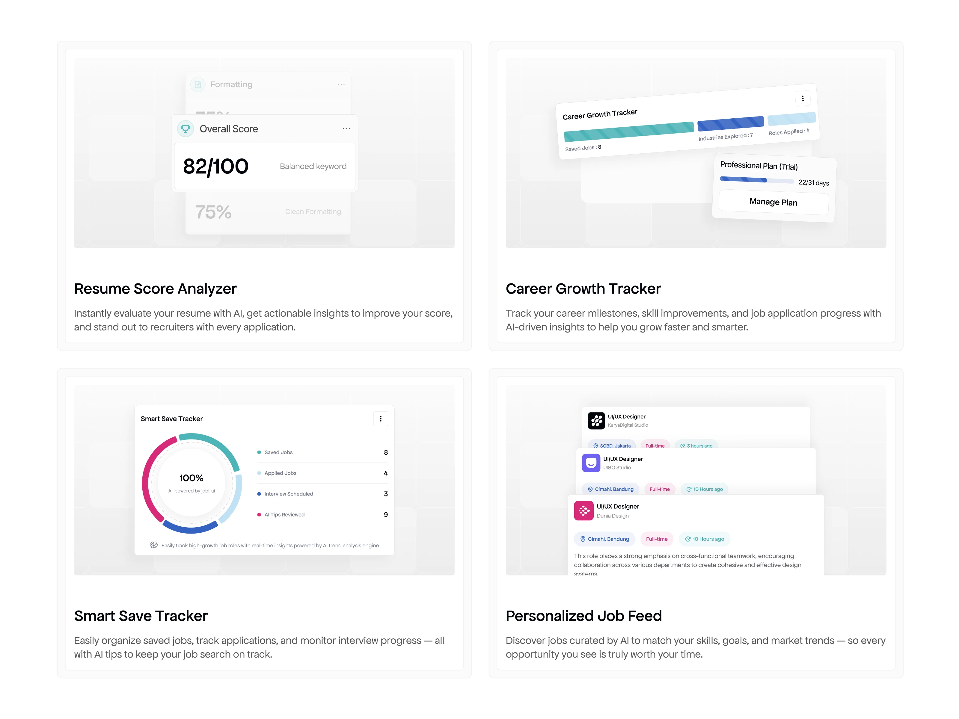 Joobin job seeker bento UI. A modular grid system designed to provide a clear, organized overview of profile metrics and career application activities.