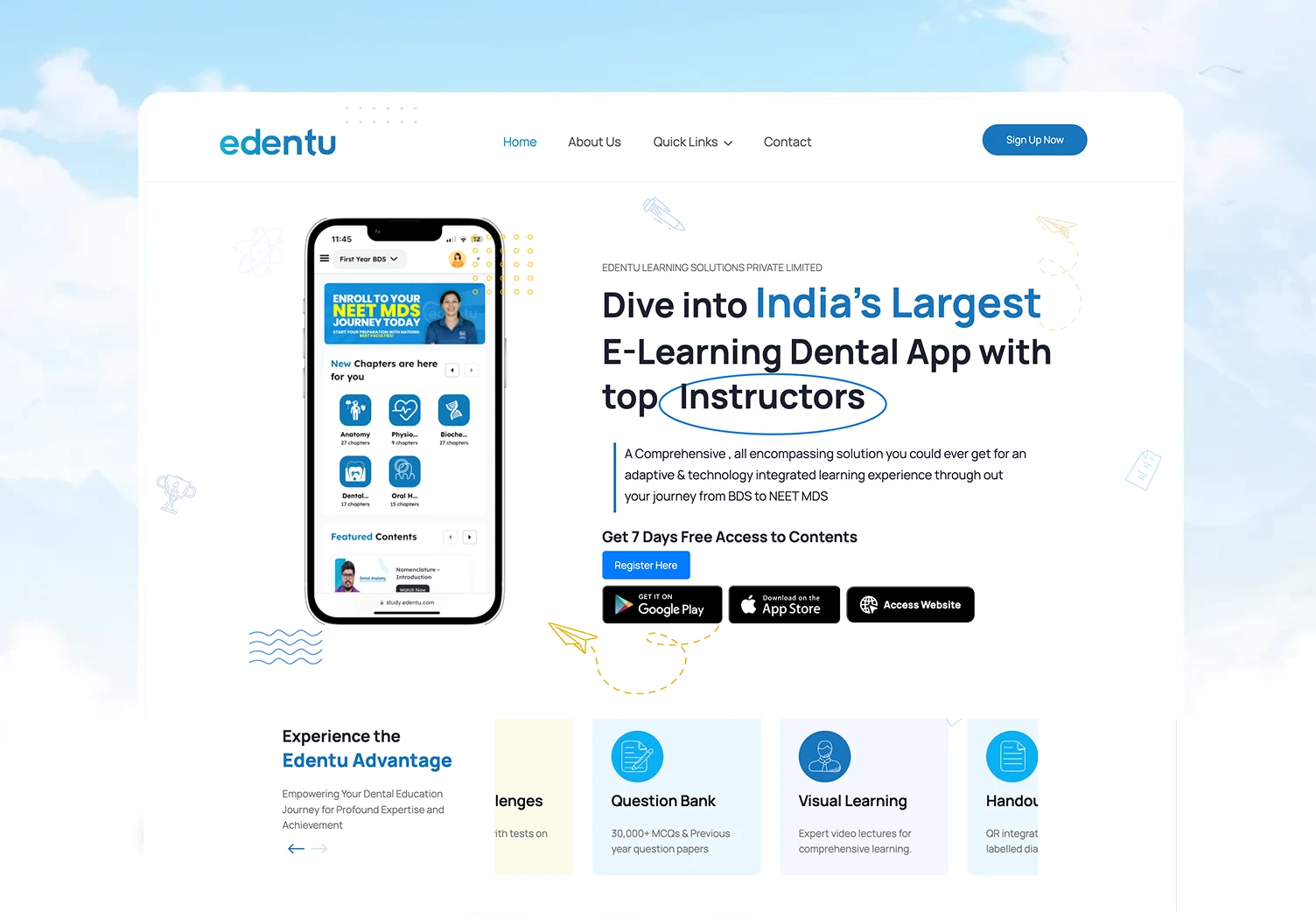 Edentu is India’s largest e-learning dental app, crafted to empower dental students with an adaptive, tech-driven platform that covers every step from BDS to NEET MDS. With 30,000+ MCQs, curated study materials, expert instructors, and engaging video content accessible on mobile, Edentu delivers a streamlined solution to help students master the dental curriculum, revise efficiently, and gain confidence for exams. The project focused on creating an intuitive, modern user experience and bringing powerful mentorship support to students everywhere, making quality dental education accessible, interactive, and personalized