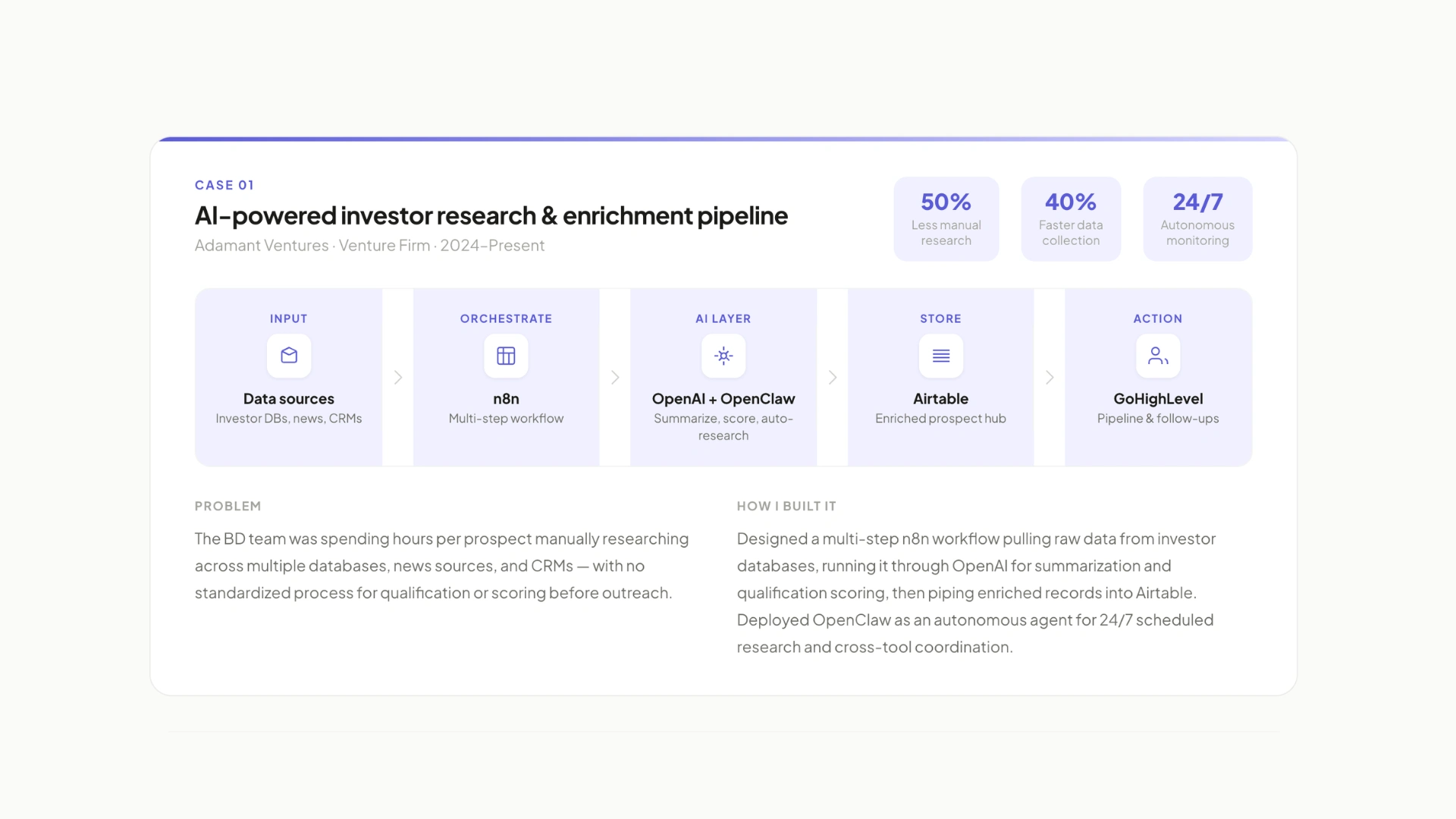 I mapped out the full research-to-outreach pipeline and identified every manual step that could be automated. From there, I designed a multi-step n8n workflow that pulls raw prospect data from investor databases, cross-references it with CRM records, and sends it to the OpenAI API for automated summarization, qualification scoring, and categorization.