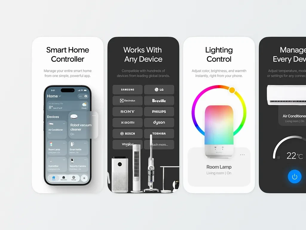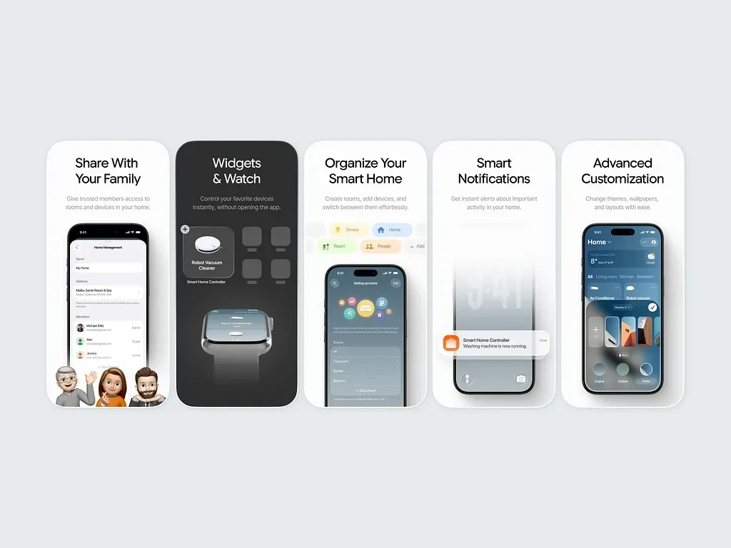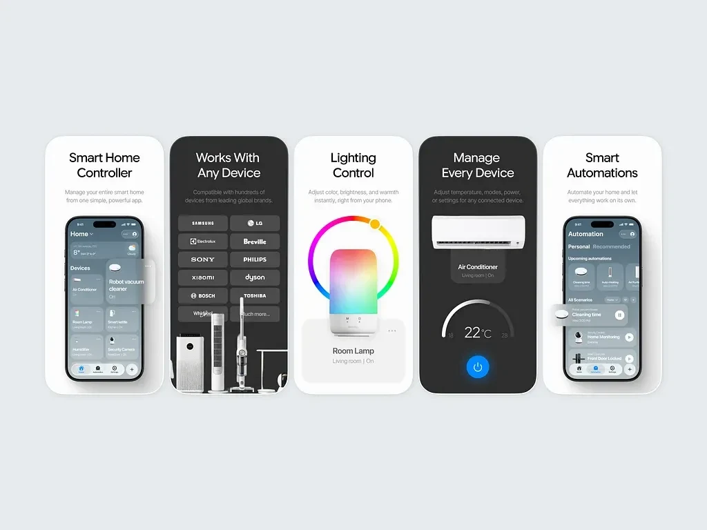 Each screen follows a clear narrative, moving from core controls to more advanced features in a natural, readable flow. The restrained color palette, soft contrasts, and minimal visual accents support clarity and consistency, allowing the interface to feel reliable, familiar, and easy to live with.