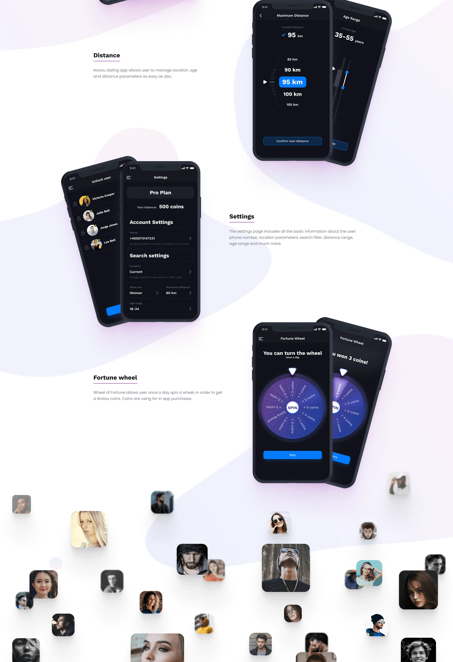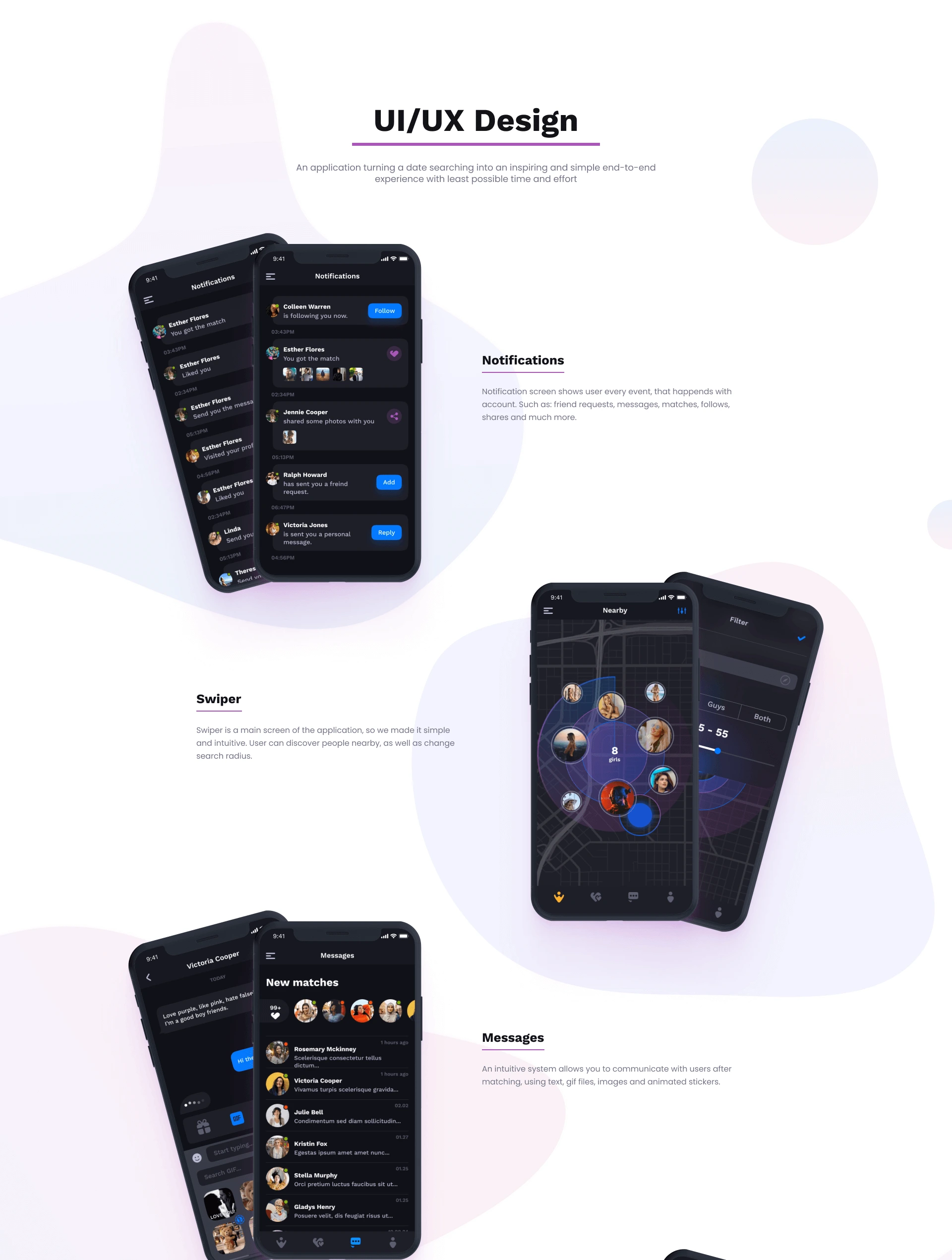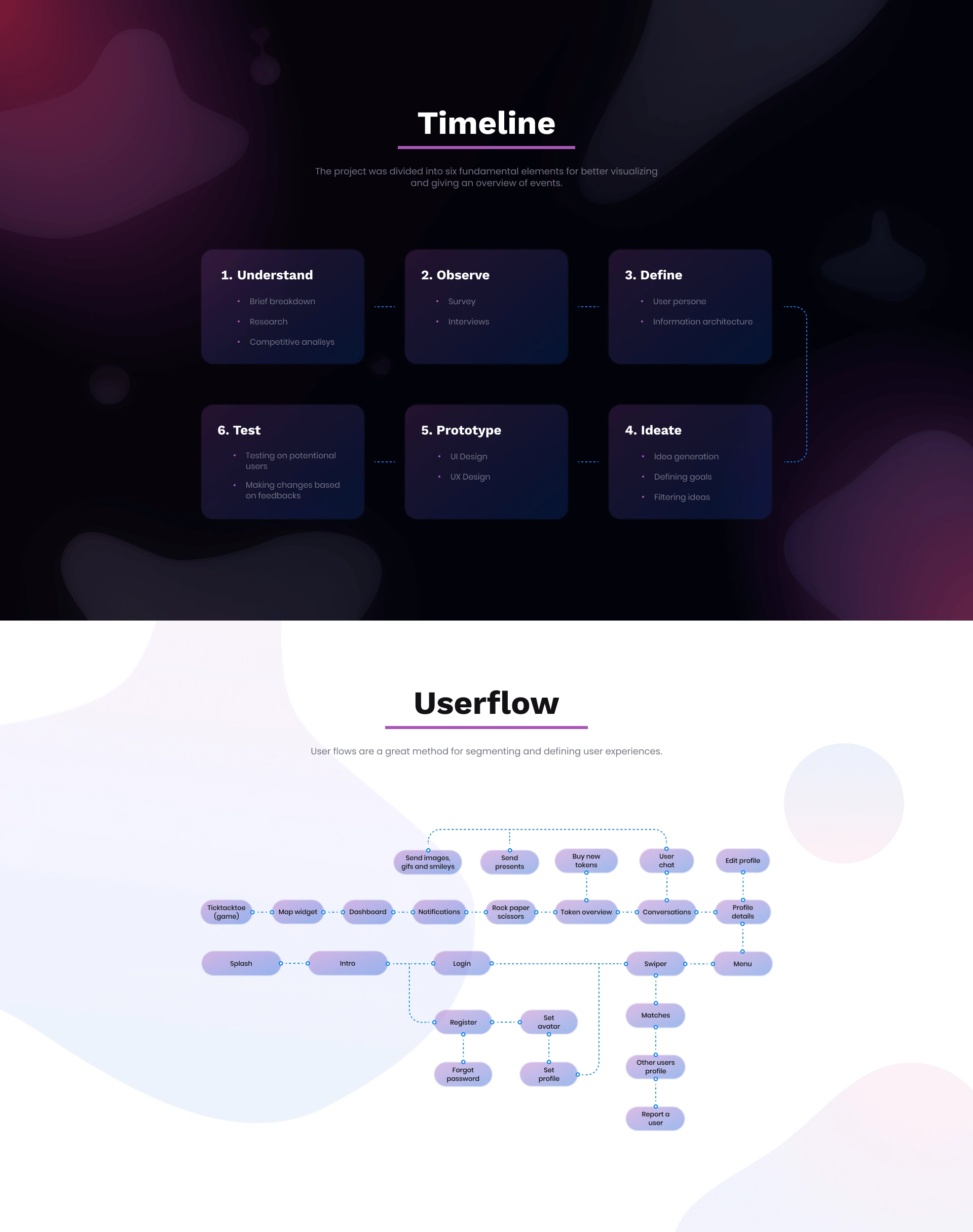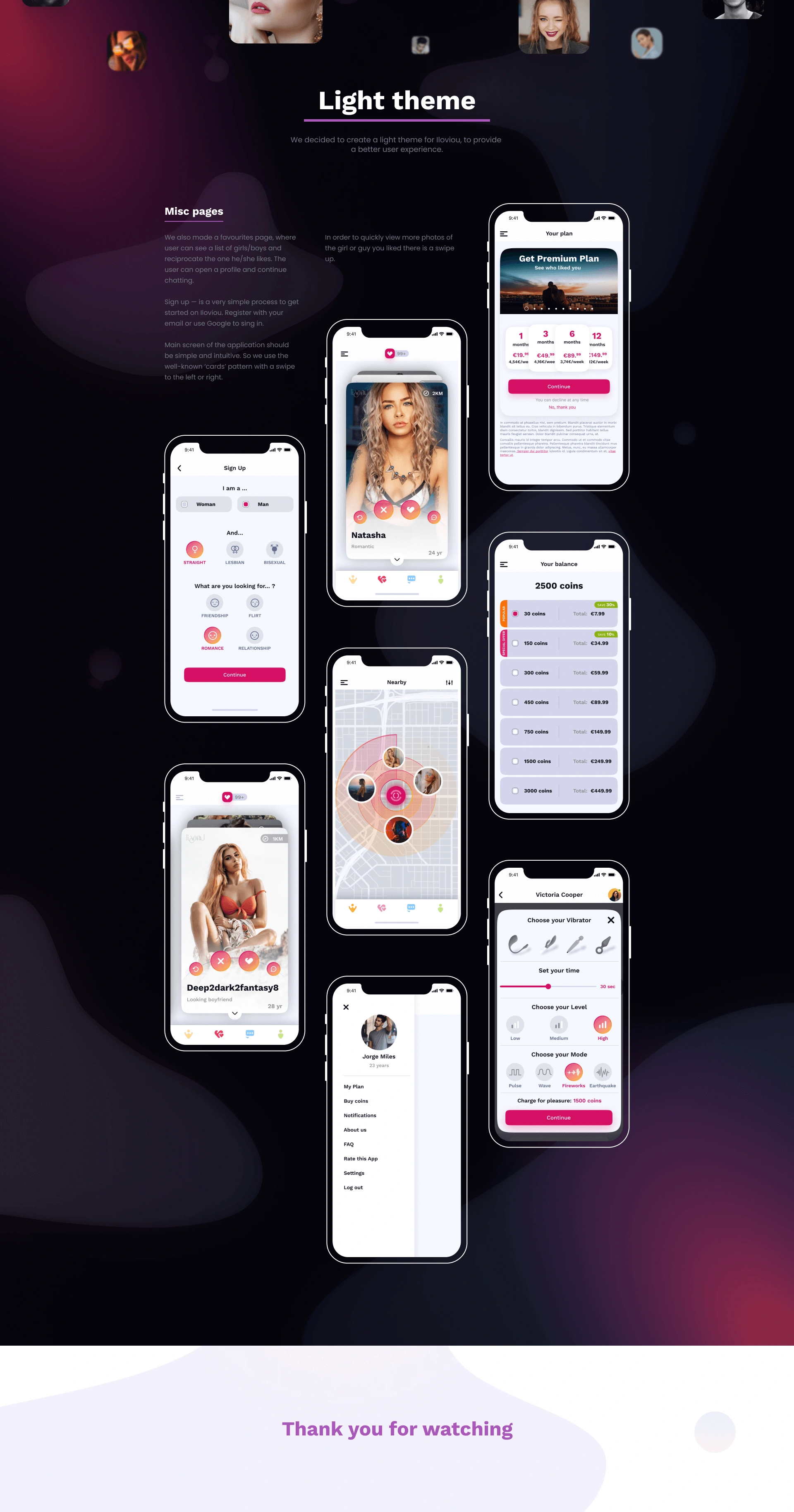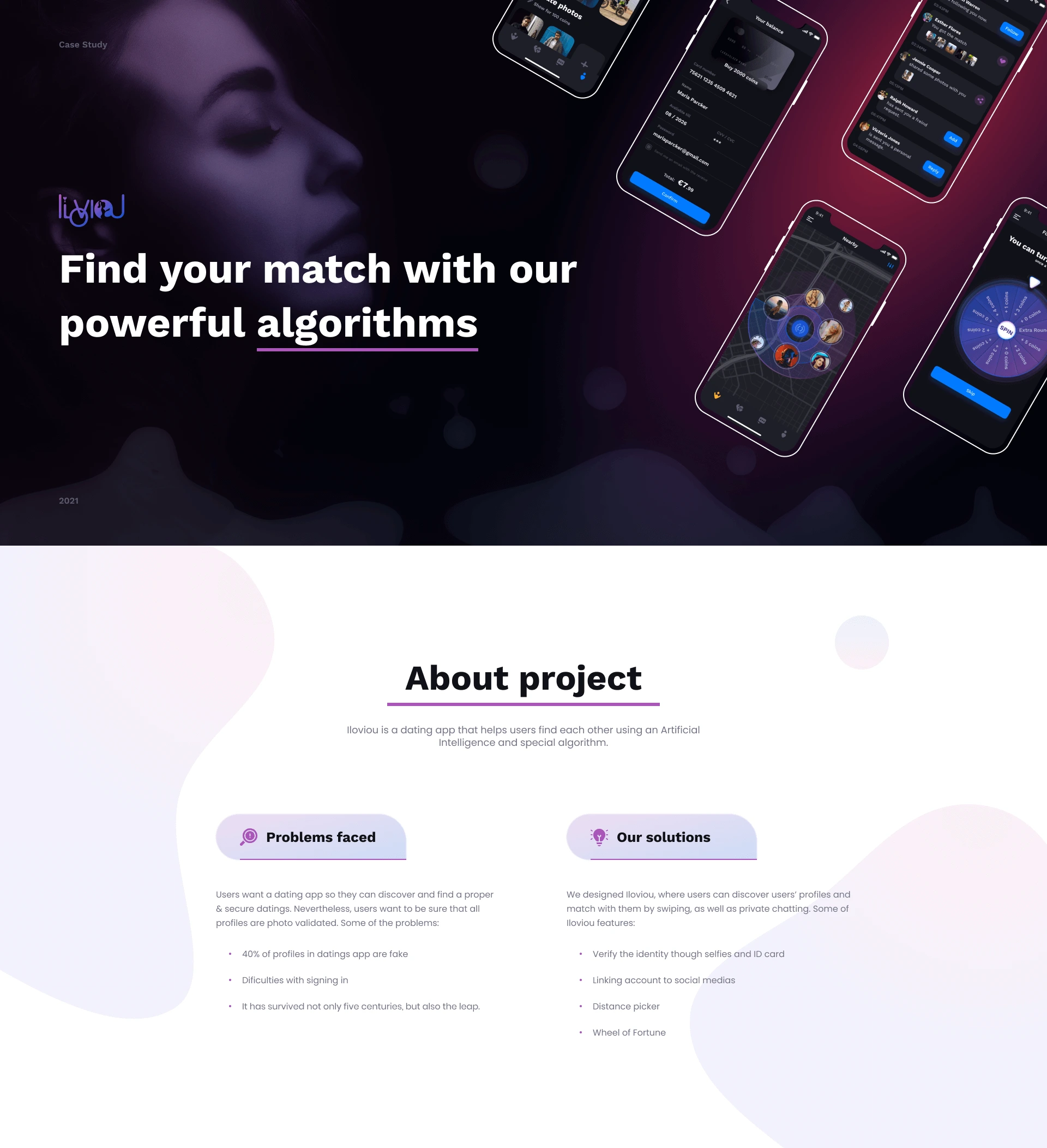 bout project Iloviou is a dating app that helps users find each other using an Artificial Intelligence and special algorithm. Problems faced Users want a dating app so they can discover and find a proper & secure datings. Nevertheless, users want to be sure that all profiles are photo validated. Some of the problems: -40% of profiles in datings app are fake -Dificulties with signing in -It has survived not only five centuries, but also the leap. Our solutions We designed Iloviou, where users can discover users’ profiles and match with them by swiping, as well as private chatting.
