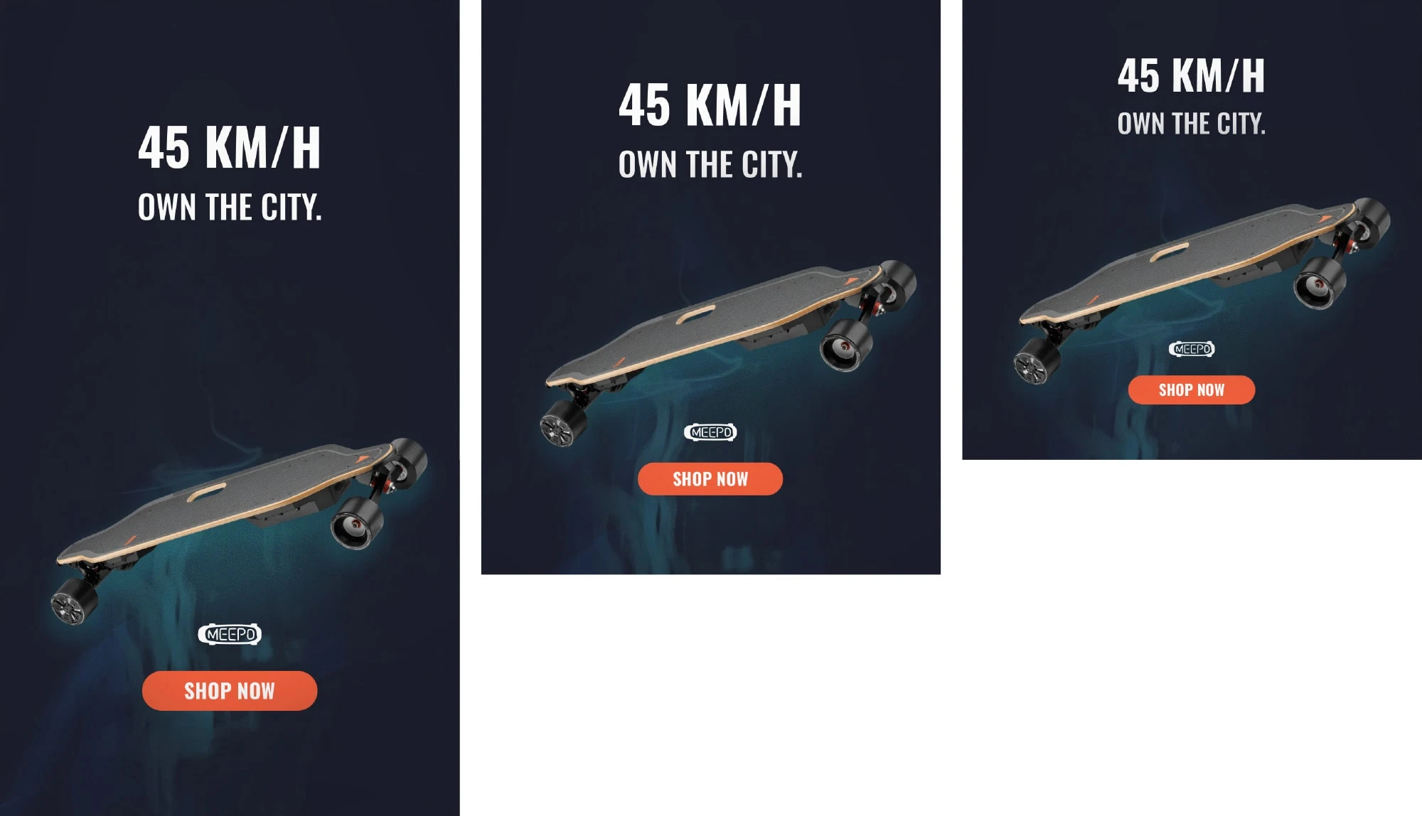 Clarity over Complexity: For Meepo, the brief was open-ended. Instead of focusing on multiple features, the creative isolates a single, aggressive sensory hook: Speed. "45 KM/H. OWN THE CITY." This cuts through feed noise by appealing directly to the core desire of the electric skateboard demographic—power and urban dominance.