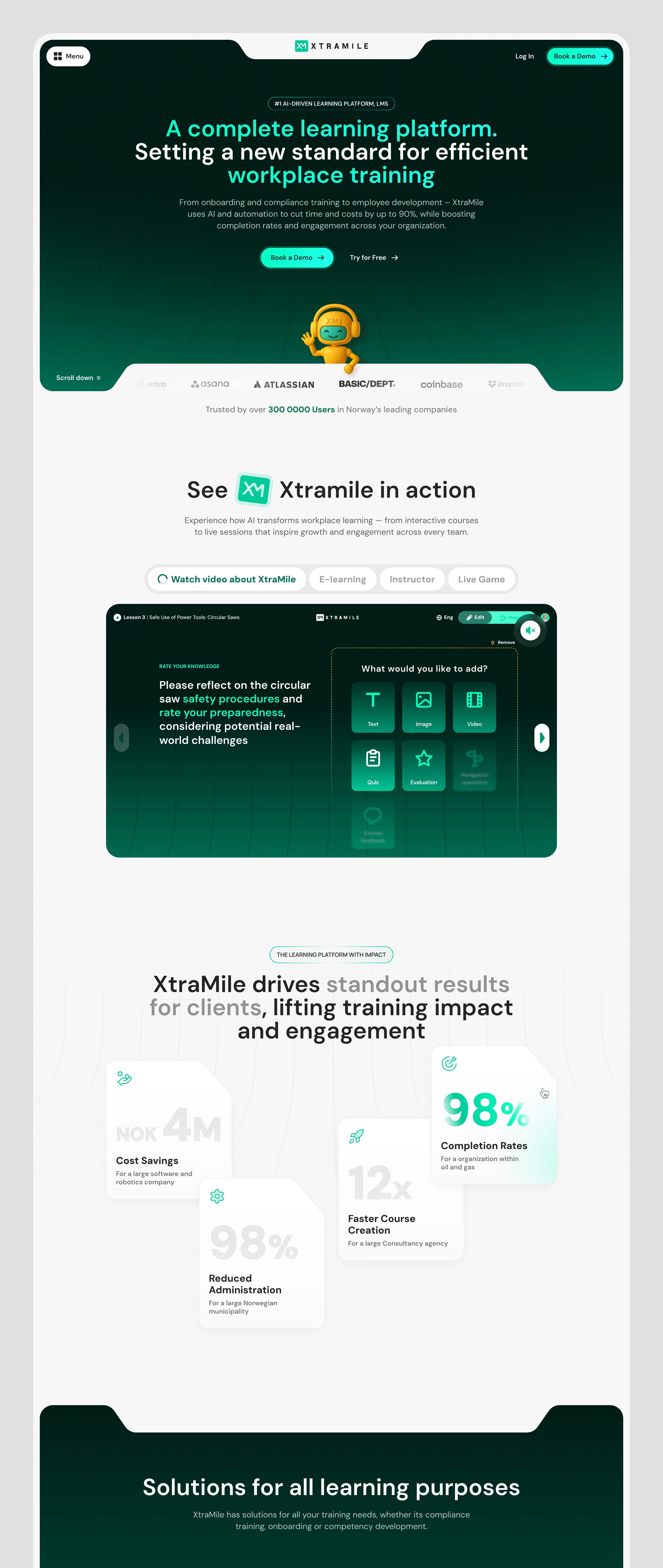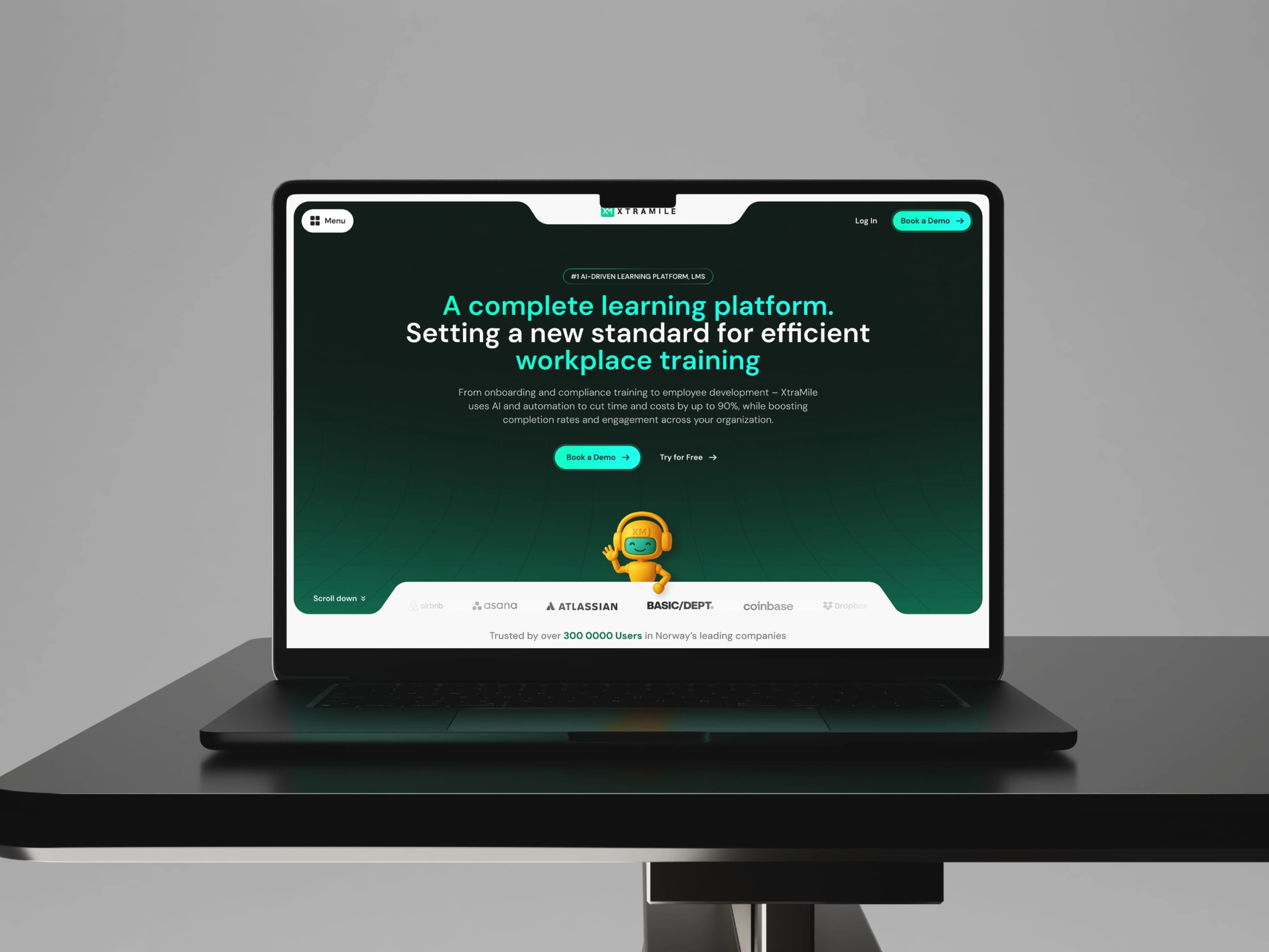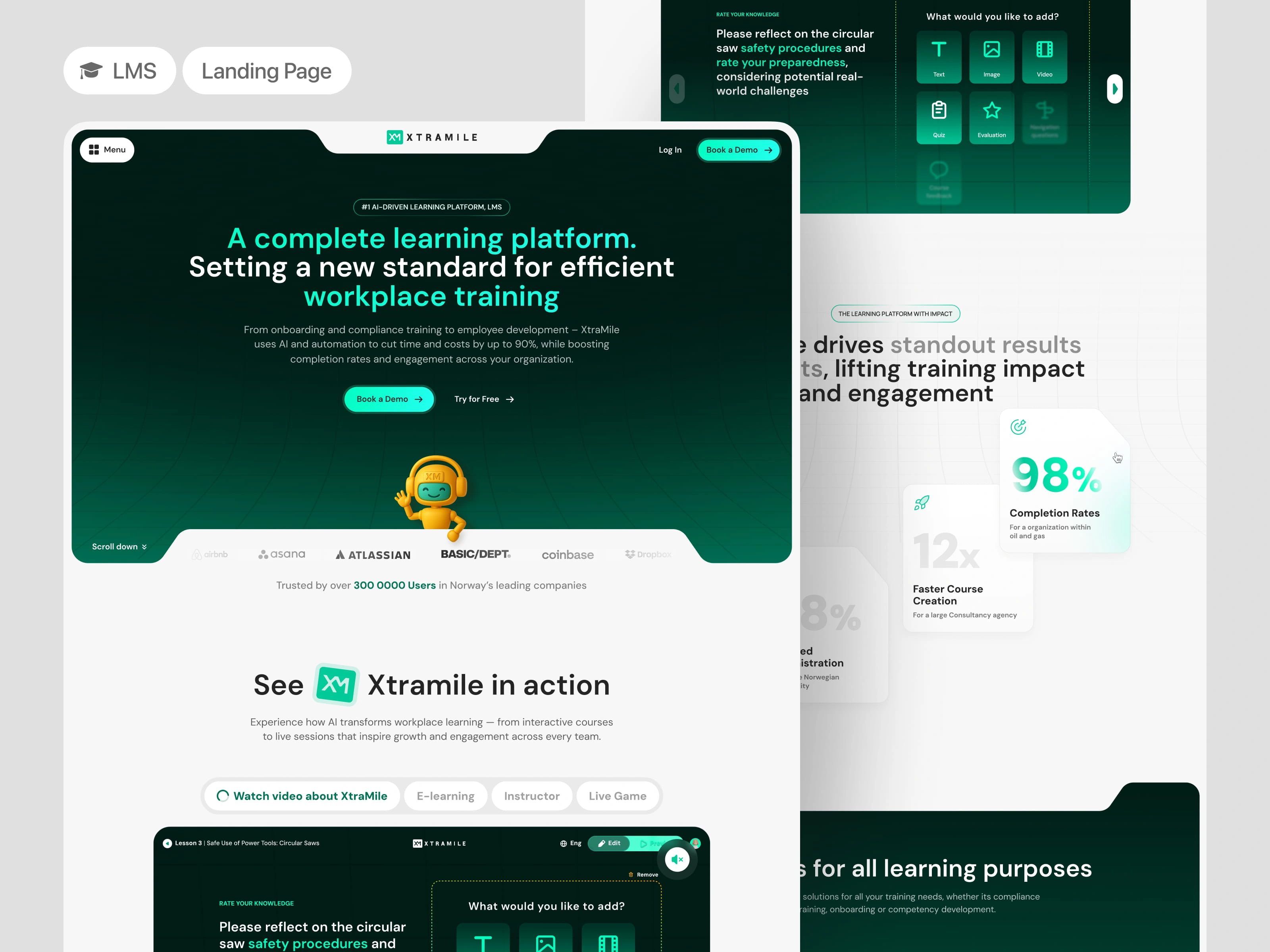 AI-powered LMS landing page designed for modern employee training and workplace learning. The interface focuses on clear value proposition, AI-driven content creation, role-based training paths, and performance insights, wrapped in a clean dark UI suitable for scalable SaaS products.
