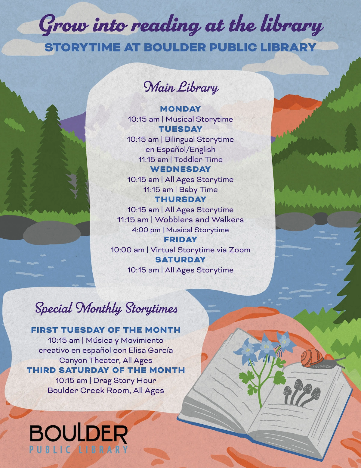 The project scope was to design a joyful campaign for the Boulder Public Library's storytimes. The project deliverables included printable posters and bookmarks, all with a consistent look and feel, designed for caregivers of children aged 0-5.