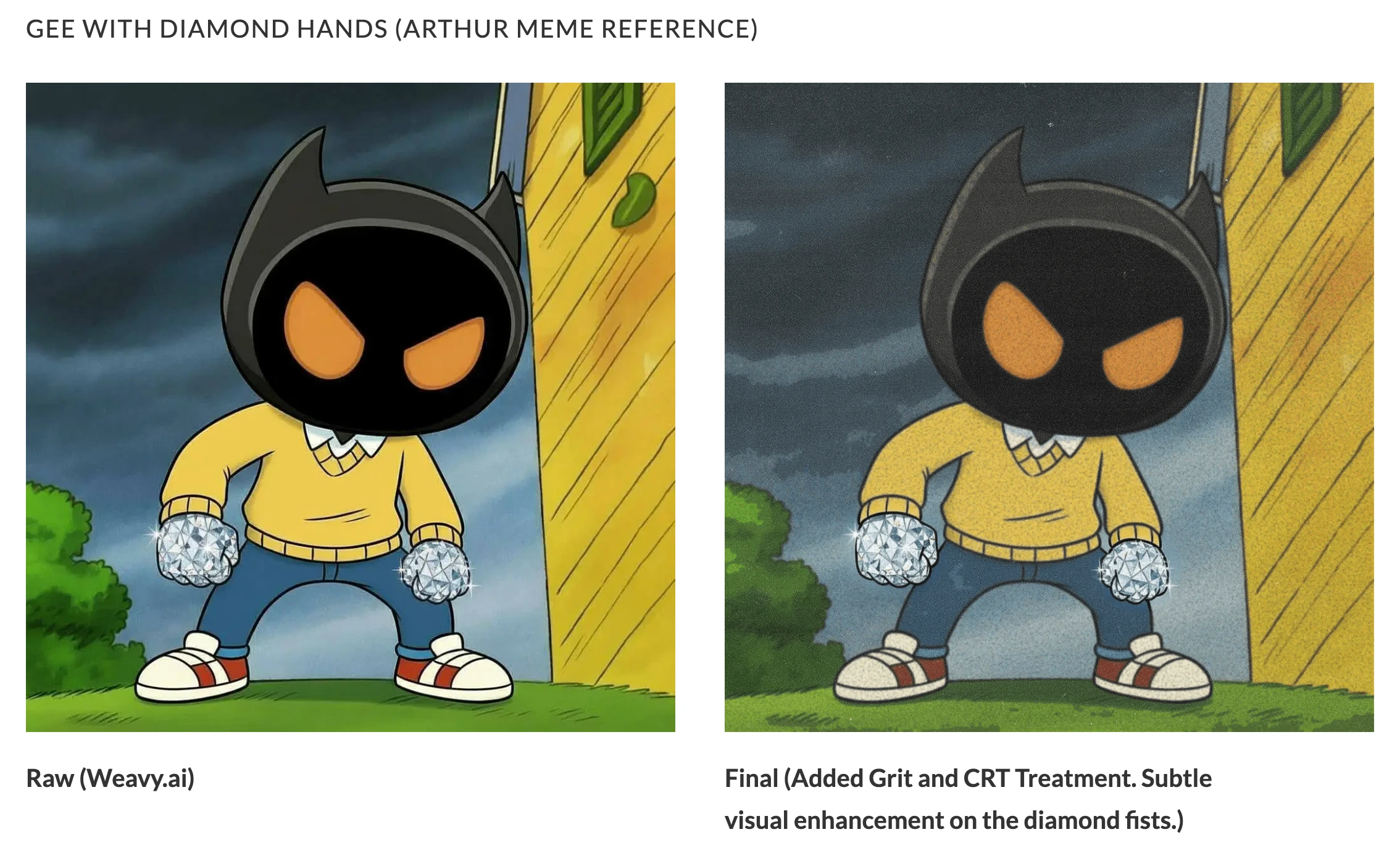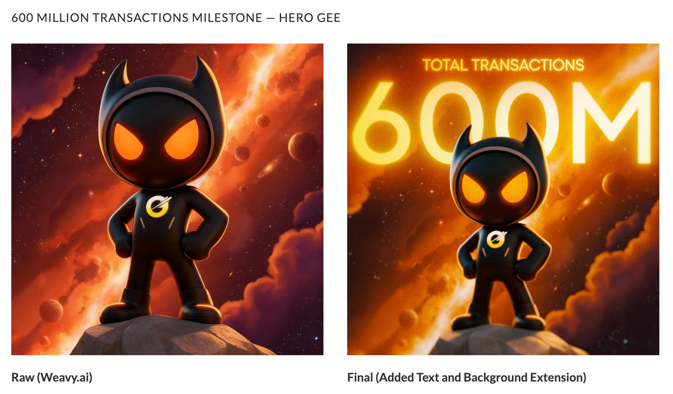 As part of Galxe’s Gravity ecosystem, Gee serves as the community-facing mascot used across branding moments, announcements, and cultural drops. My role was to evolve Gee’s visual range using AI, enabling the character to appear in more expressive and cinematic scenarios without compromising the established design language.