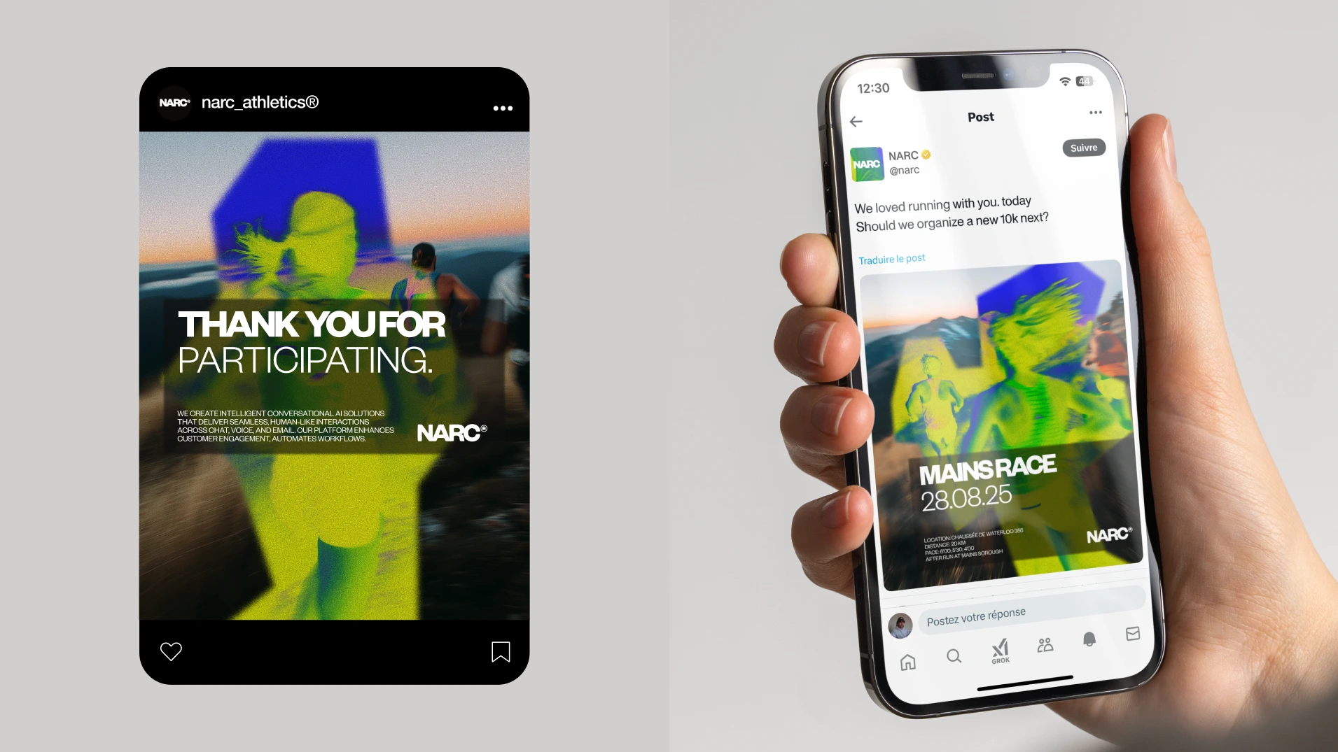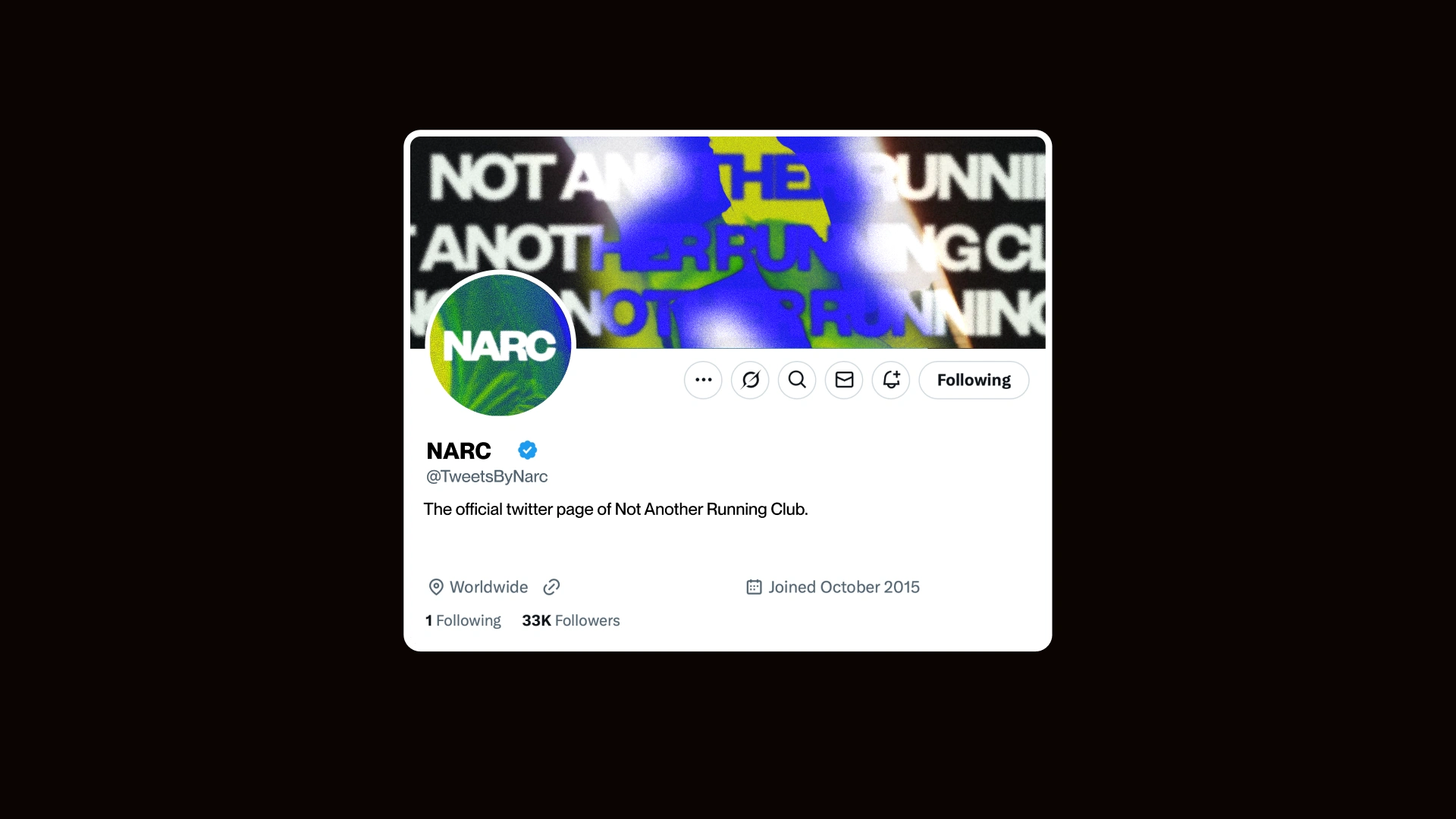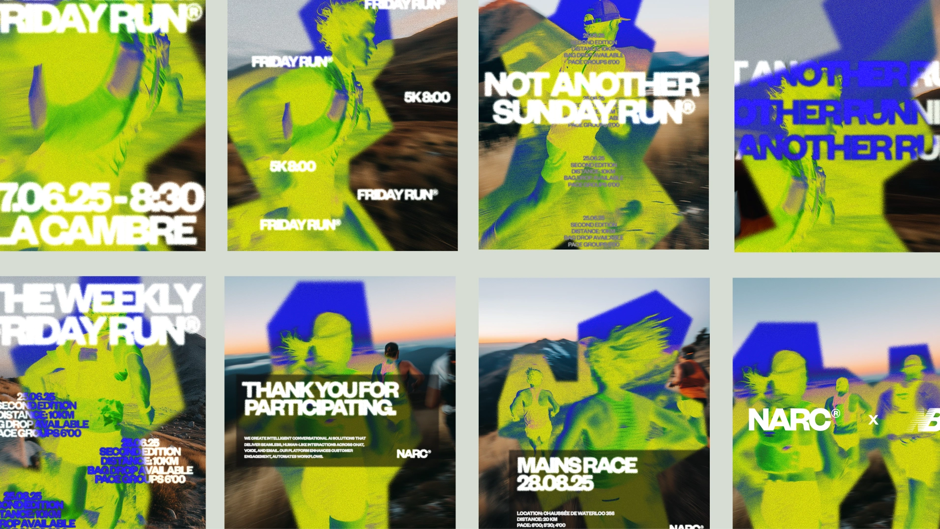 Not Another Running Club (NARC) is a personal project that allowed me to experiment and push the boundaries of what a running club can be. The mission for its identity was to stand out in a crowded space while being adaptable for both physical applications, such as events and print materials, and digital channels for social media campaigns.