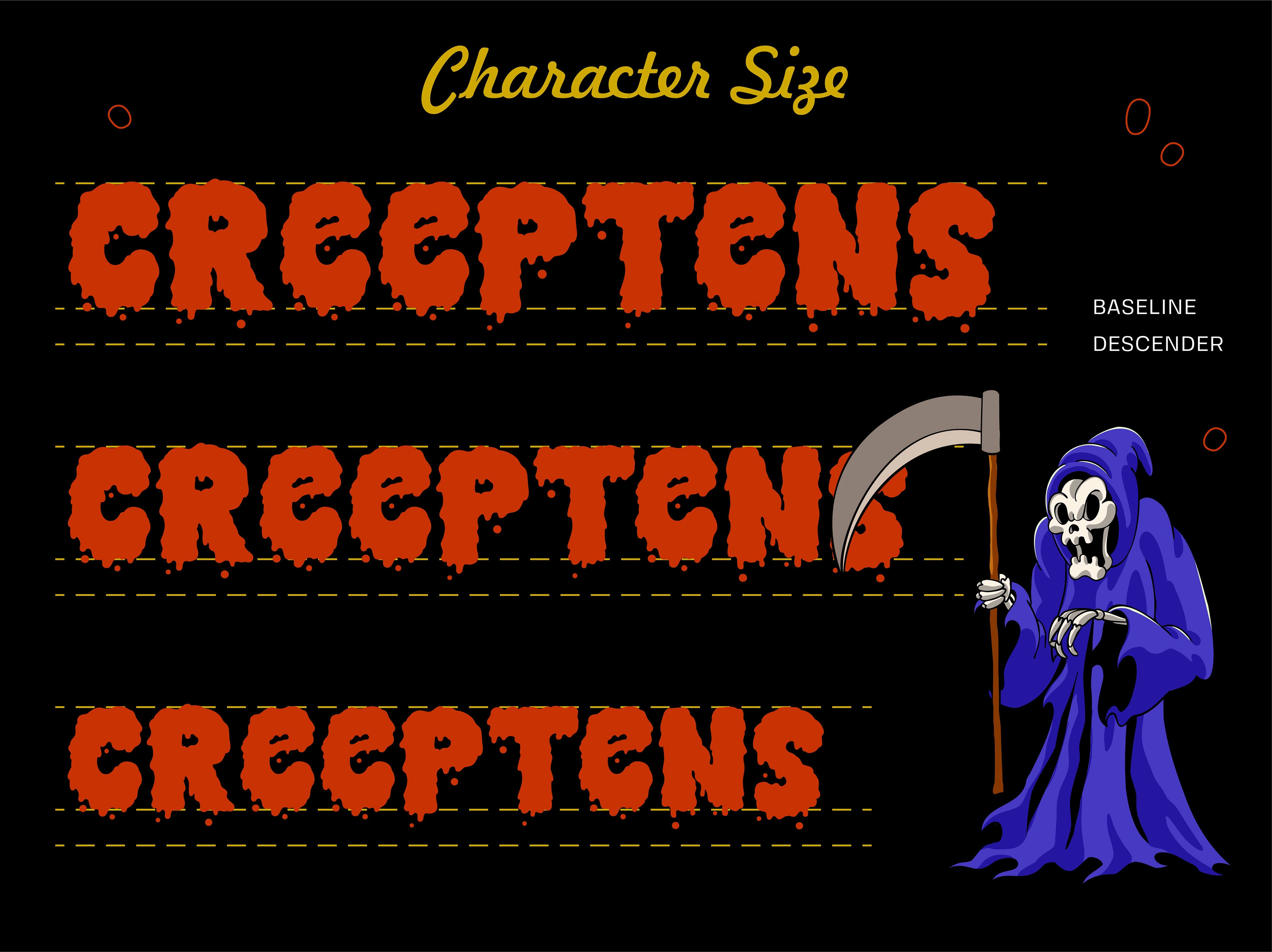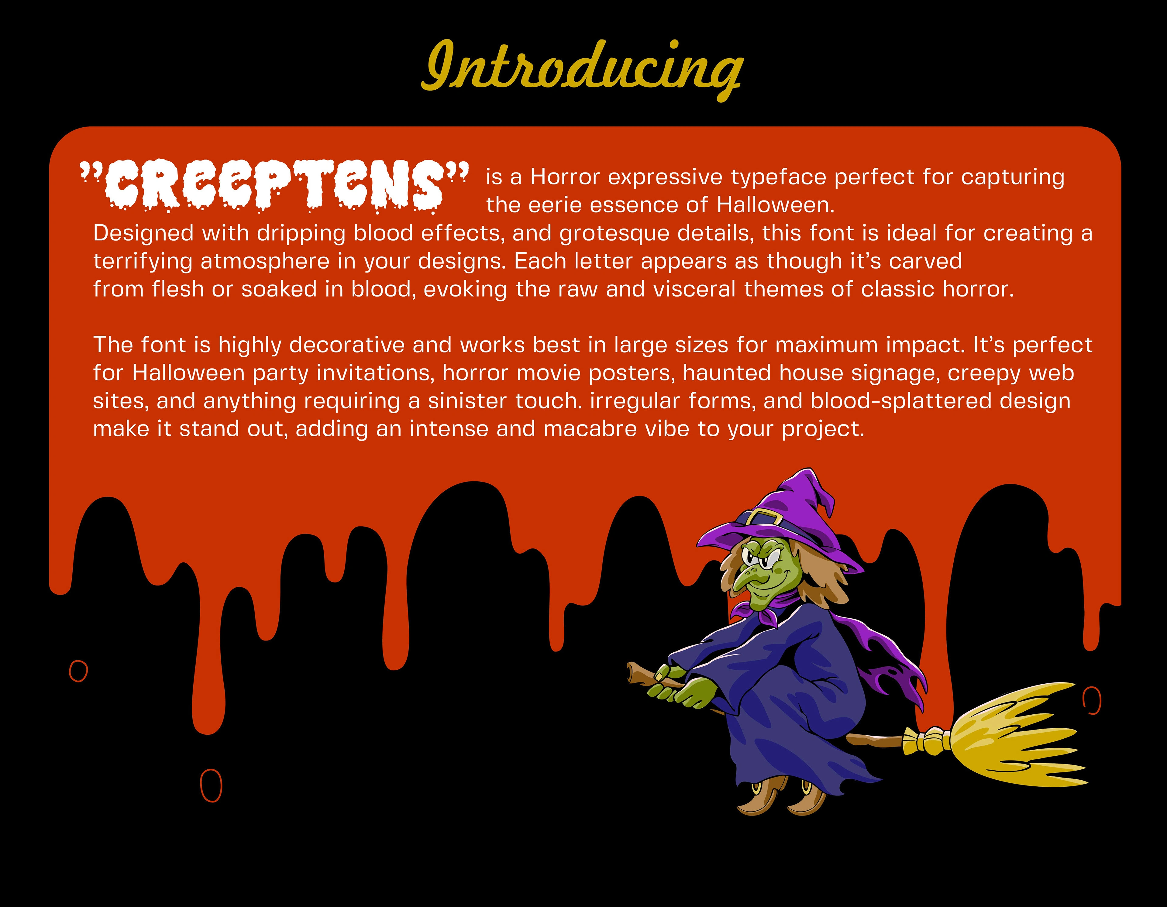 Creeptens is a Horror expressive typeface perfect for capturing the eerie essence of Halloween. Designed with dripping blood effects, and grotesque details, th…