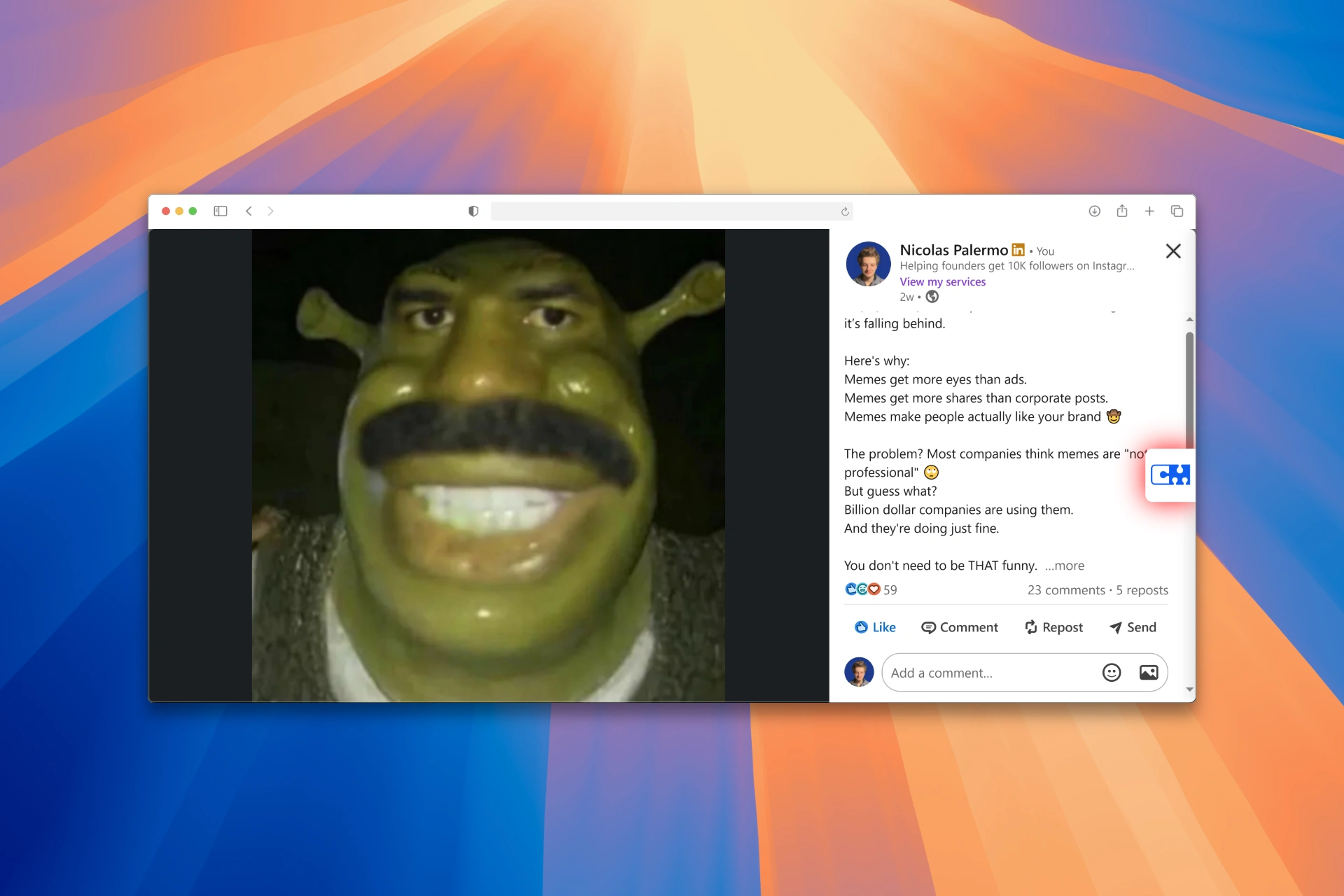 I broke LinkedIn's unspoken social contract. No humble brags. No inspiration porn. Just a simple message: Your brand should be memeing, and here's why you're scared to do it.