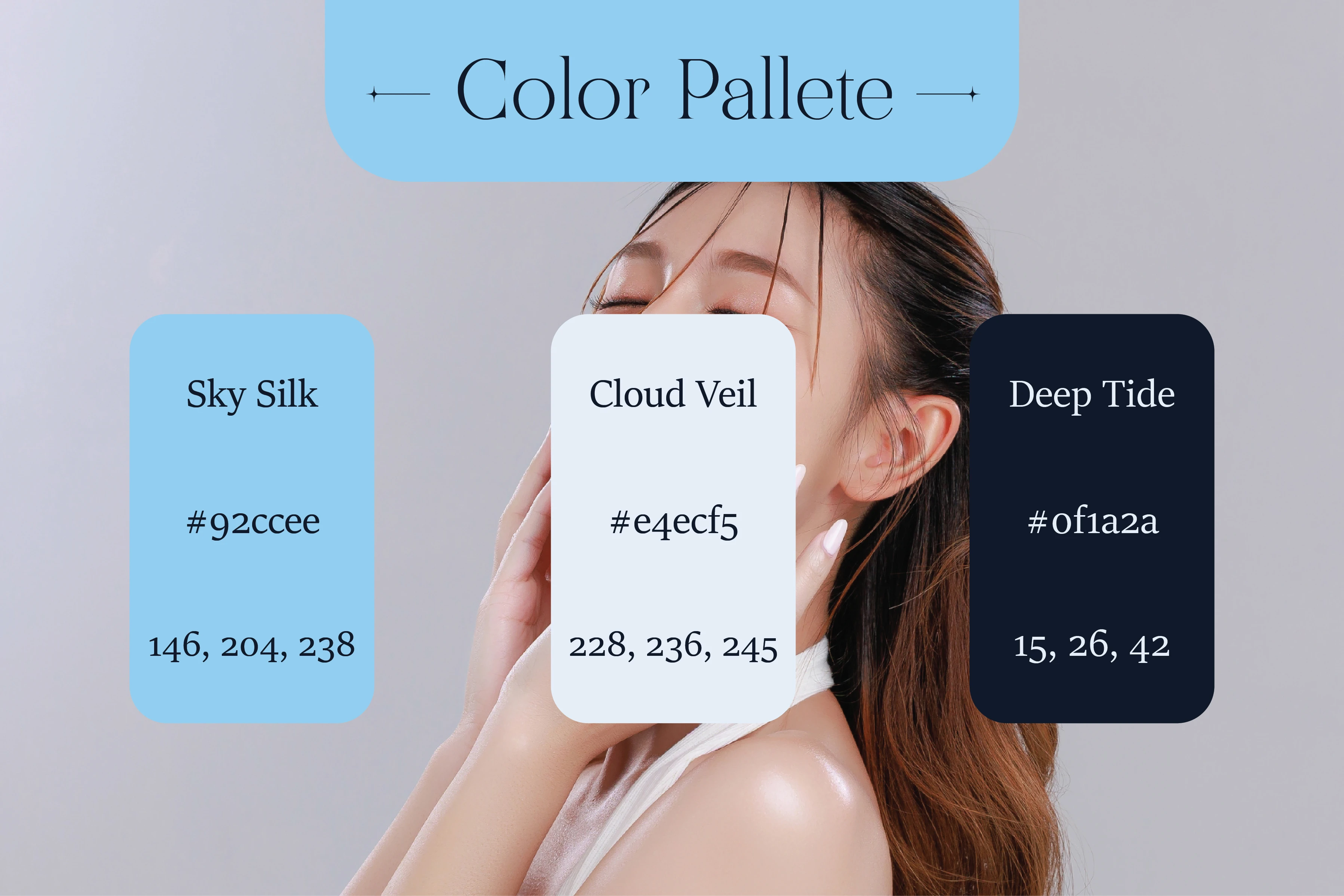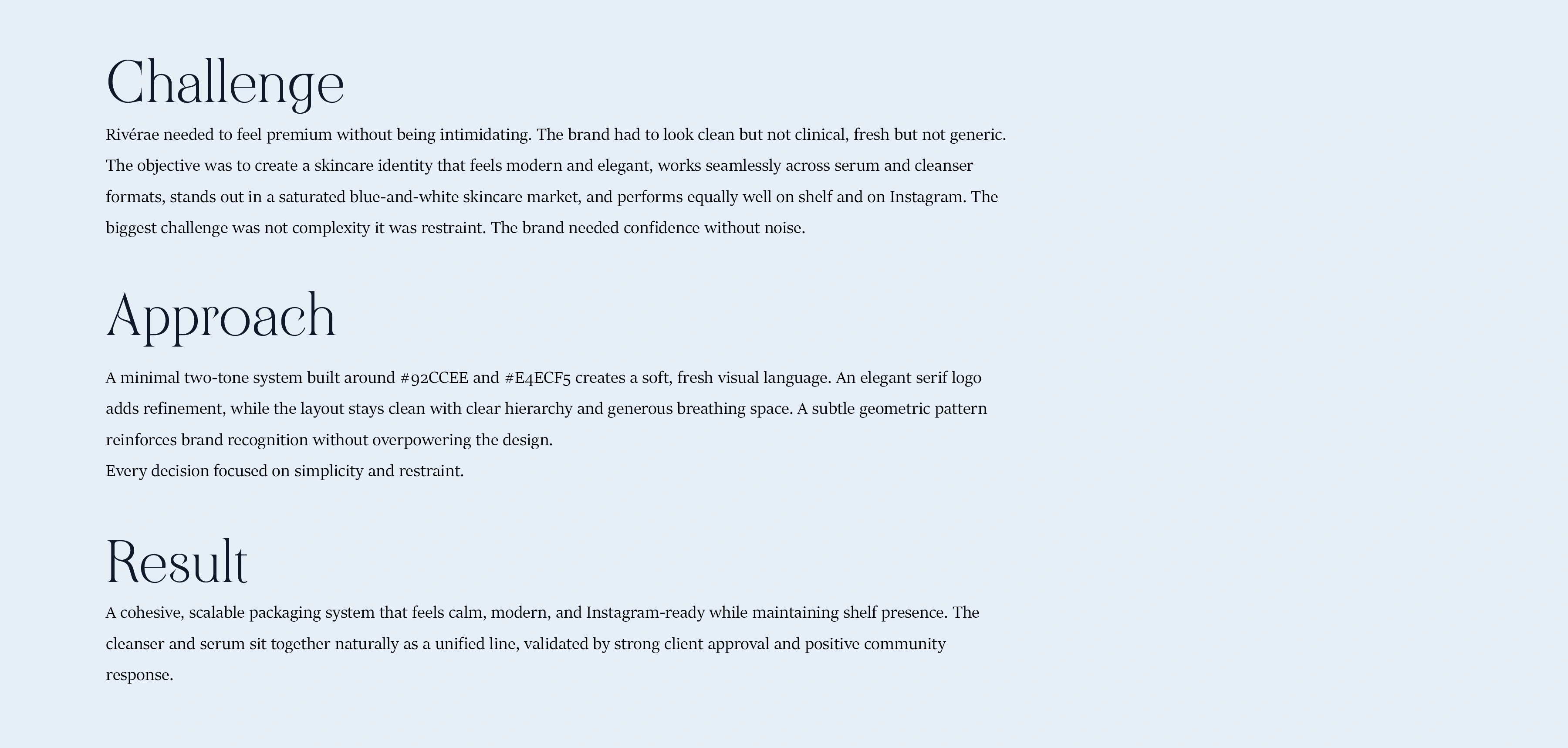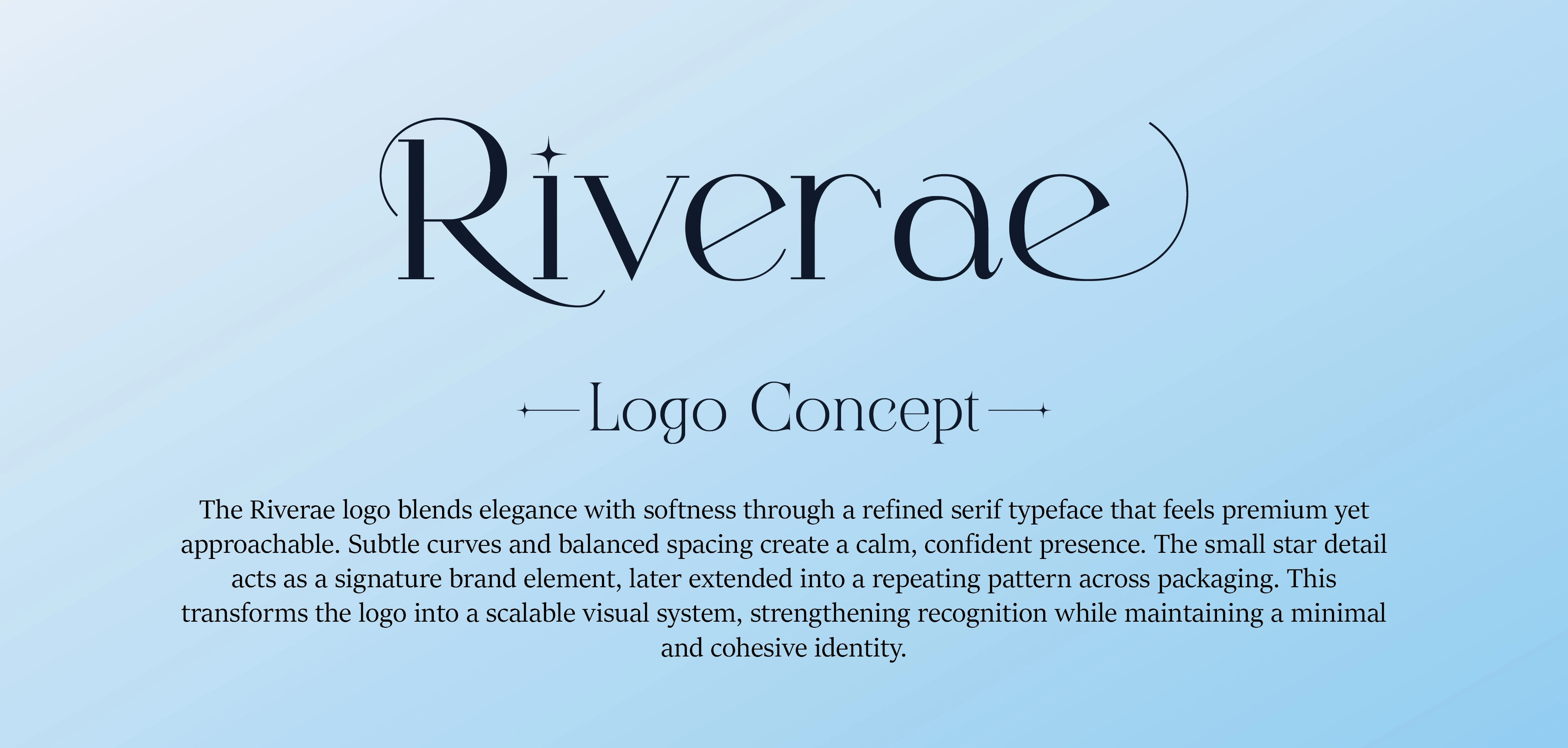 Rivérae was created as a modern skincare brand that feels premium yet approachable. The goal was to design a clean, cohesive identity that stands out in a saturated market without relying on heavy visuals or overcomplicated layouts. The brand system is built around a soft blue and off-white palette to communicate freshness and clarity. A refined serif logo adds elegance, while minimal packaging structure keeps the focus on the product. The subtle star element from the logo evolves into a repeating pattern, creating consistency across packaging and digital touchpoints. The result is a calm, scalable visual system that works seamlessly across serum and cleanser formats designed to look strong on shelf and effortless on Instagram.