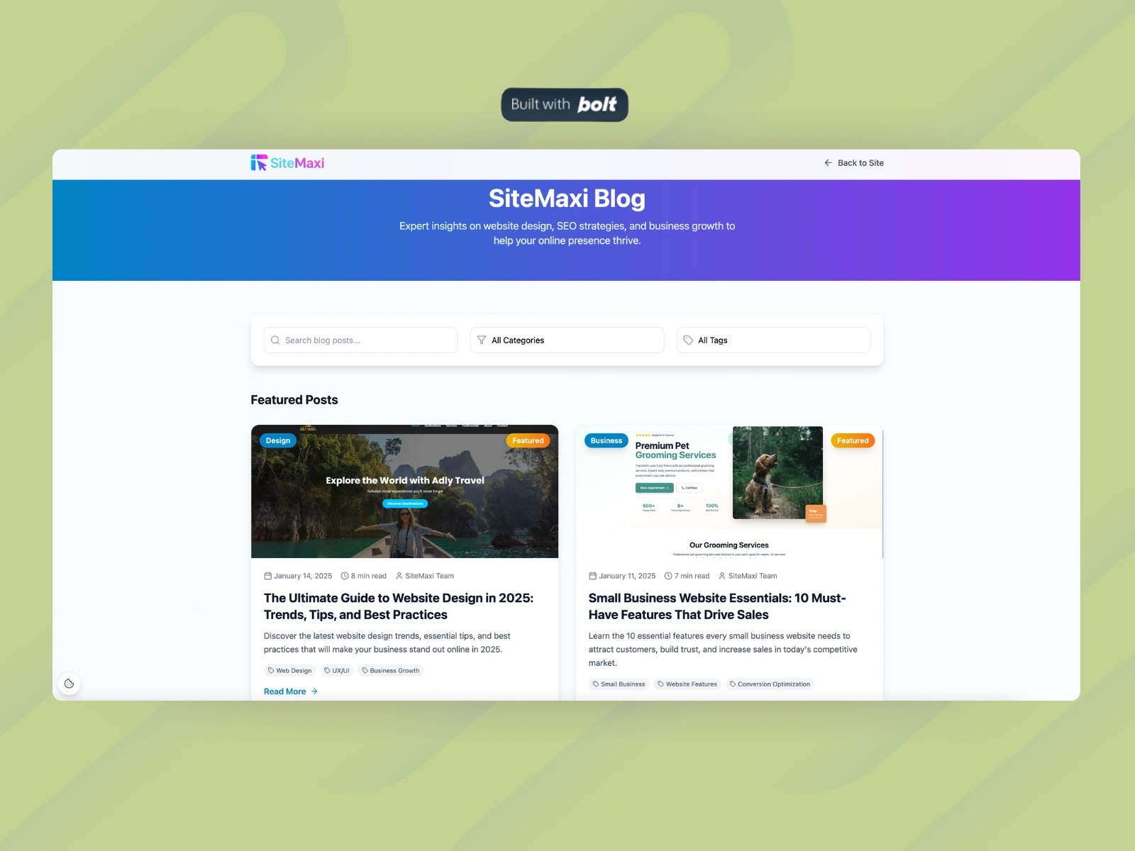 SiteMaxi is a web development studio focused on building clean, conversion-oriented websites for small to mid-sized businesses. The objective was to create a distinct brand identity and digital experience that positions SiteMaxi as a modern, trustworthy, and skilled development partner — without relying on heavy development hours or traditional coding.