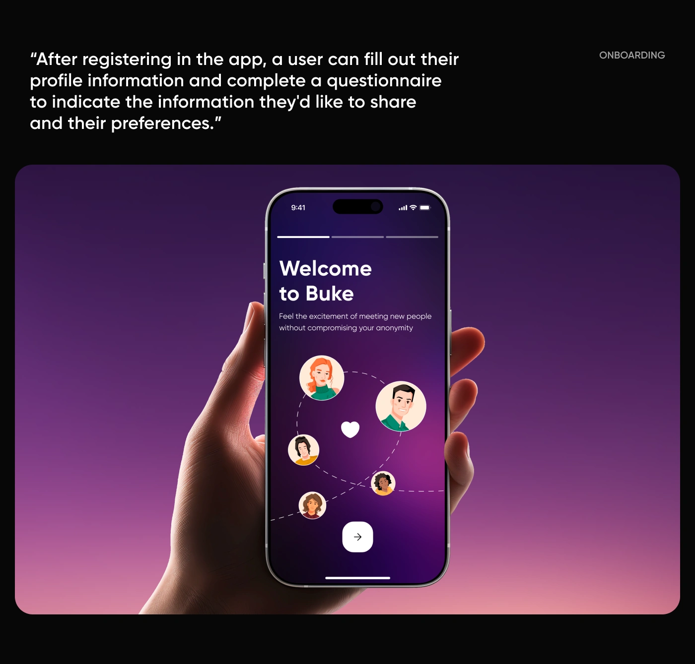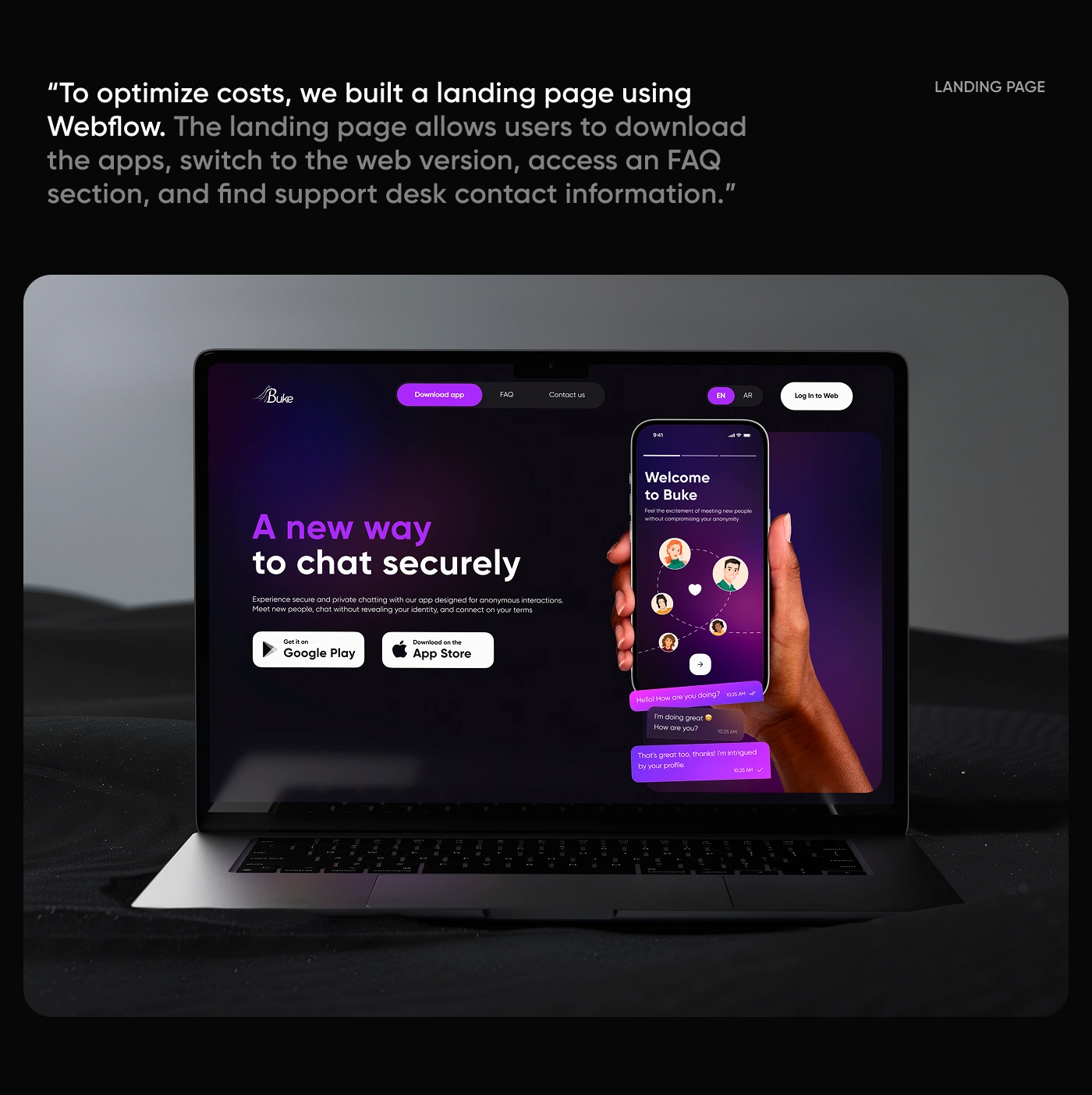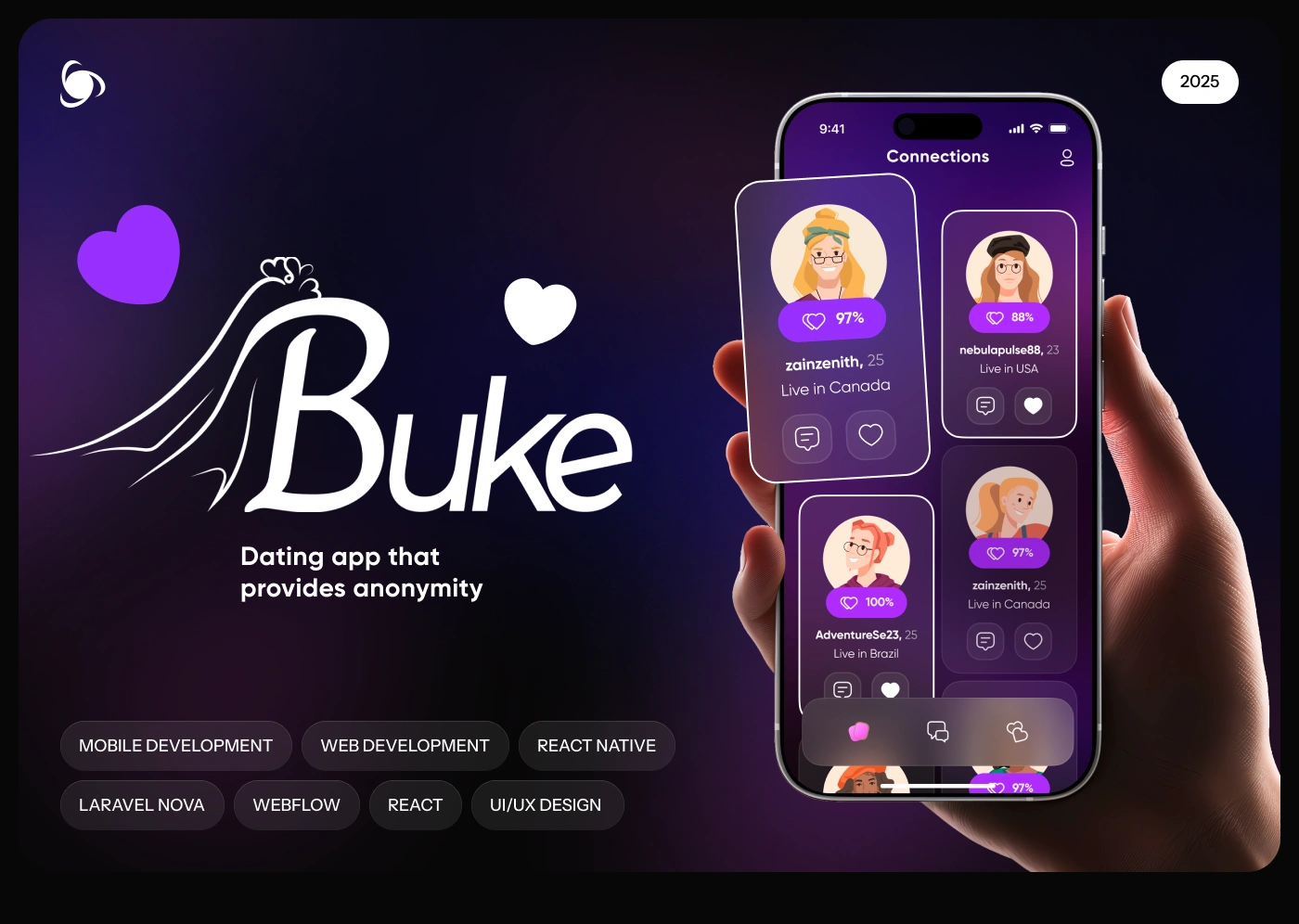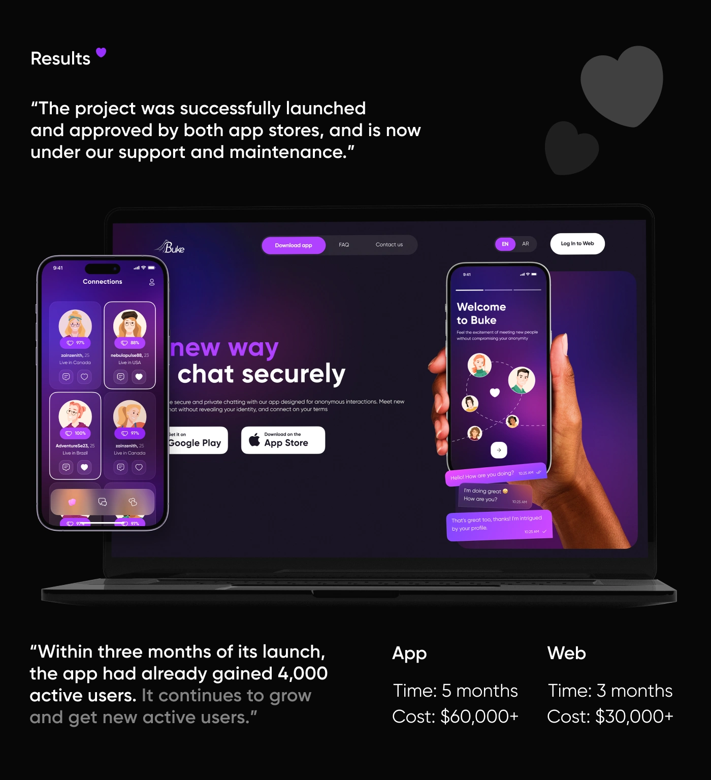 Ronas IT proudly presents Buke, an innovative anonymous dating app designed and developed for users across Arab countries and Europe. Our comprehensive approach included expert UI/UX design and full-cycle mobile development using React Native, ensuring a seamless experience for a sensitive niche. We built a robust backend with Laravel and integrated an efficient admin panel via Laravel Nova. Buke's standout feature is its anonymous matching system, allowing users to connect based purely on shared interests, without revealing photos or personal details. This unique dating app offers secure sign-up, intuitive profiles, and chat functionalities. We also delivered a web version of the app using React and a responsive landing page built with Webflow. Despite development challenges, Buke successfully launched, quickly gaining 4,000 active users within three months. This project highlights our expertise in creating secure, engaging, and scalable mobile development solutions for niche market