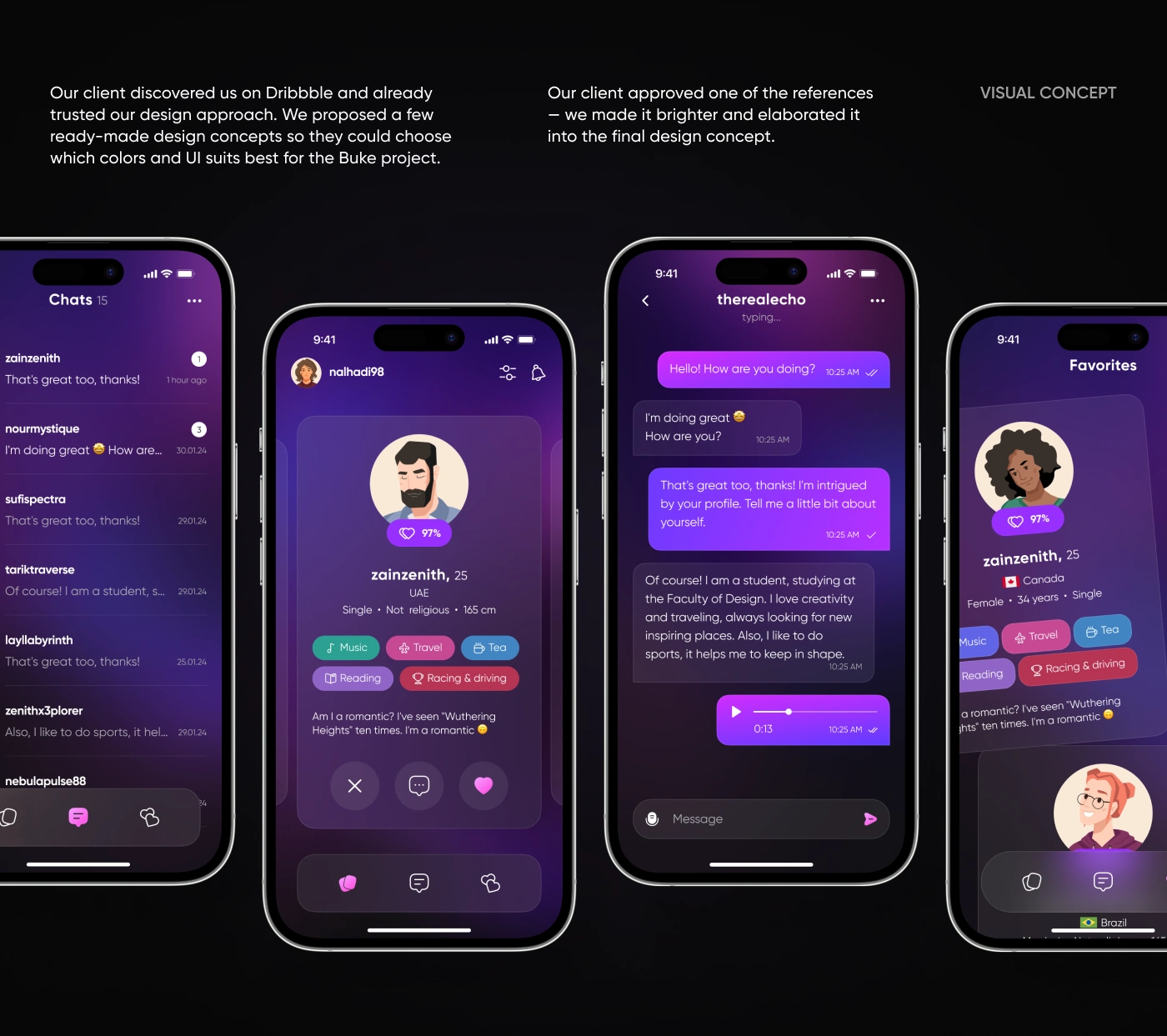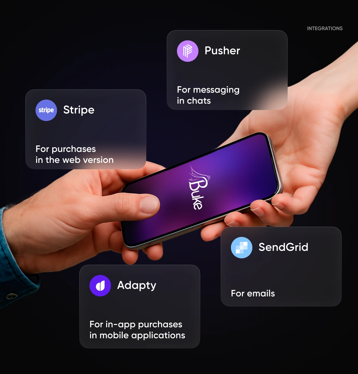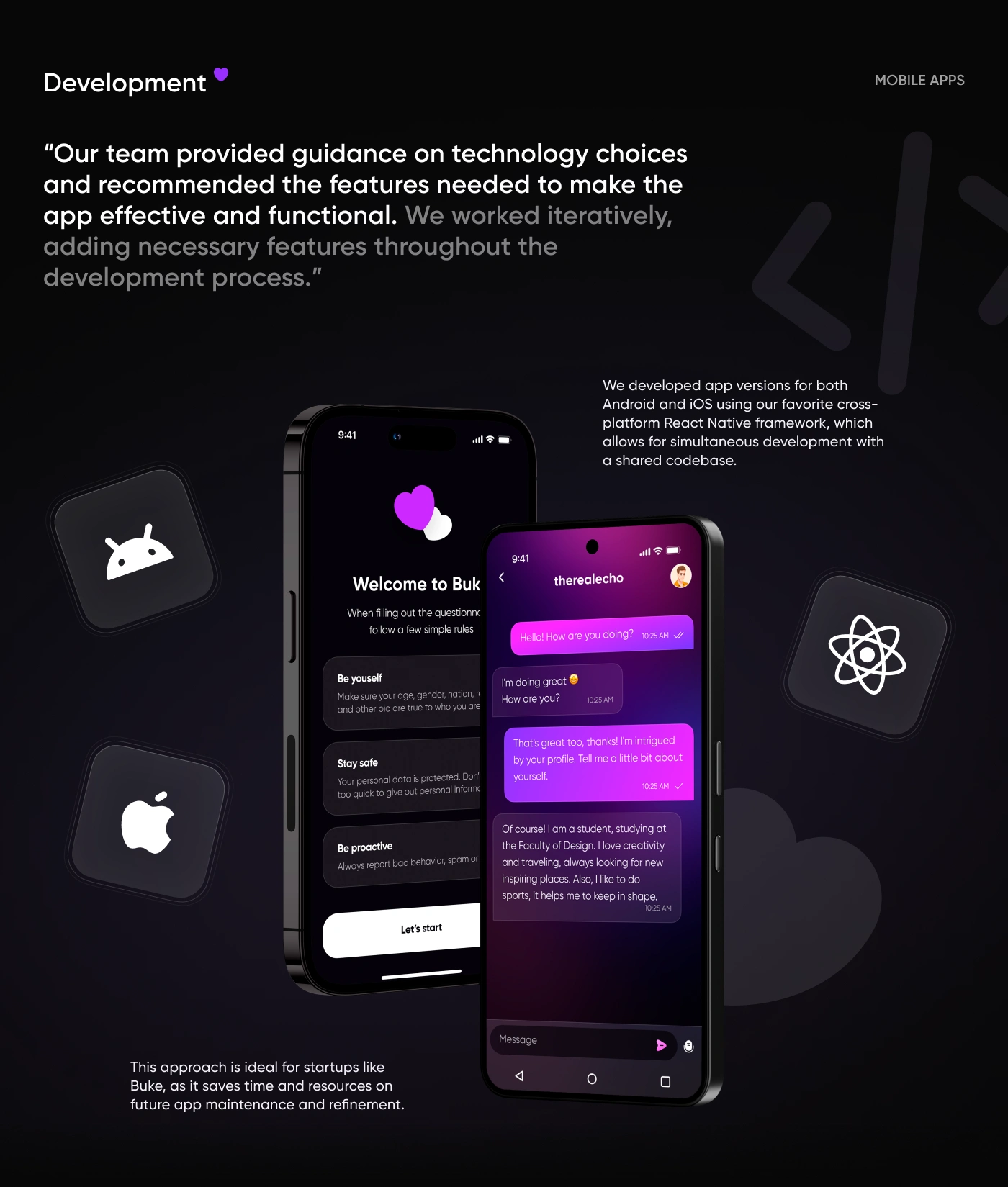 Ronas IT proudly presents Buke, an innovative anonymous dating app designed and developed for users across Arab countries and Europe. Our comprehensive approach included expert UI/UX design and full-cycle mobile development using React Native, ensuring a seamless experience for a sensitive niche. We built a robust backend with Laravel and integrated an efficient admin panel via Laravel Nova. Buke's standout feature is its anonymous matching system, allowing users to connect based purely on shared interests, without revealing photos or personal details. This unique dating app offers secure sign-up, intuitive profiles, and chat functionalities. We also delivered a web version of the app using React and a responsive landing page built with Webflow. Despite development challenges, Buke successfully launched, quickly gaining 4,000 active users within three months. This project highlights our expertise in creating secure, engaging, and scalable mobile development solutions for niche market