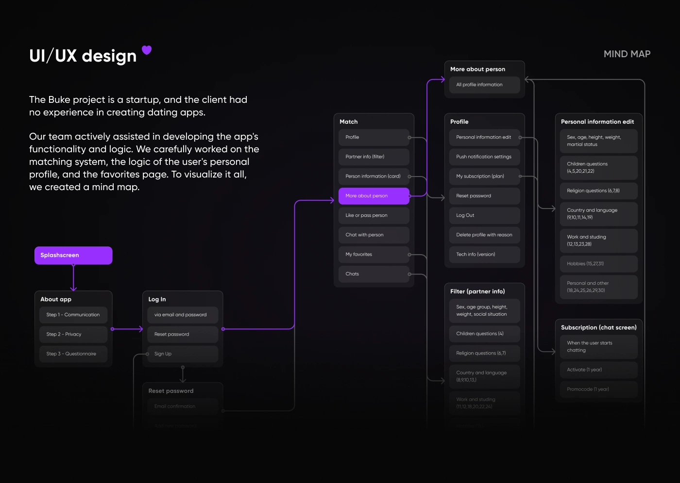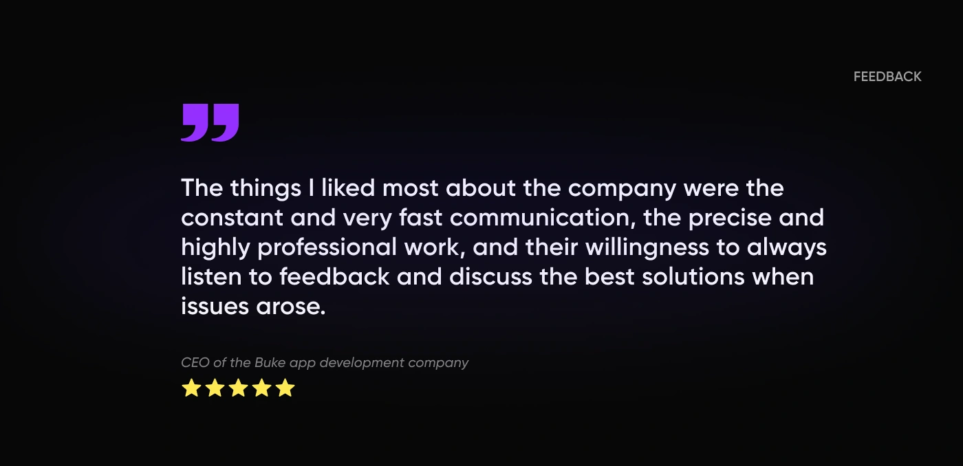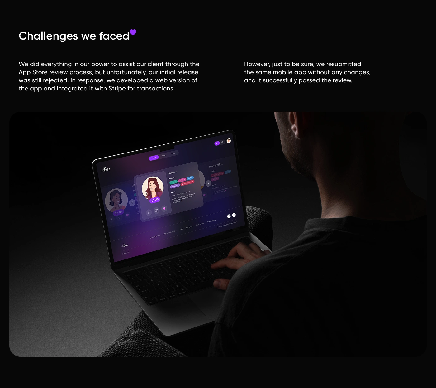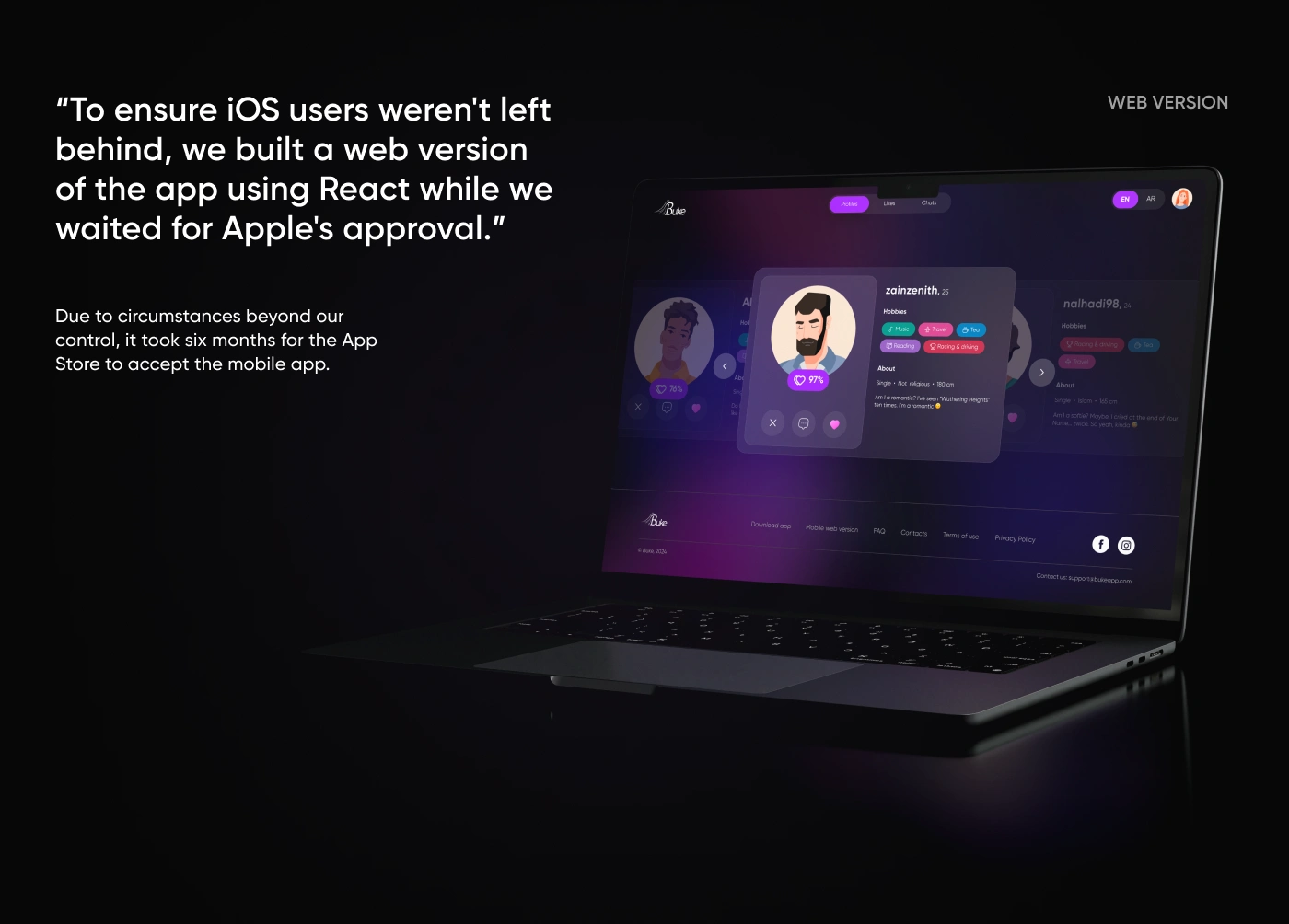 Ronas IT proudly presents Buke, an innovative anonymous dating app designed and developed for users across Arab countries and Europe. Our comprehensive approach included expert UI/UX design and full-cycle mobile development using React Native, ensuring a seamless experience for a sensitive niche. We built a robust backend with Laravel and integrated an efficient admin panel via Laravel Nova. Buke's standout feature is its anonymous matching system, allowing users to connect based purely on shared interests, without revealing photos or personal details. This unique dating app offers secure sign-up, intuitive profiles, and chat functionalities. We also delivered a web version of the app using React and a responsive landing page built with Webflow. Despite development challenges, Buke successfully launched, quickly gaining 4,000 active users within three months. This project highlights our expertise in creating secure, engaging, and scalable mobile development solutions for niche market