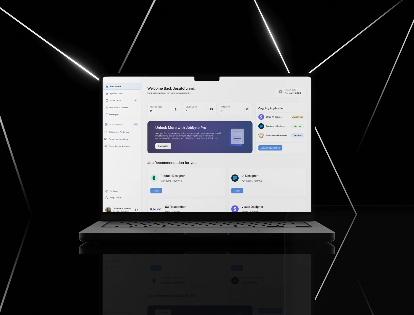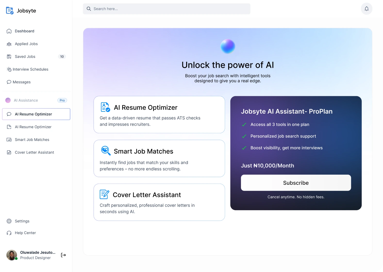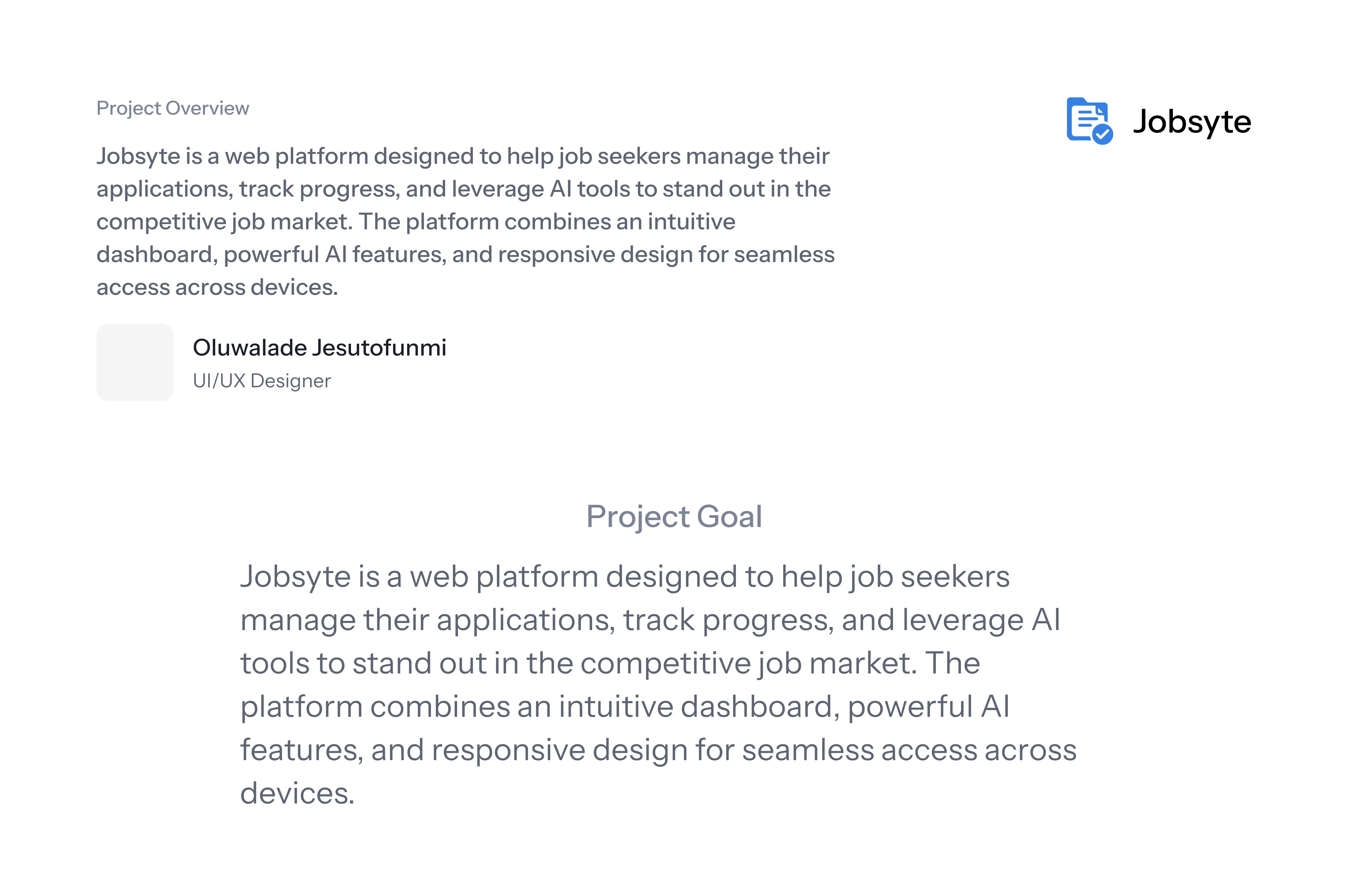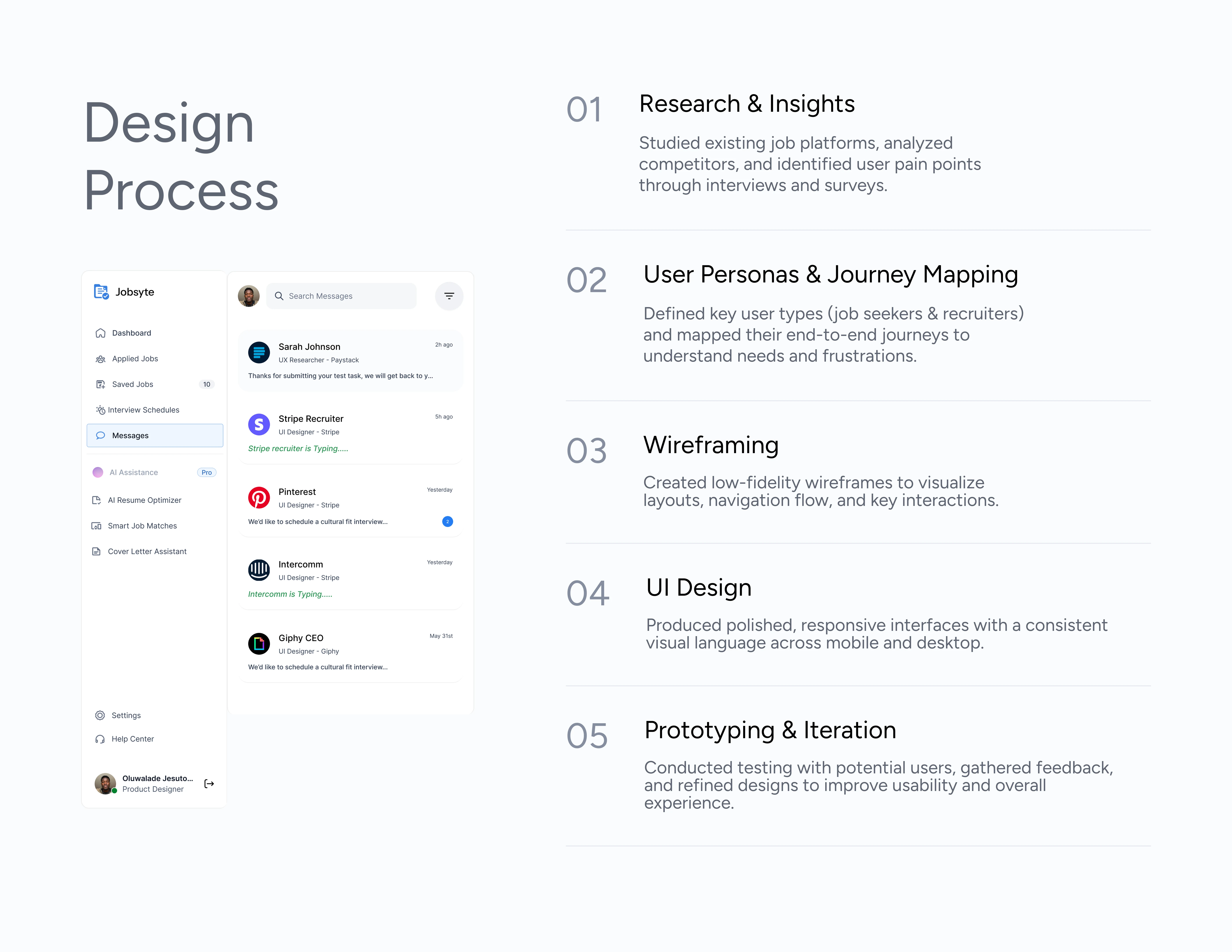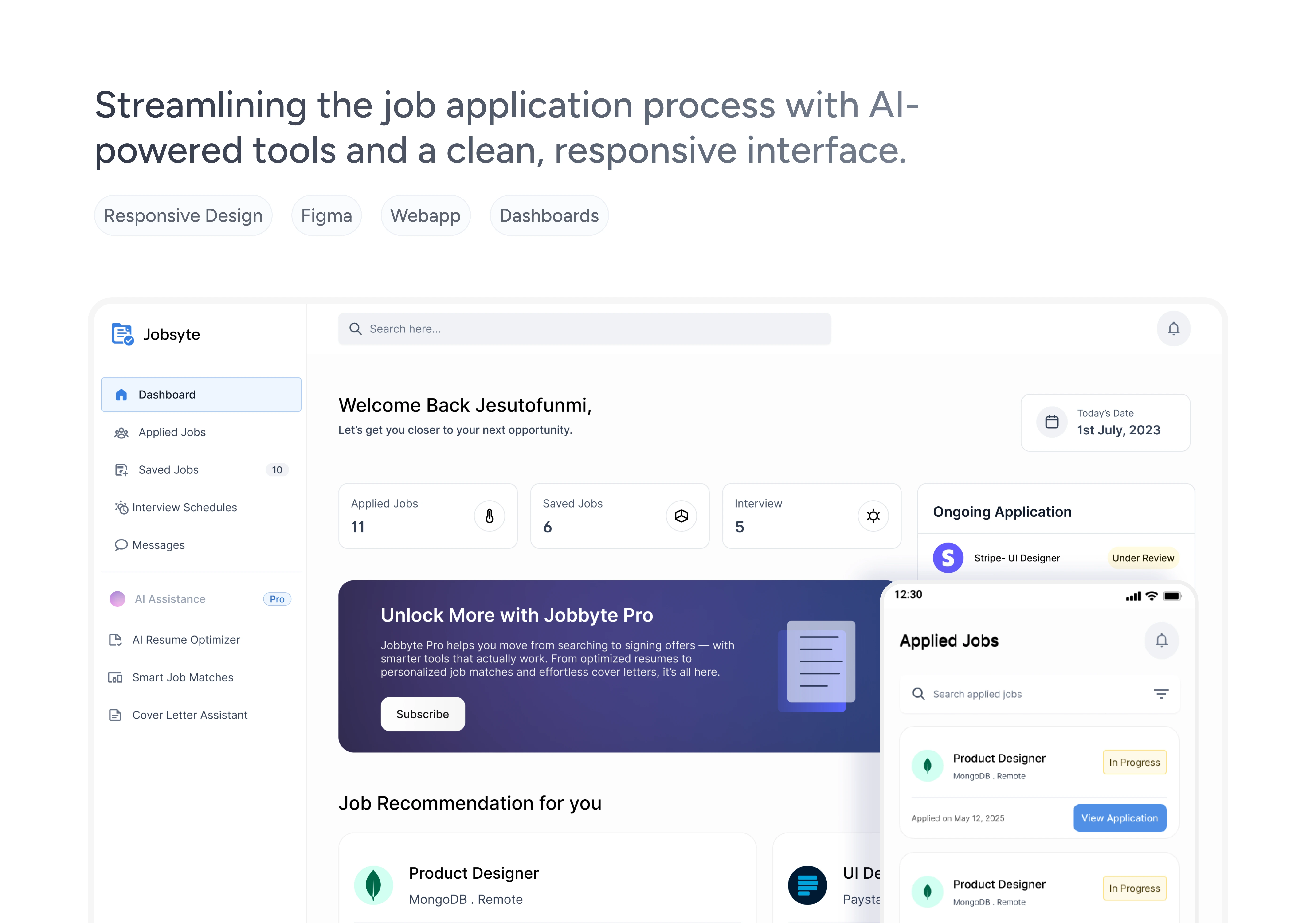 Designed a responsive web platform for JobSyte built to help job seekers manage applications, track progress, and leverage AI tools to stand out in a competitive market. The layout features an intuitive dashboard, smart tracking flows, and clean visual hierarchy across devices. From onboarding to optimization, every screen was crafted to reduce friction and boost confidence.