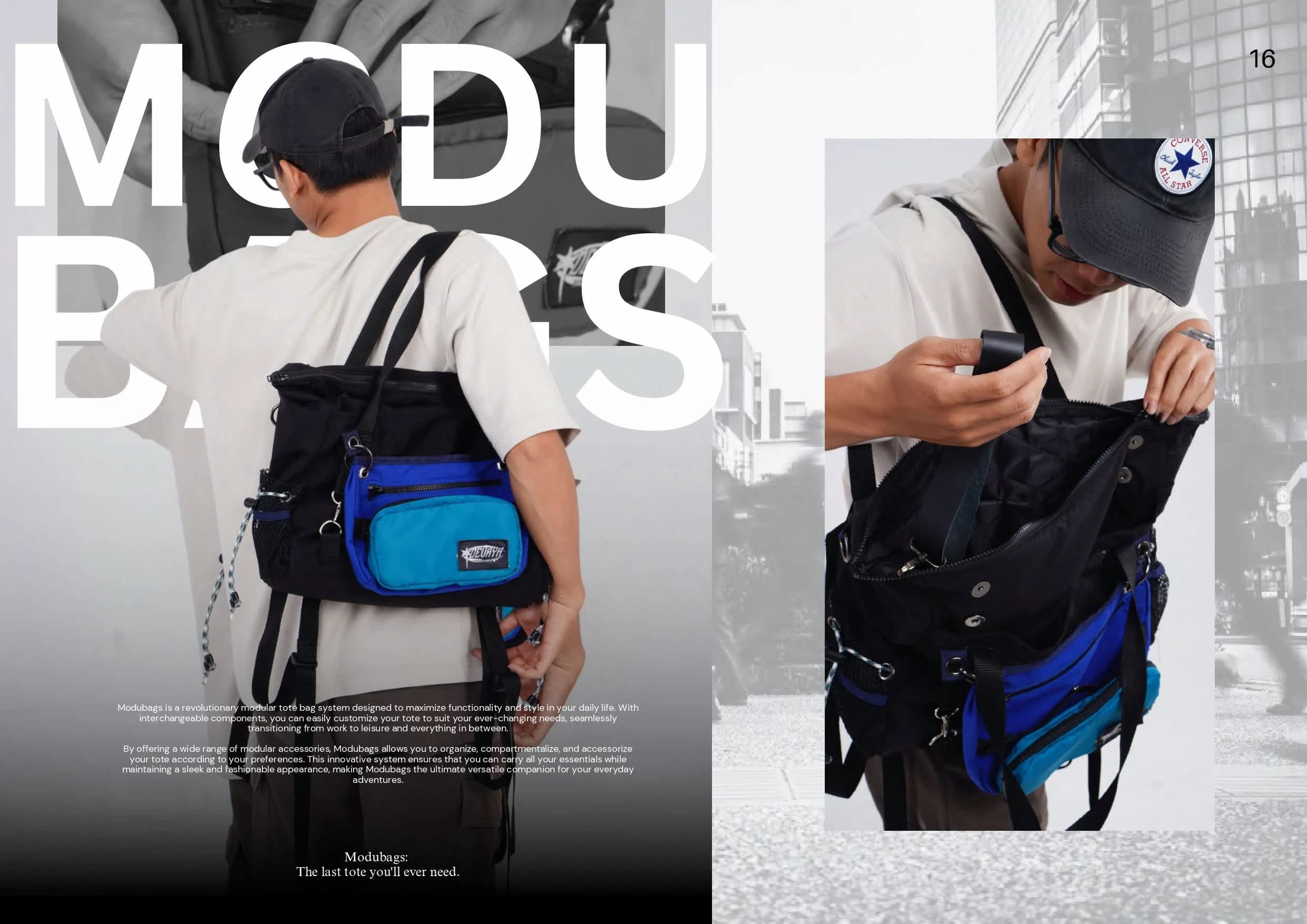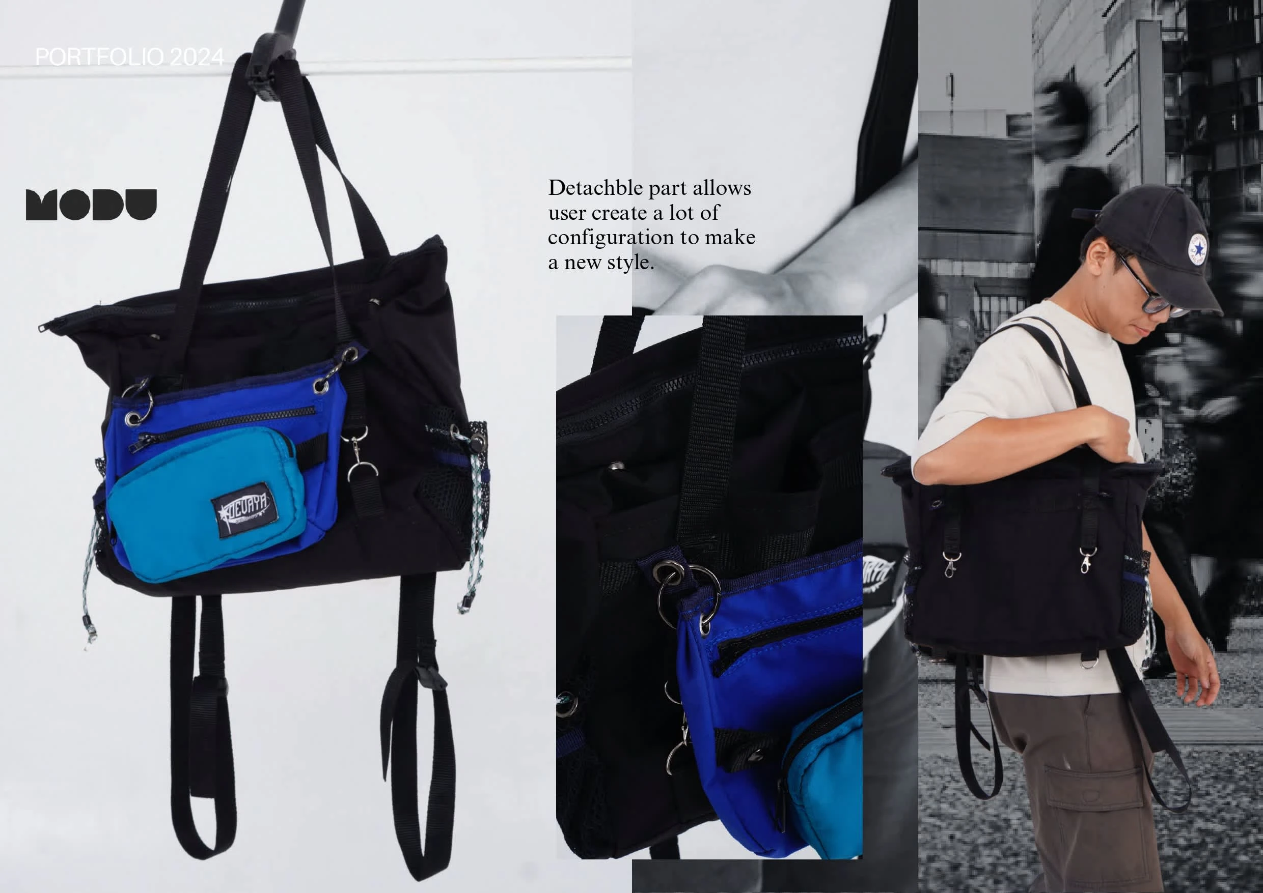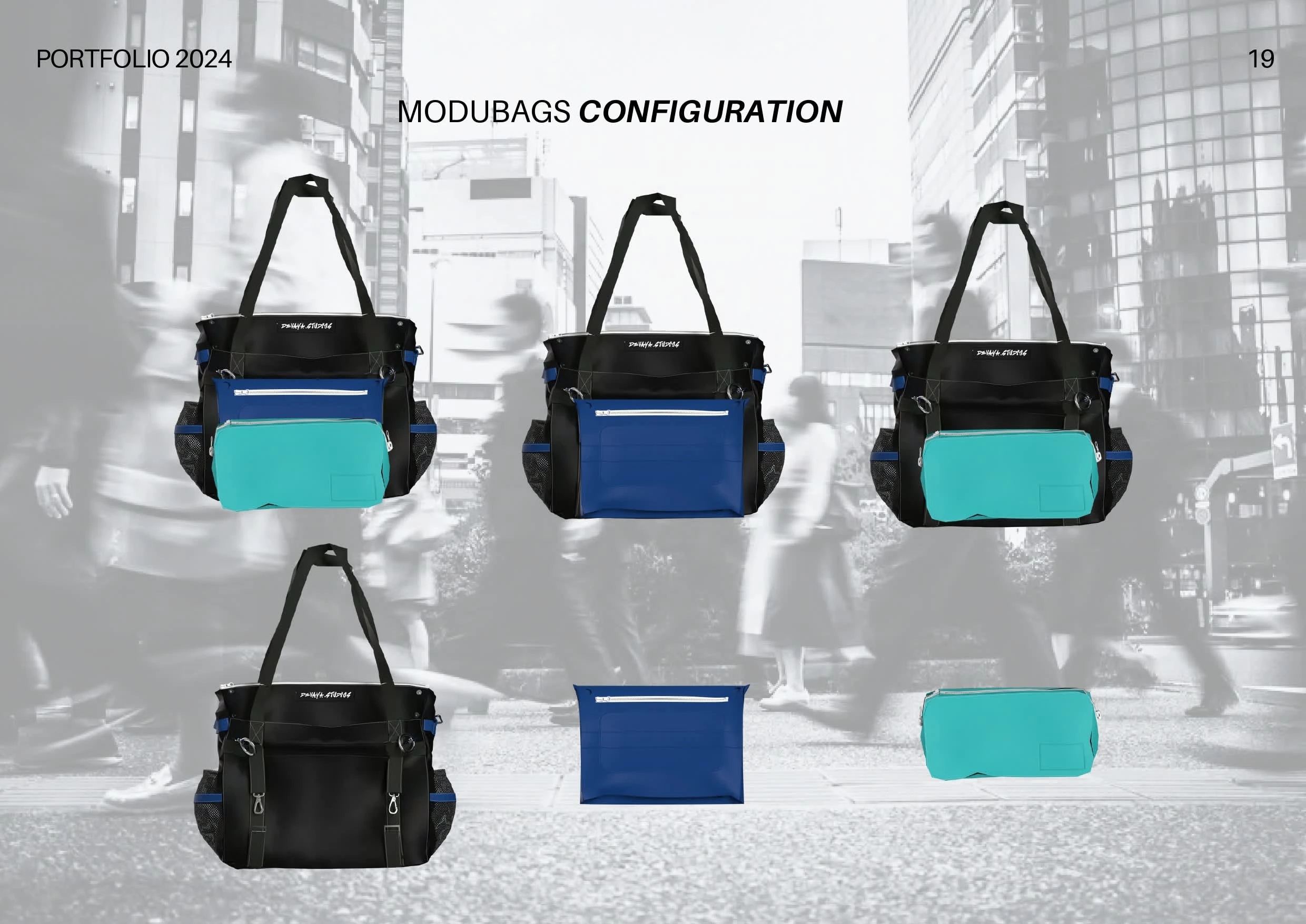 Modular tote transforms to backpack/sling. Expandable system adjusts capacity. Interchangeable panels, attachable pouches for personalization.