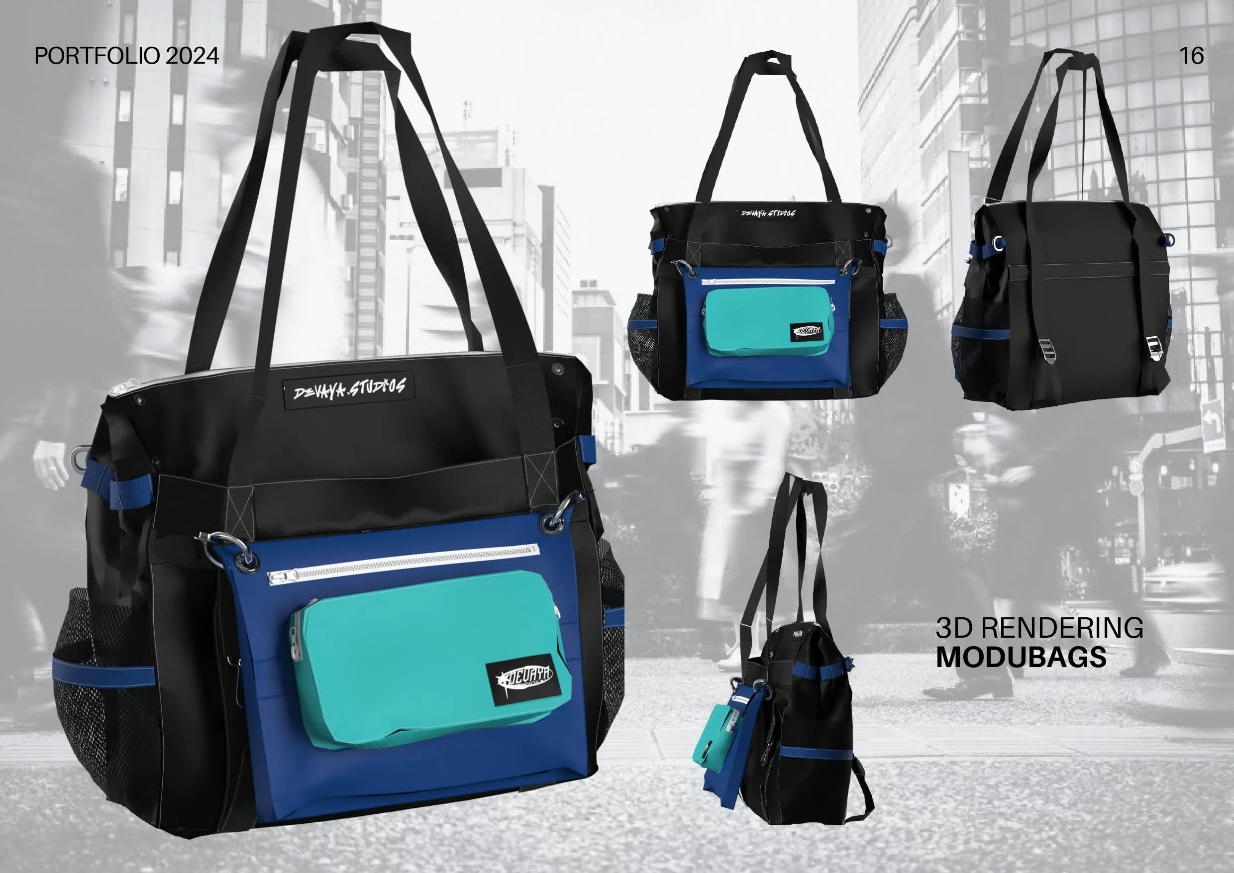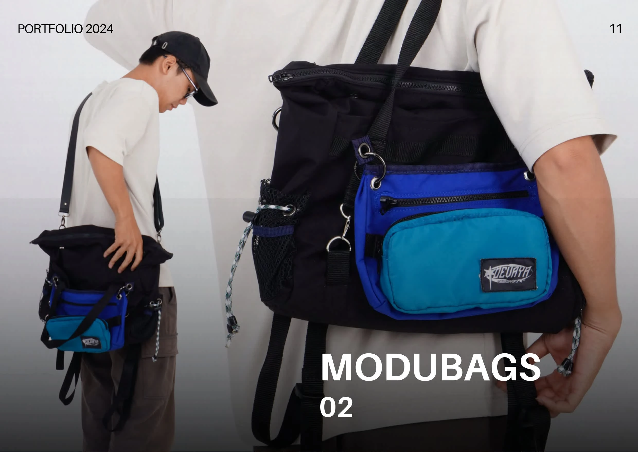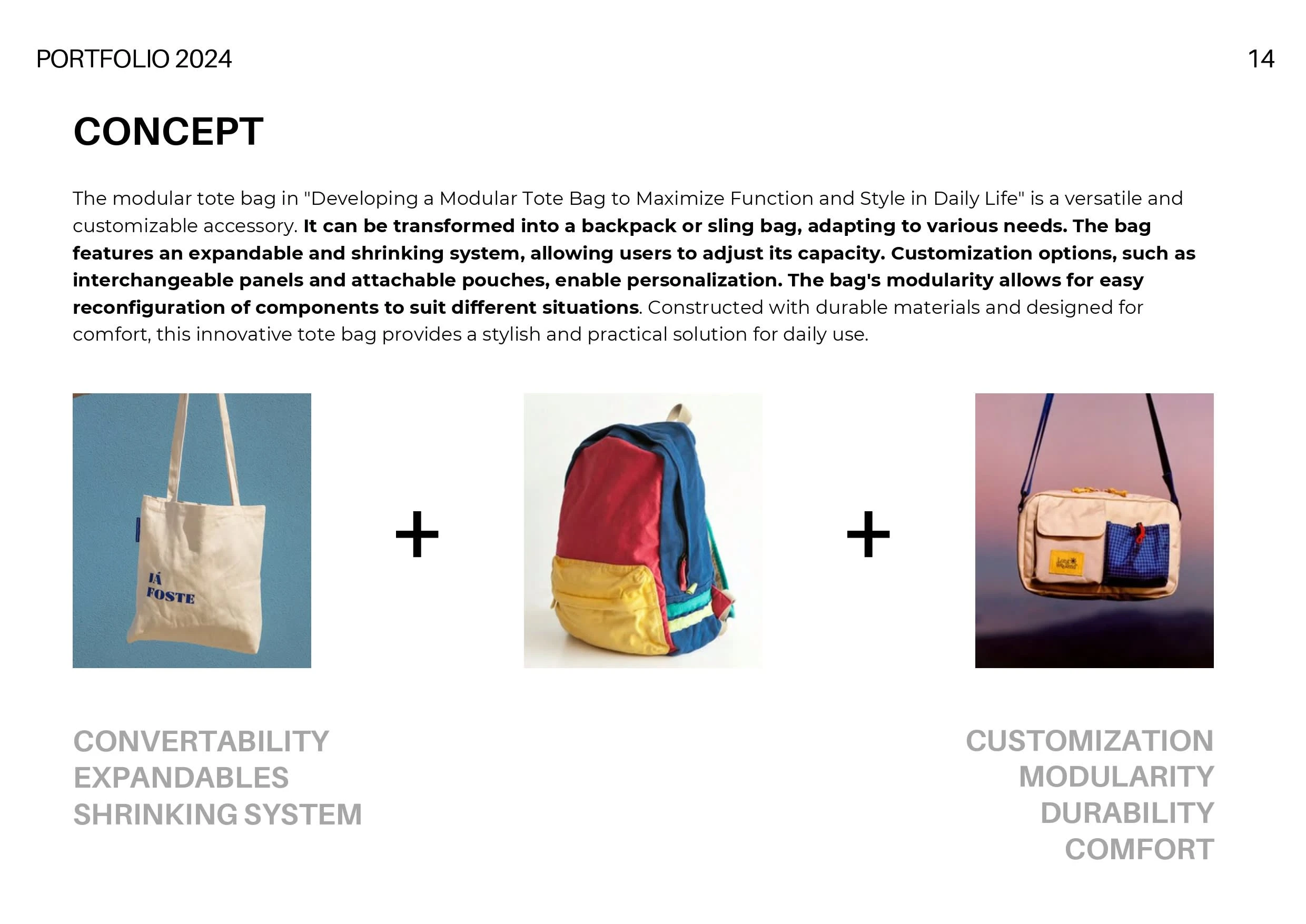 Modular tote transforms to backpack/sling. Expandable system adjusts capacity. Interchangeable panels, attachable pouches for personalization.