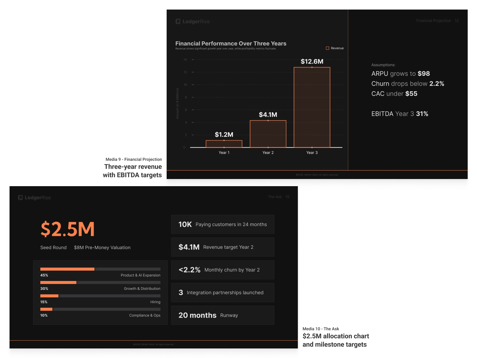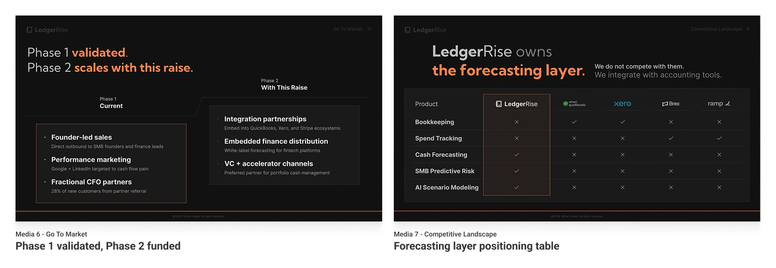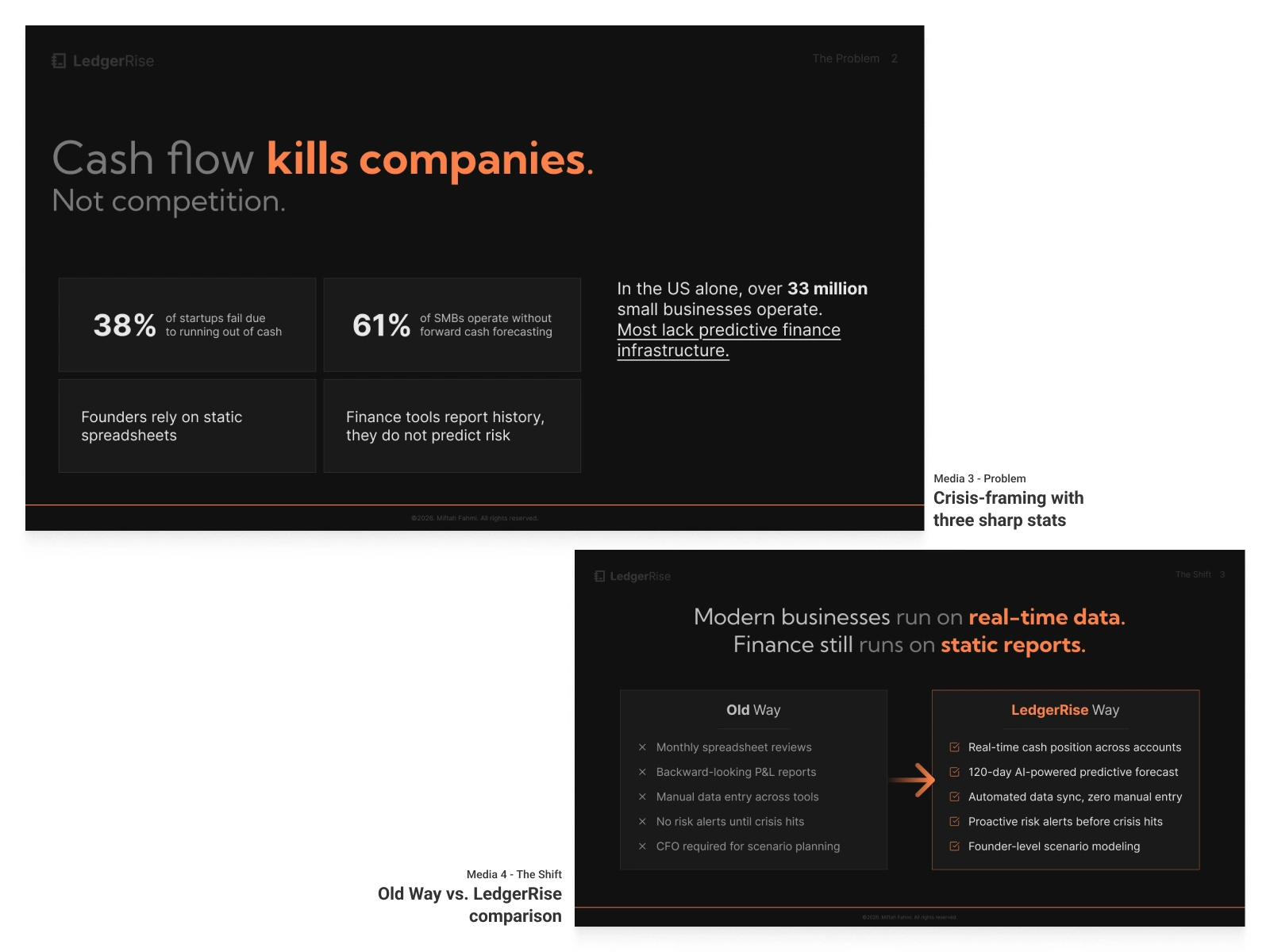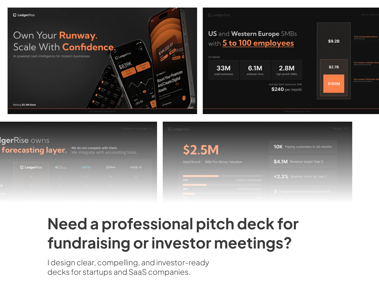 This 15-slide Seed deck positions LedgerRise as the predictive finance layer for modern SMBs, raising $2.5M at an $8M pre-money valuation. The product solves a specific, measurable problem: 38% of startups fail from cash mismanagement, yet 61% of SMBs still operate without forward cash forecasting.