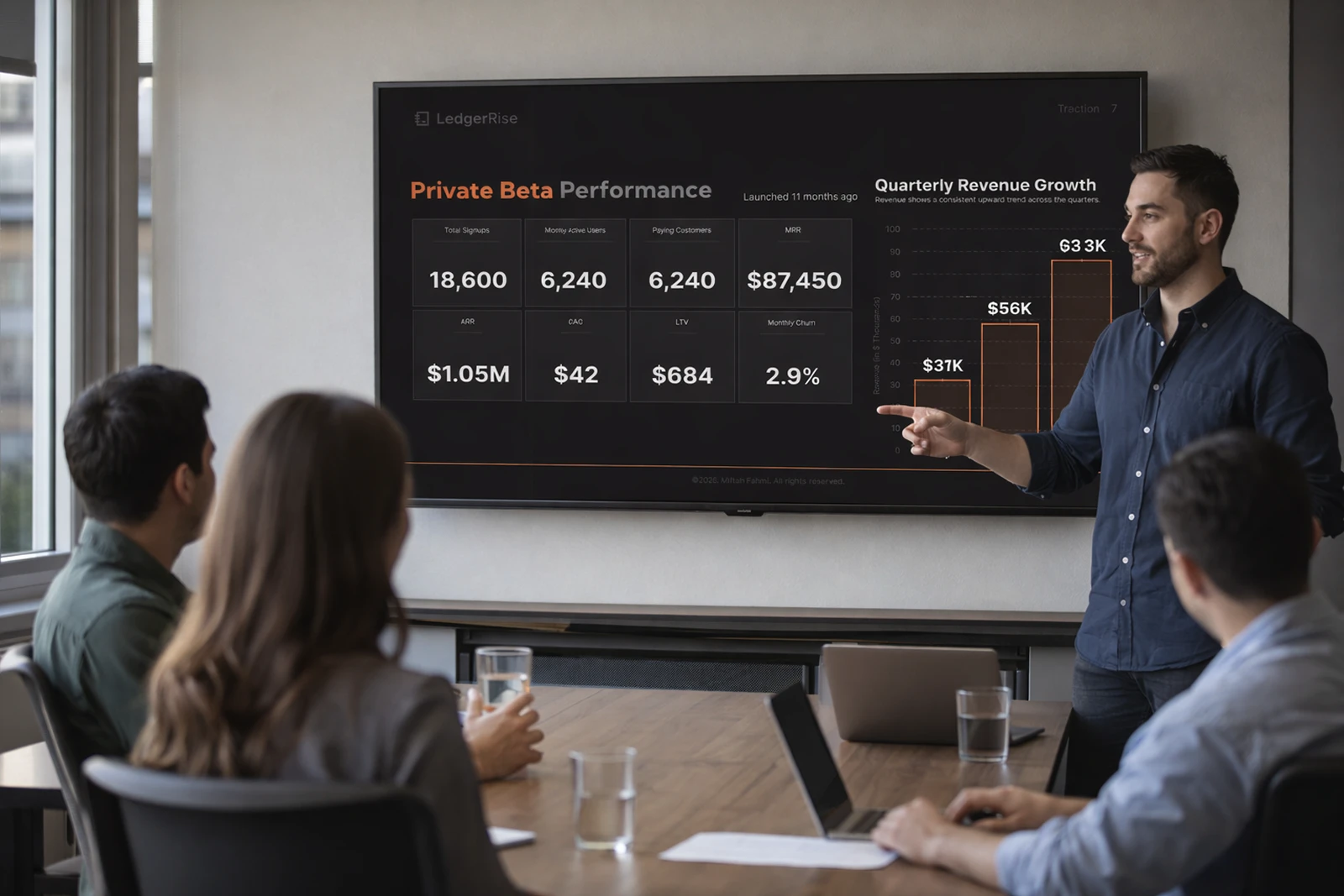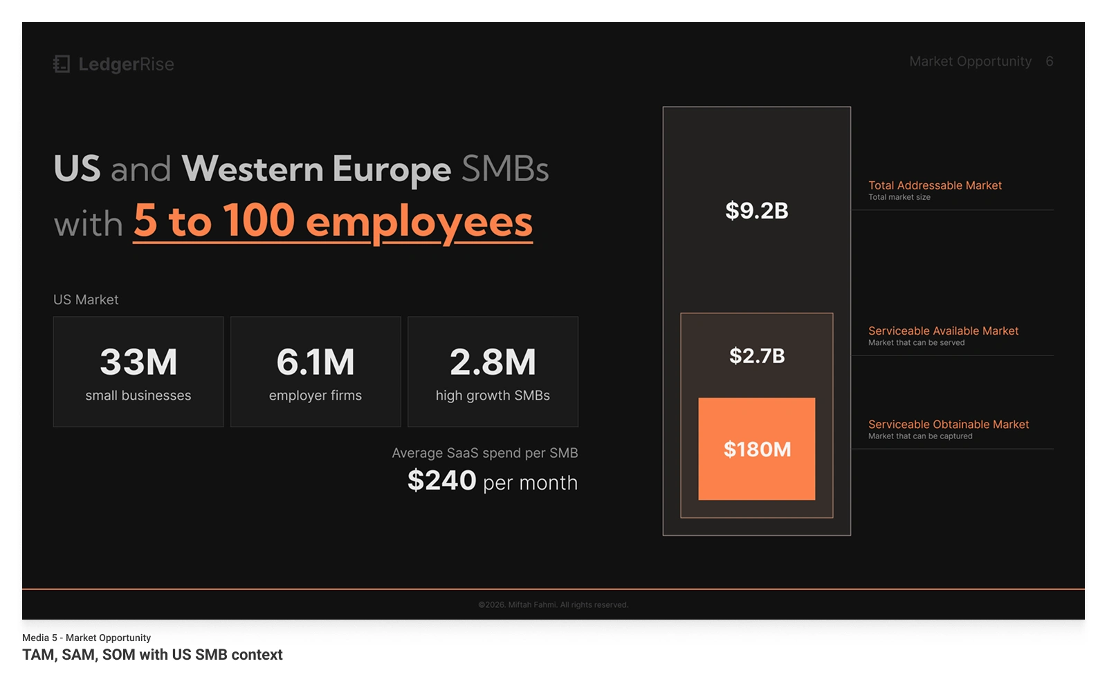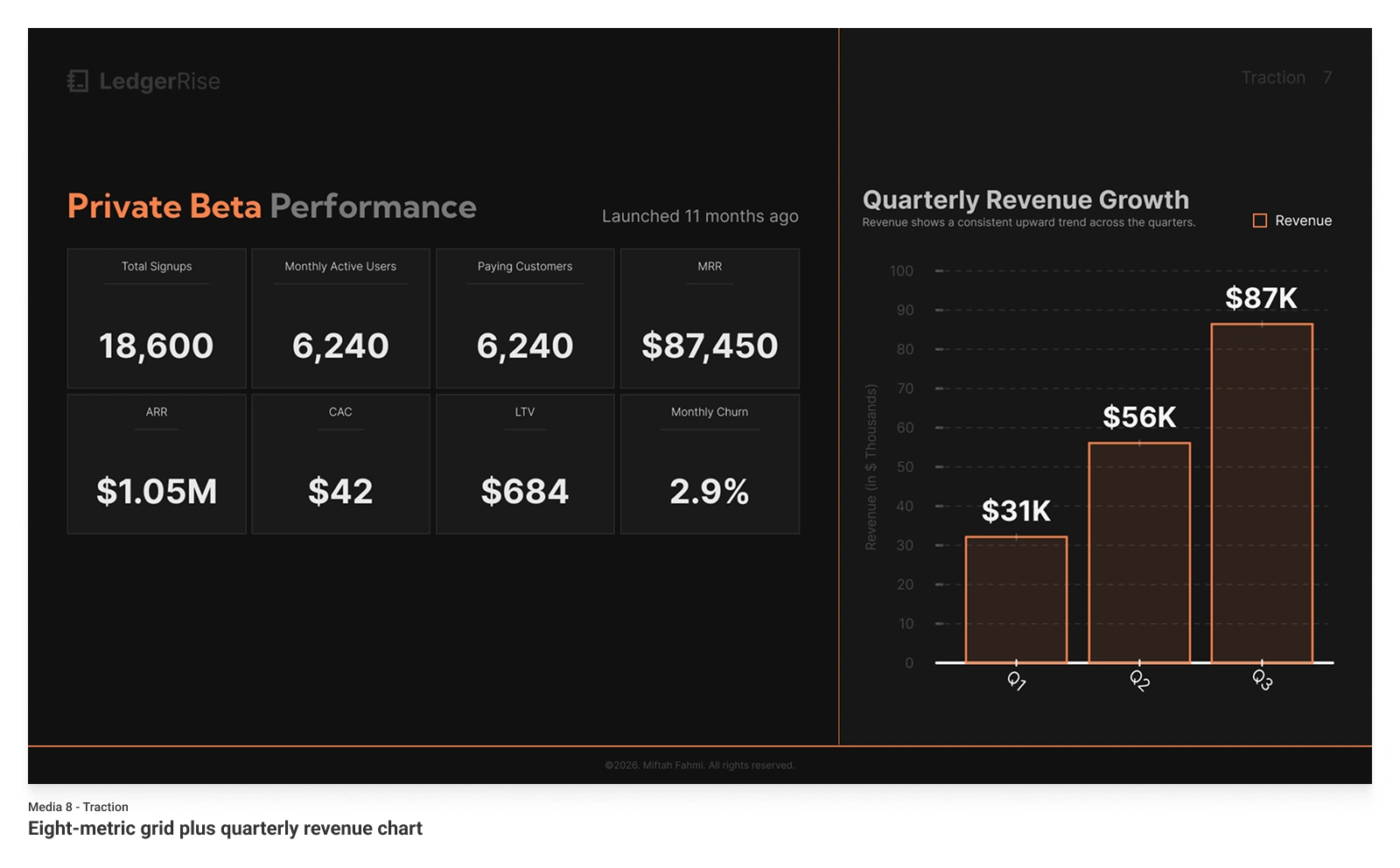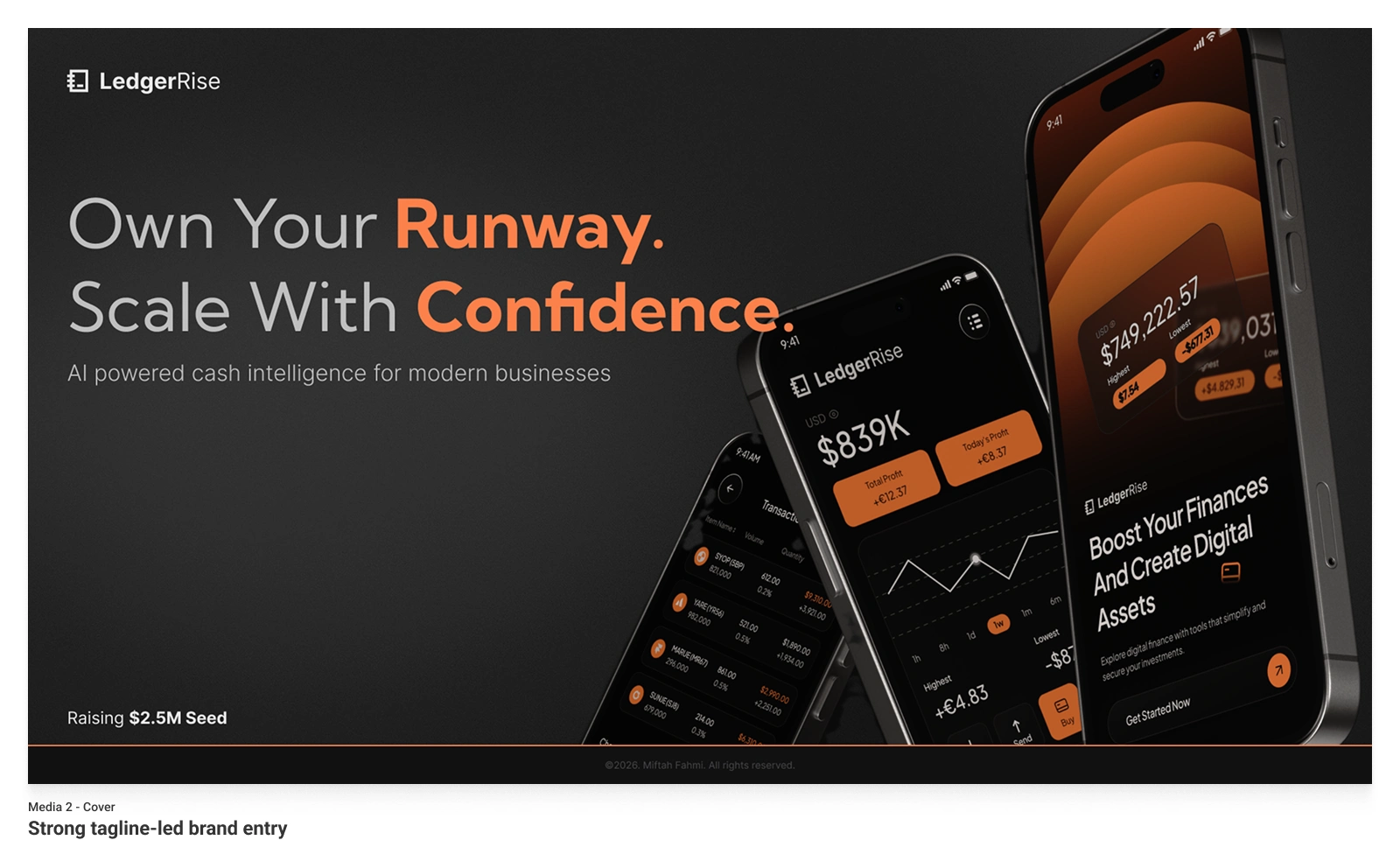 This 15-slide Seed deck positions LedgerRise as the predictive finance layer for modern SMBs, raising $2.5M at an $8M pre-money valuation. The product solves a specific, measurable problem: 38% of startups fail from cash mismanagement, yet 61% of SMBs still operate without forward cash forecasting.