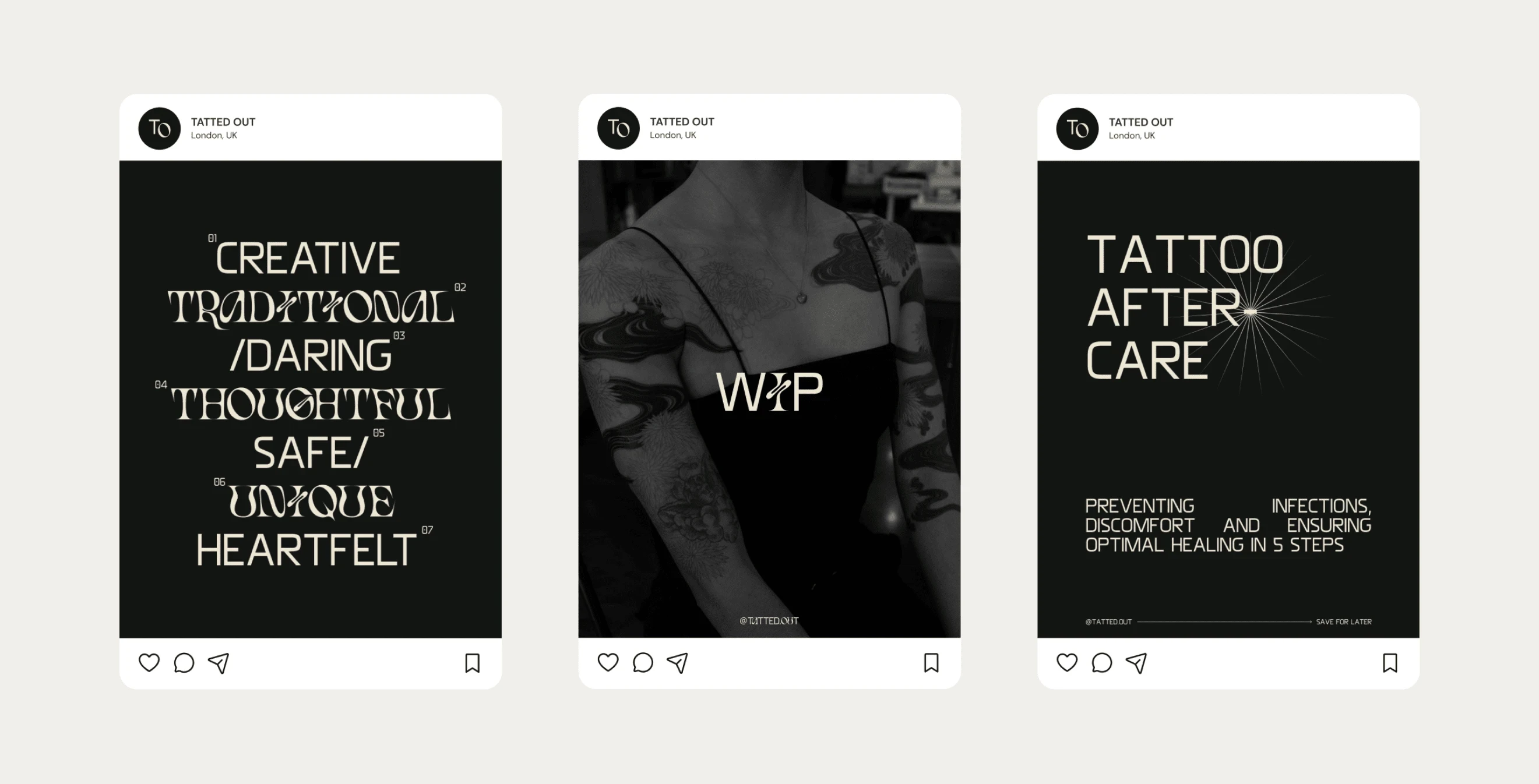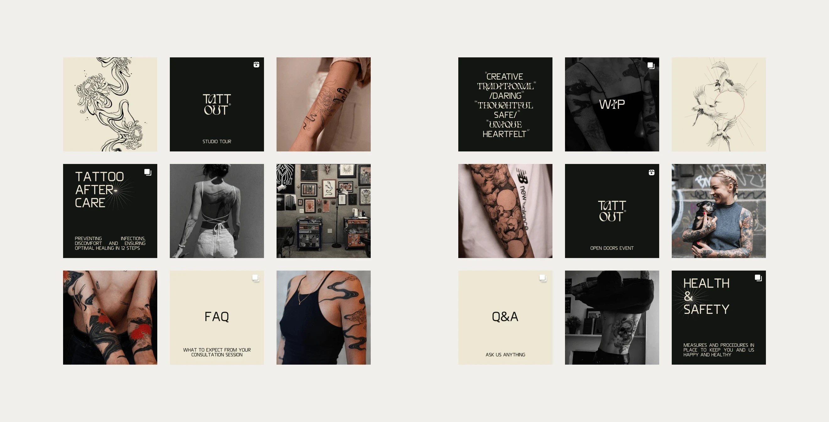 The brand extends effortlessly across digital and print touchpoints. Social media templates showcase the artistry and storytelling behind every piece, creating an engaging feed that feels as curated as a gallery wall. Print collateral - appointment cards, aftercare guides, and artist portfolios - reinforces the parlor's elevated, design-conscious aesthetic while maintaining the edge that makes Tatted Out distinct.
