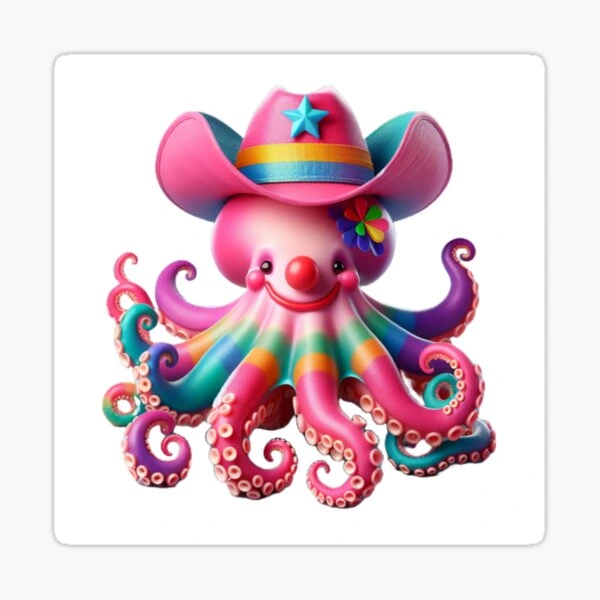 Clown-Octopus Cowboy: Whimsical Marine Character Sticker