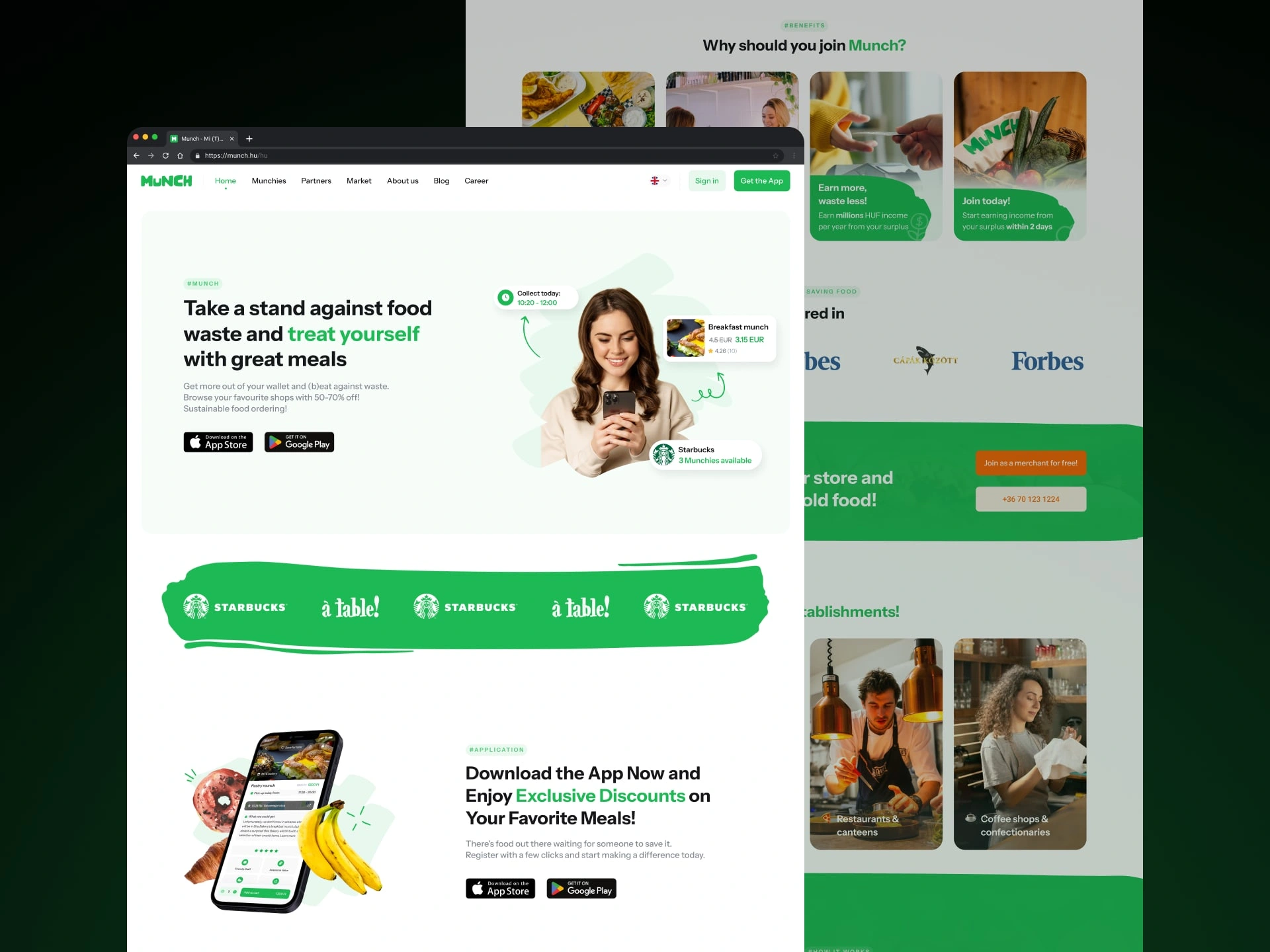 Munch is a platform that empowers consumers to browse and purchase meals from their favorite local businesses at a discount of 50-70%. The platform's mission is to promote sustainable food ordering by helping reduce food waste.
