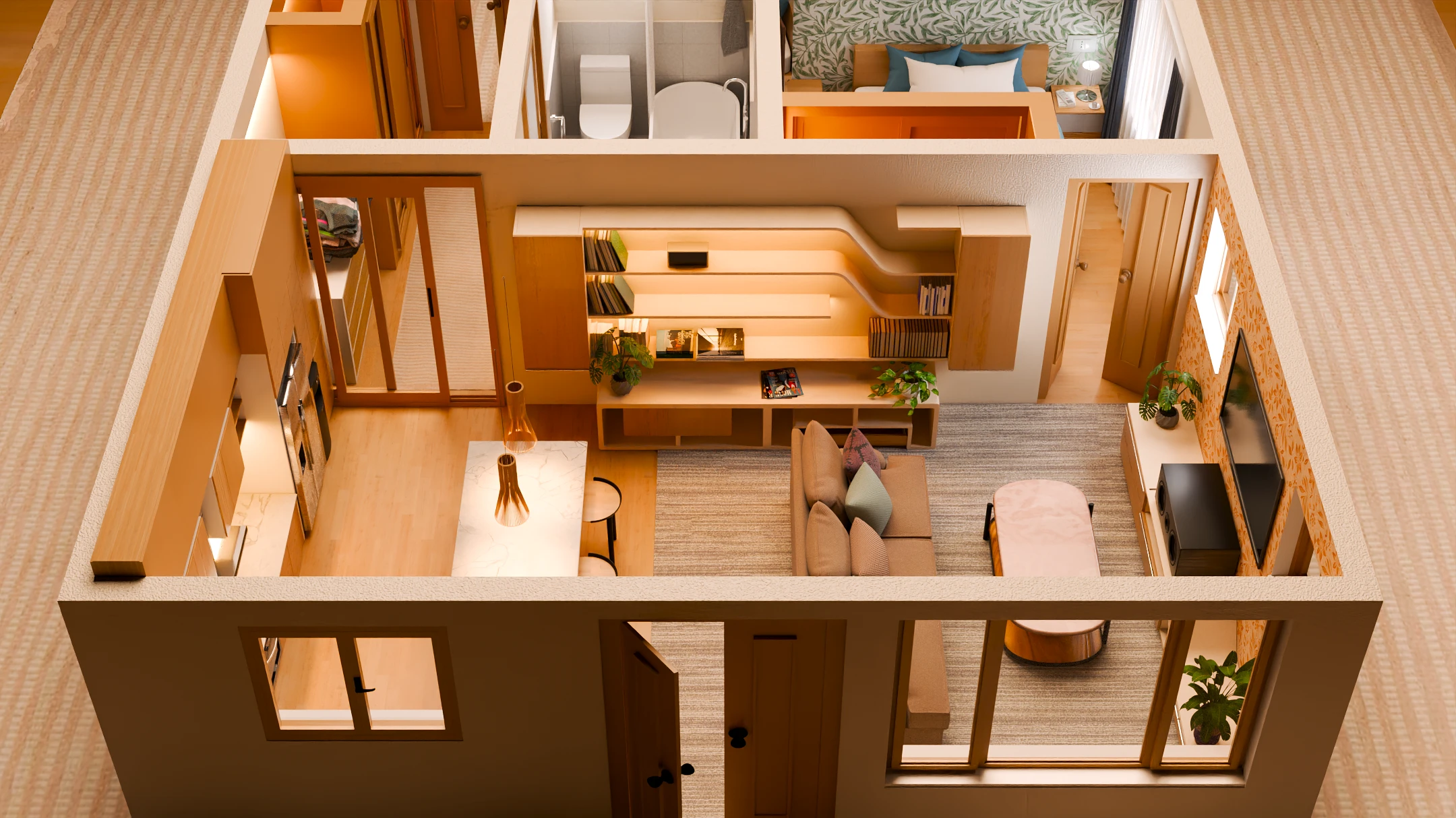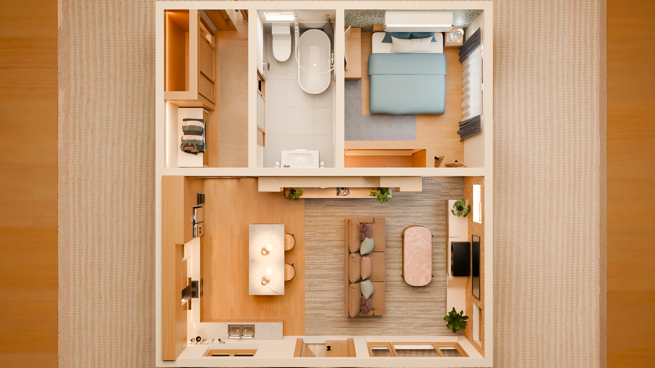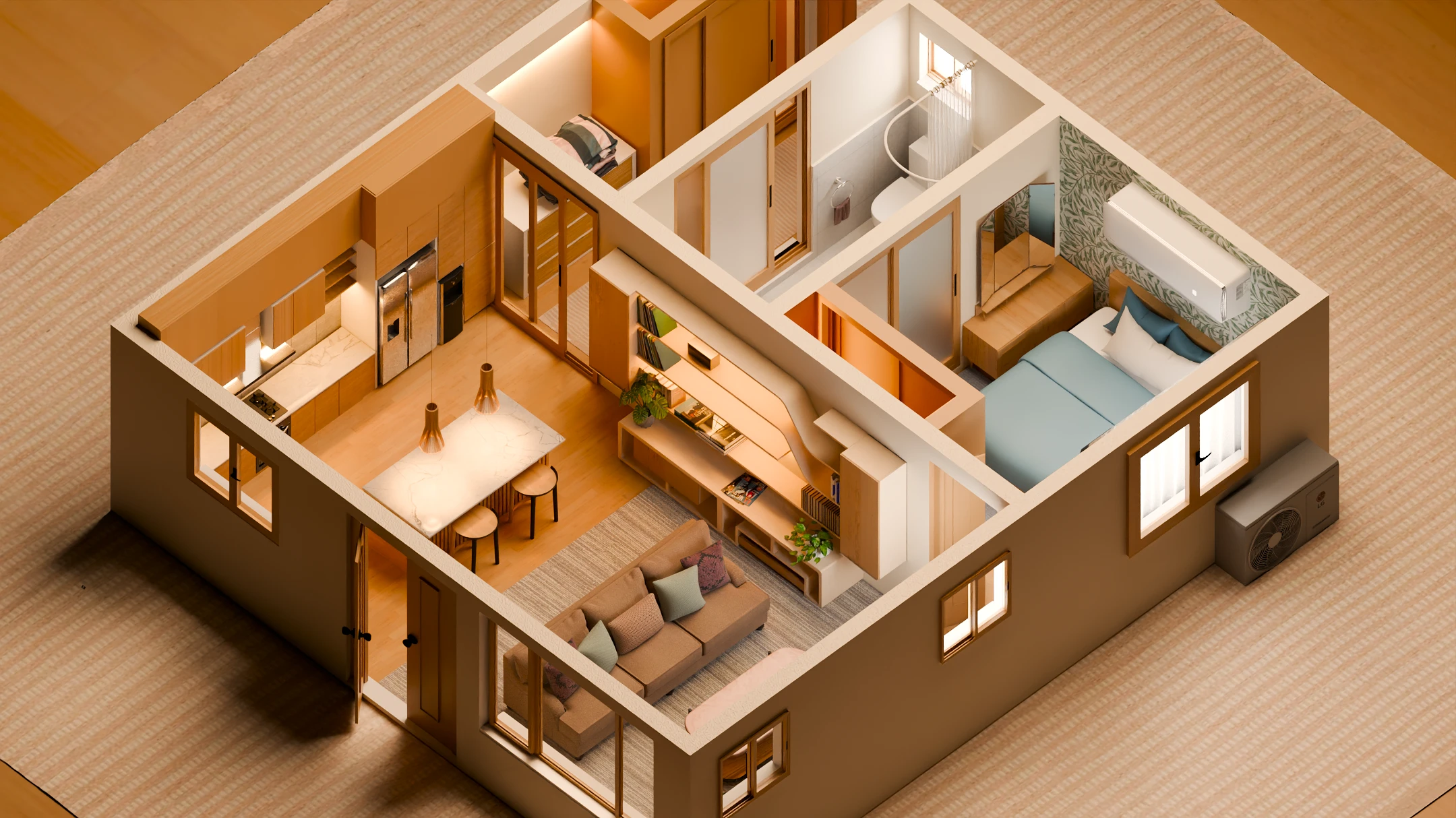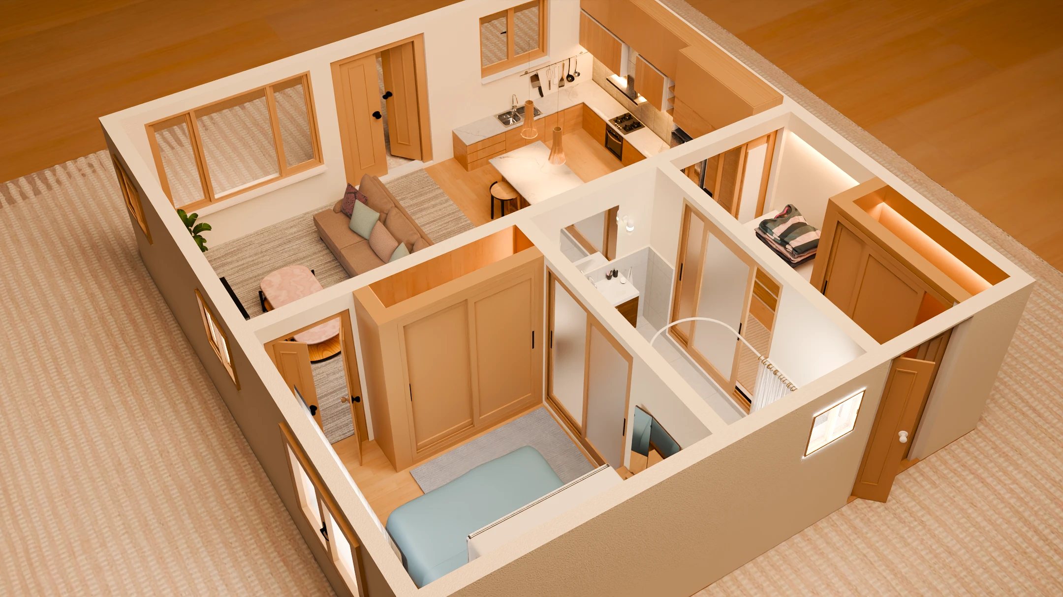 Faced scale harmonization issues while aligning kitchen fixtures, furniture, and wall thickness within a tight floorplate. Achieving balanced interior lighting without flattening materials was critical, particularly in enclosed bathroom and bedroom spaces.