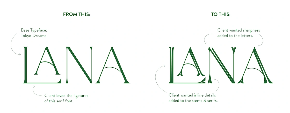 Louisiana Nutrition Associates, a collective of dietitian nutritionists, sought a brand identity that exuded quiet luxury and had a clean design. The client envisioned a serif typeface with an inline style and expressed interest in ligatures. After selecting Tokyo Dreams as the primary font, we collaborated to minimize ligature usage while incorporating the desired inline style to create a refined wordmark and logo.