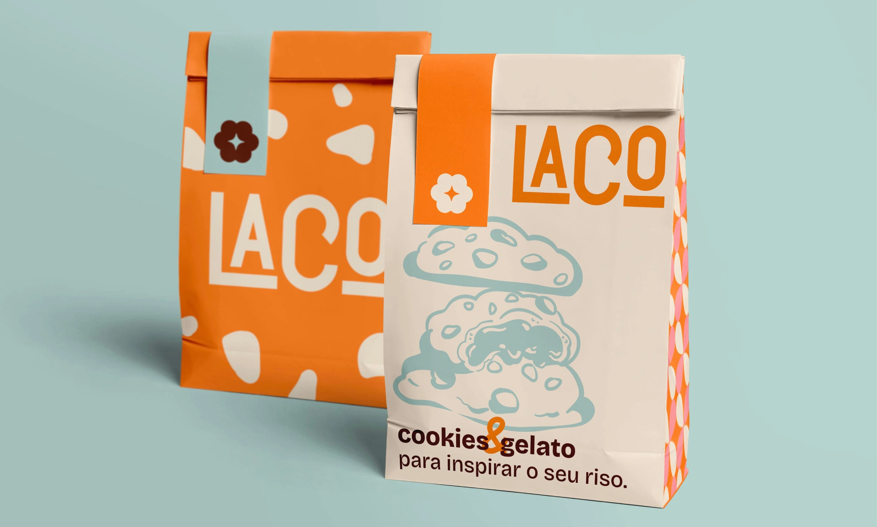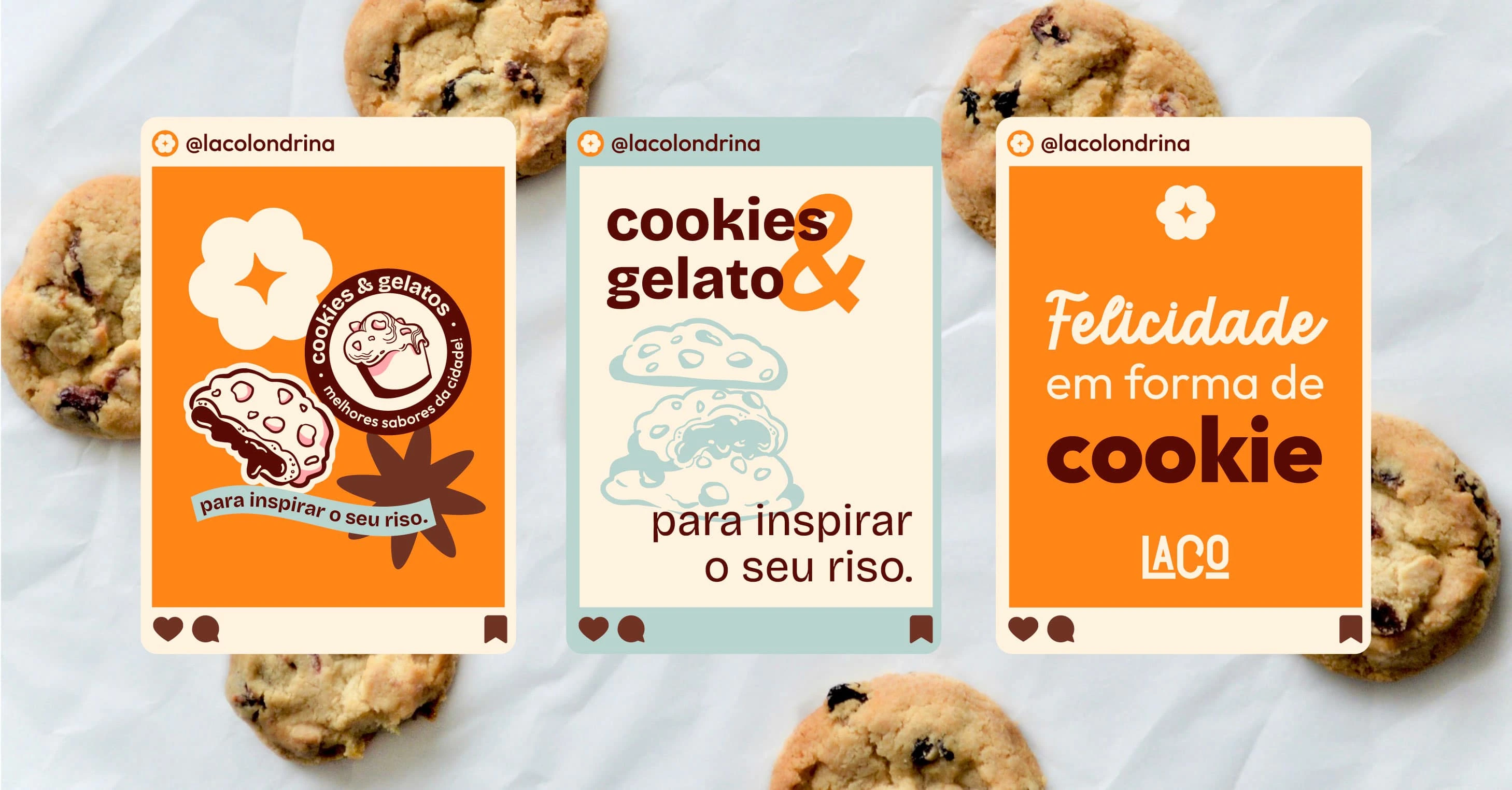 LaCo is a store in Londrina, Paraná, that specializes in artisanal cookies and gelatos. The brand values artisanal products with authentic, high-quality flavors. The goal of this project was to create a cheerful and vibrant visual identity, highlighting the products offered by the store and creating a warm and inviting communication.