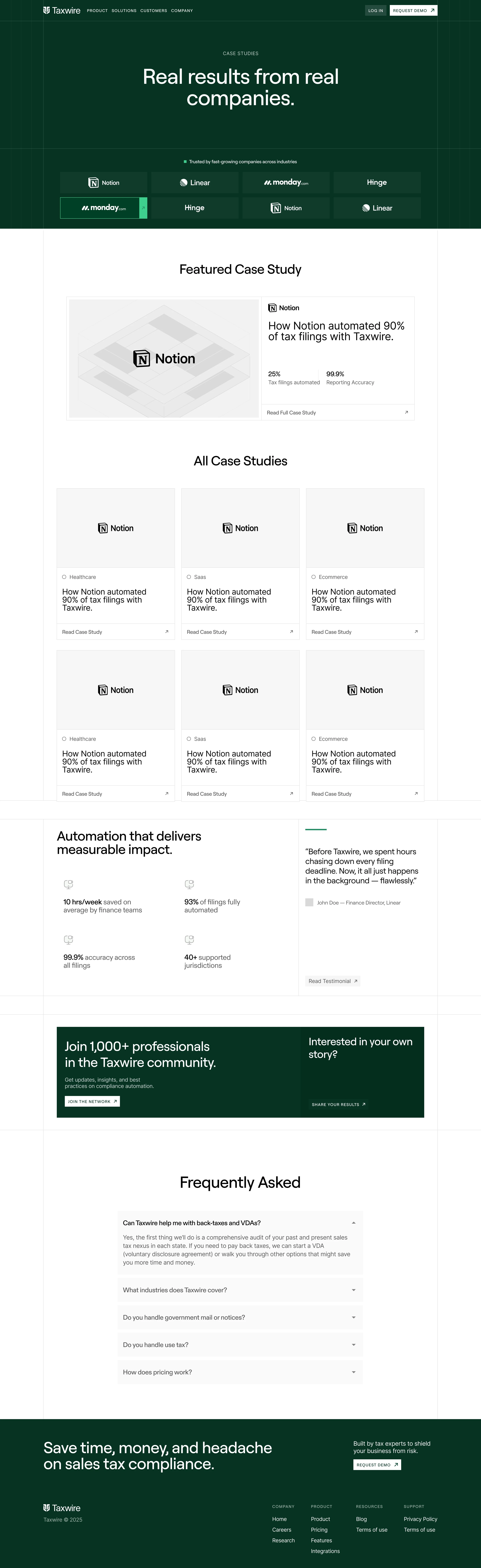 Taxwire is a fintech company automating global sales tax compliance for modern finance teams. Their product helps companies save time and money by simplifying complex, multi-jurisdiction tax workflows.