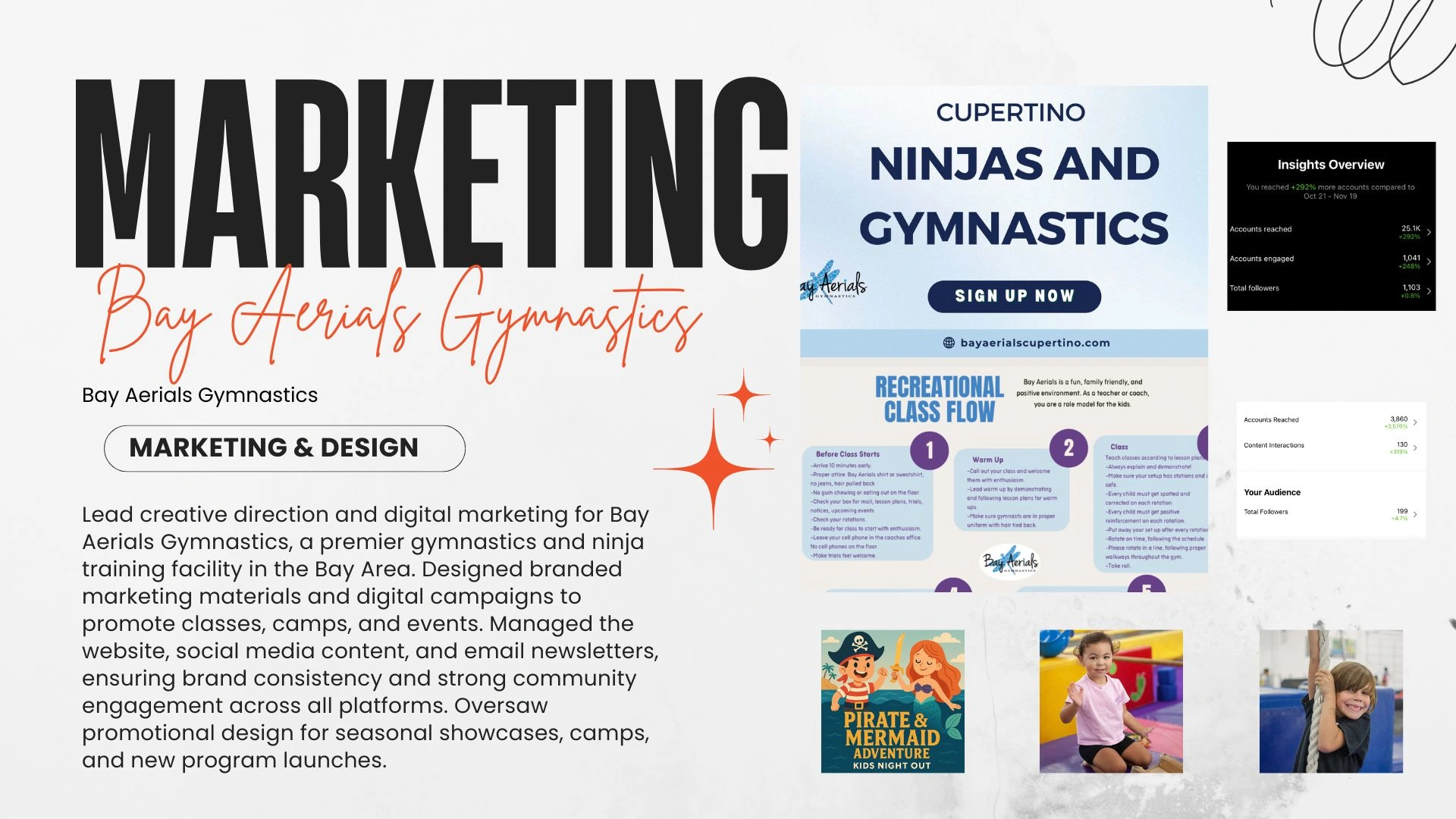 Lead creative direction and digital marketing for Bay Aerials Gymnastics, a premier gymnastics and ninja training facility in the Bay Area. Designed branded marketing materials and digital campaigns to promote classes, camps, and events. Managed the website, social media content, and email newsletters, ensuring brand consistency and strong community engagement across all platforms. Oversaw promotional design for seasonal showcases, camps, and new program launches.