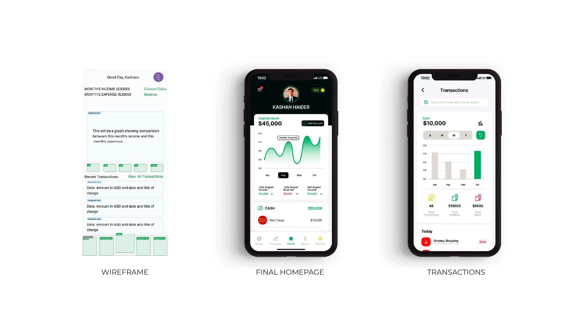 I designed the page by adding an interactive graph with filters to access different months. Furthermore, improvising on the wireframe design, I added category labels with the total amount displayed within them, which could then be used as drop-down to view more information or clicked to be redirected to a separate transaction page.