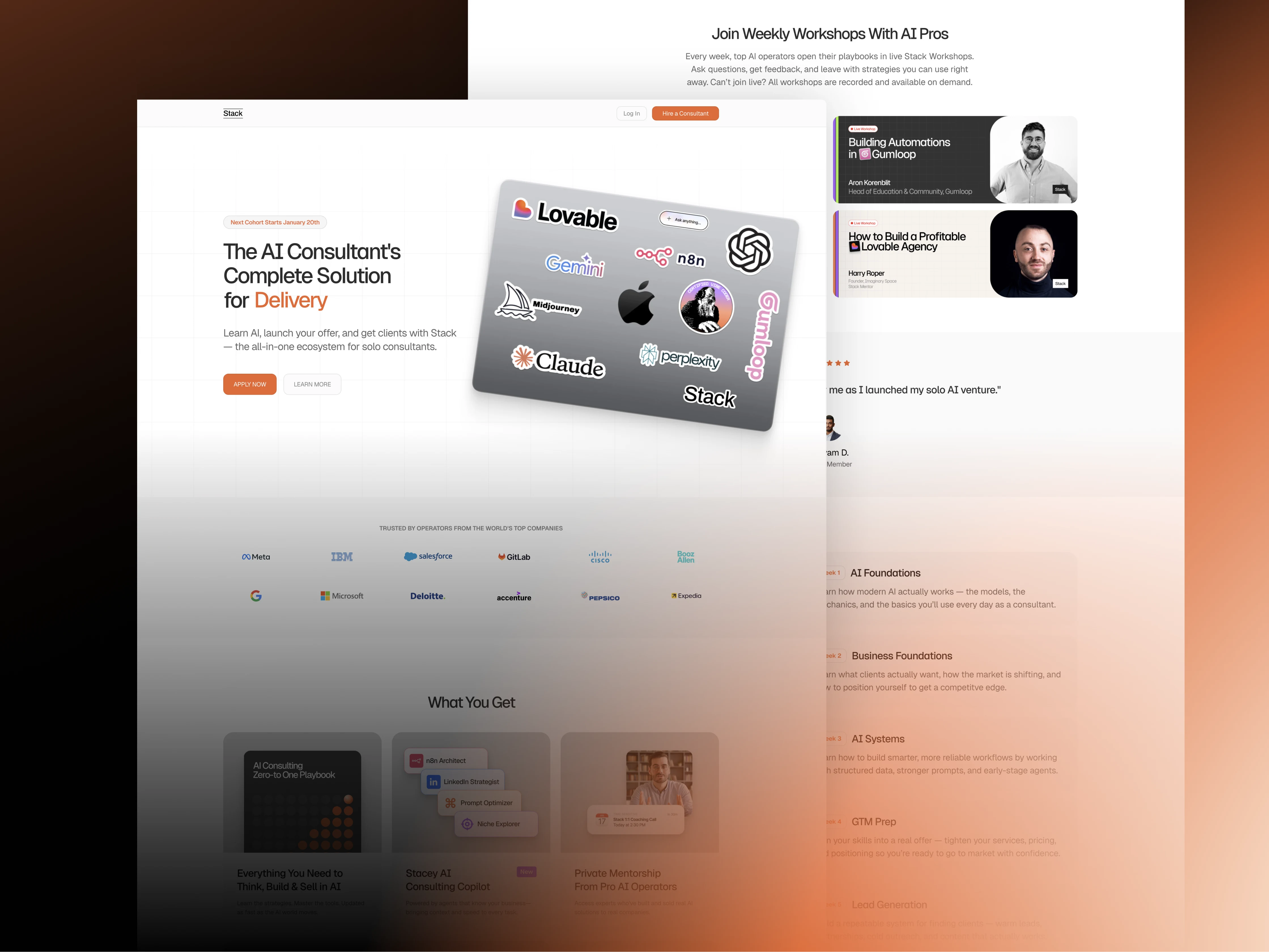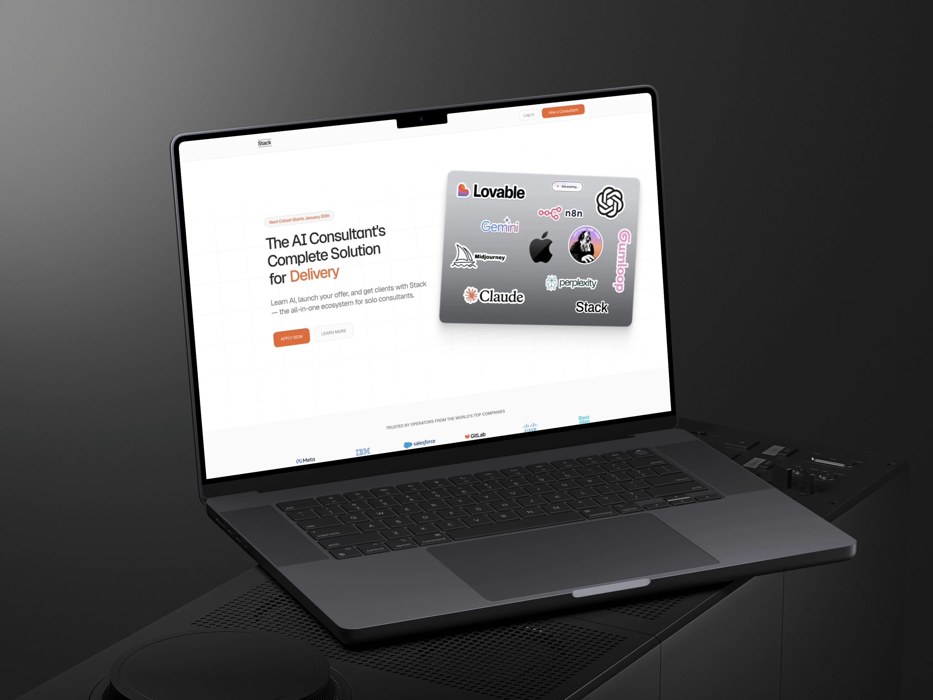 Stack is an all-in-one ecosystem for AI consultants, providing education, mentorship, tools, and community for solo consultants building AI businesses. AGR Studio serves as their dedicated Framer development partner, handling all technical implementation and maintenance.