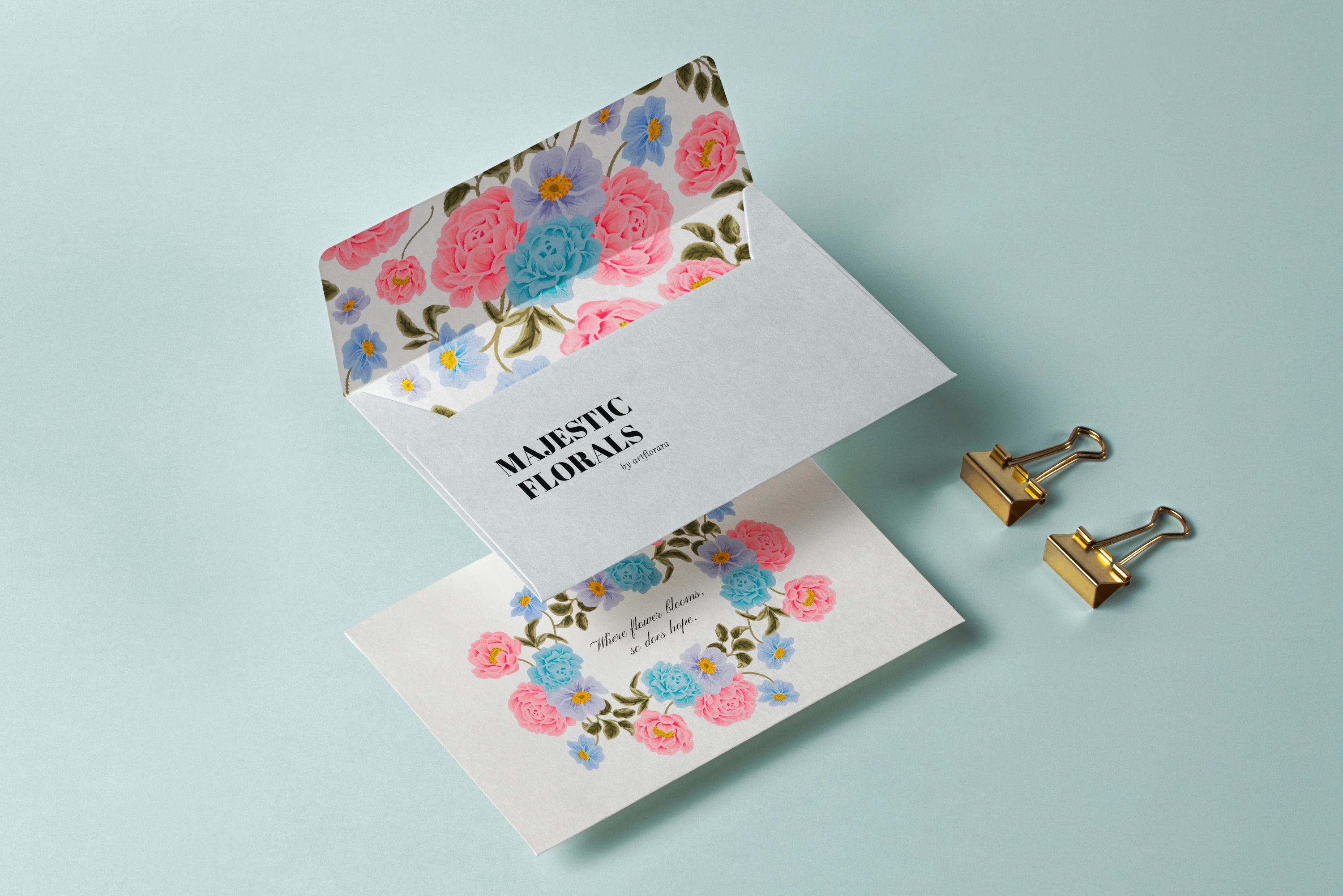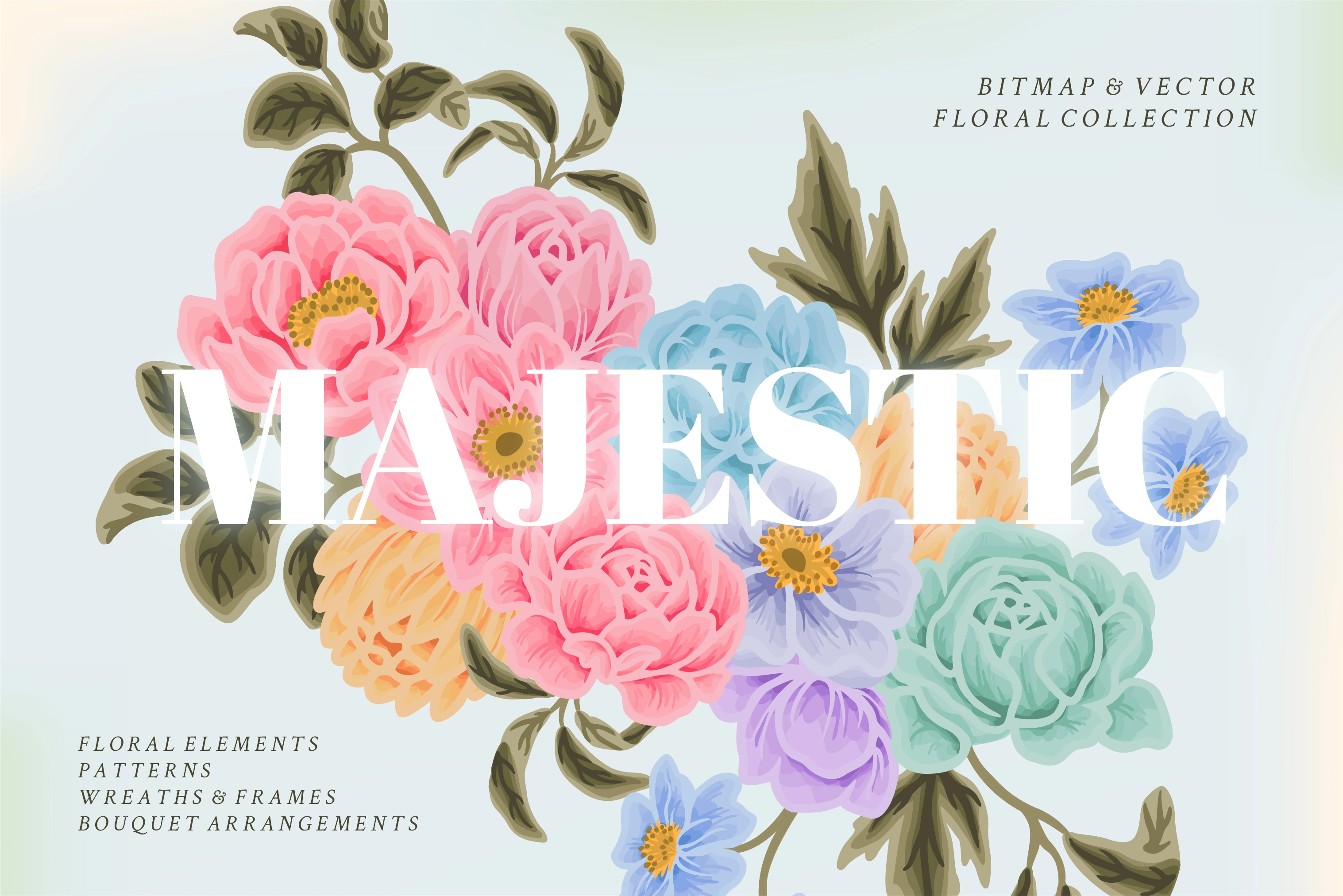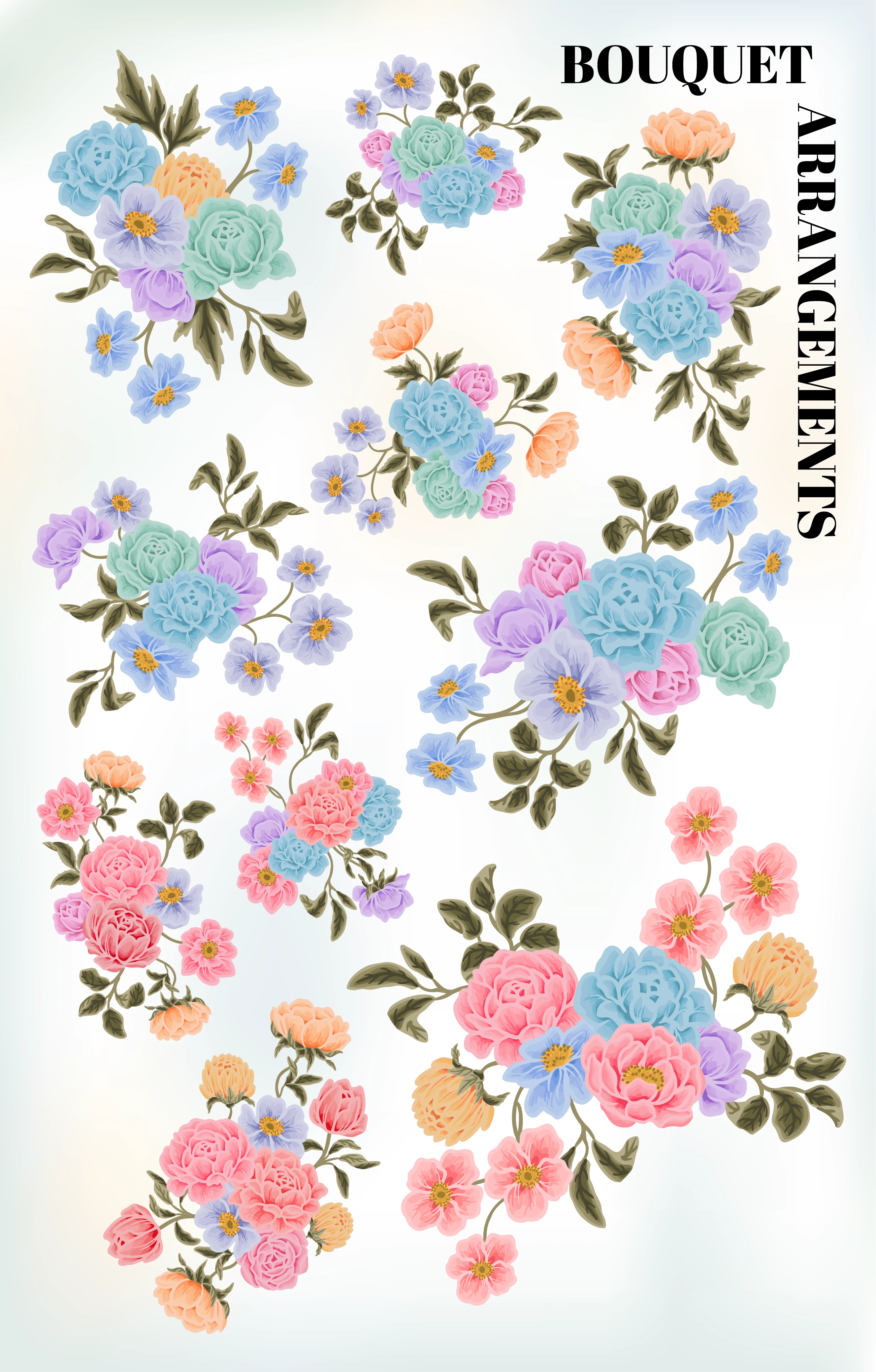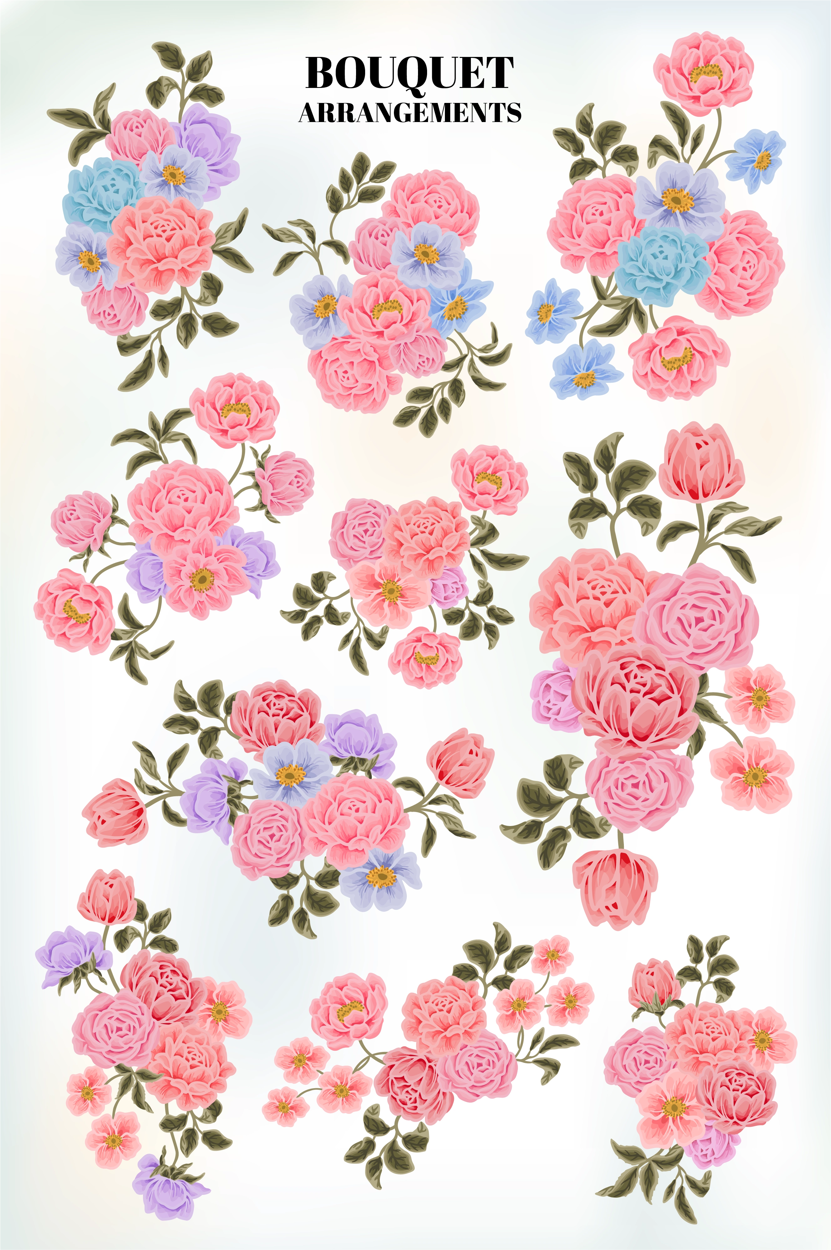 A collection of colorful flower elements, carefully arranged into flower bouquet arrangements, frames, wreaths, and seamless patterns. The flower elements are …