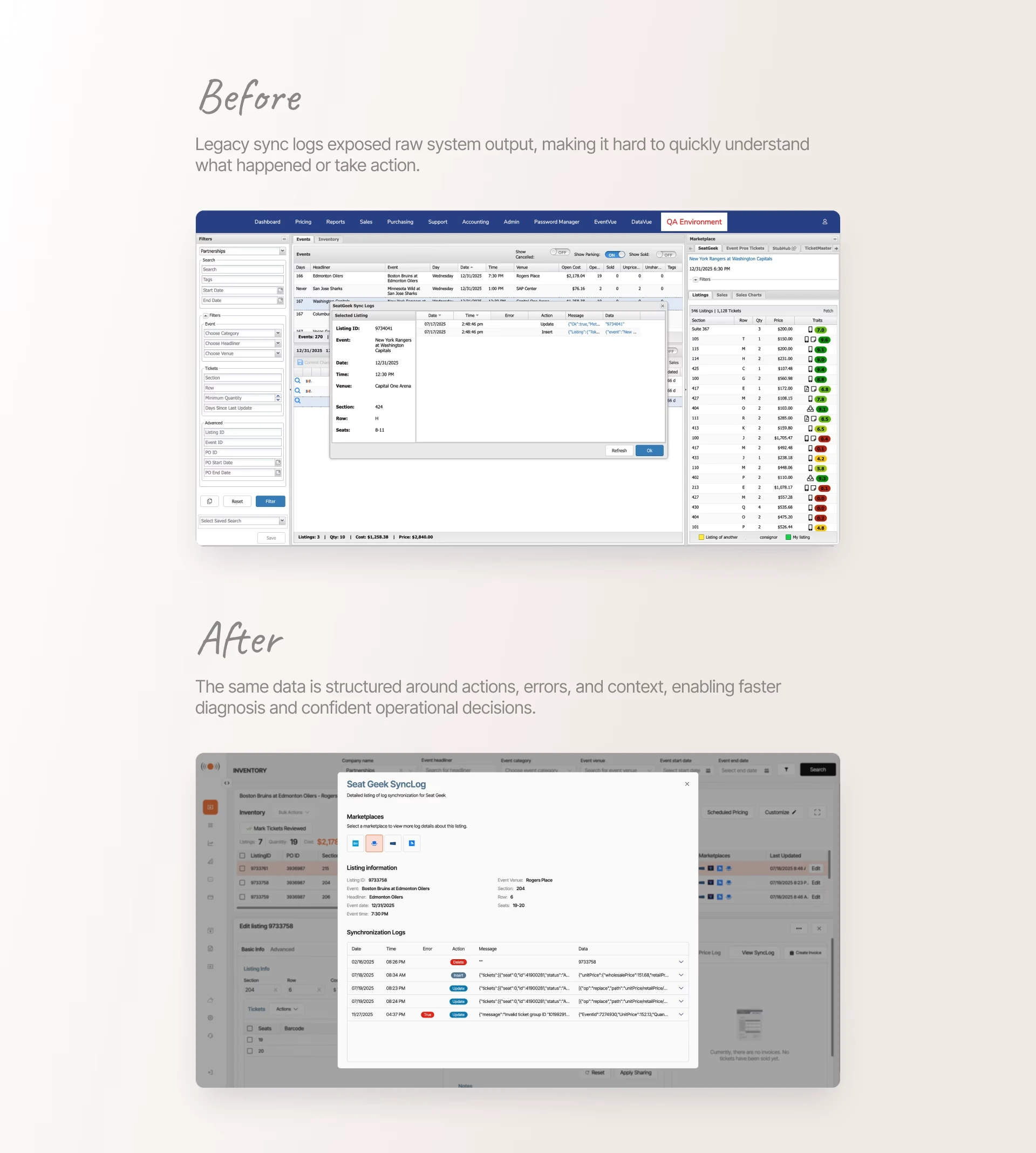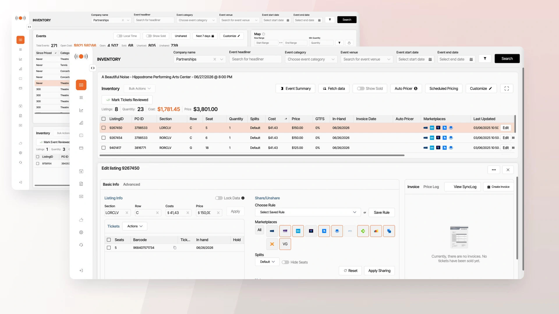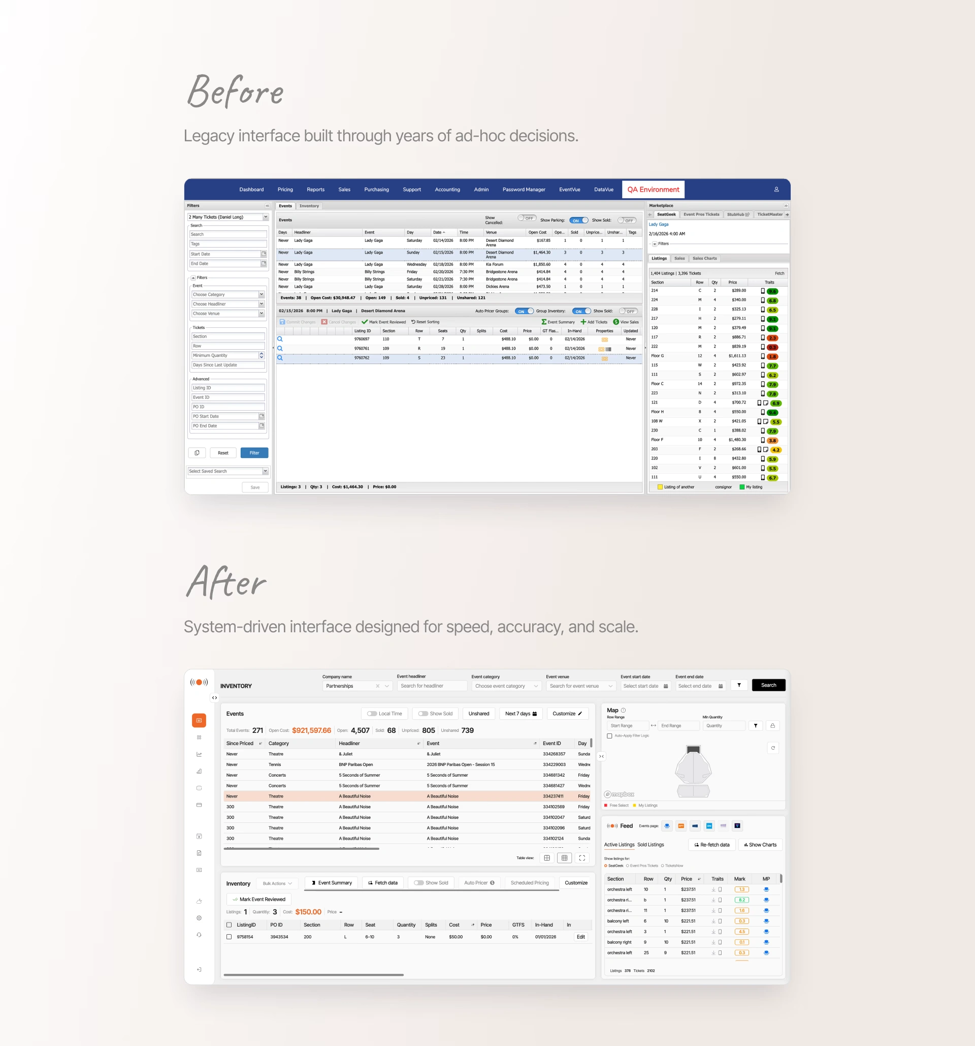 [NDA protected] A large-scale enterprise B2B platform used by professional brokers to manage ticket inventory, pricing, and distribution across multiple US marketplaces. I act as the sole UX Owner, responsible for modernizing legacy workflows, standardizing UI through a shared design system, and aligning multiple products under a consistent UX direction.