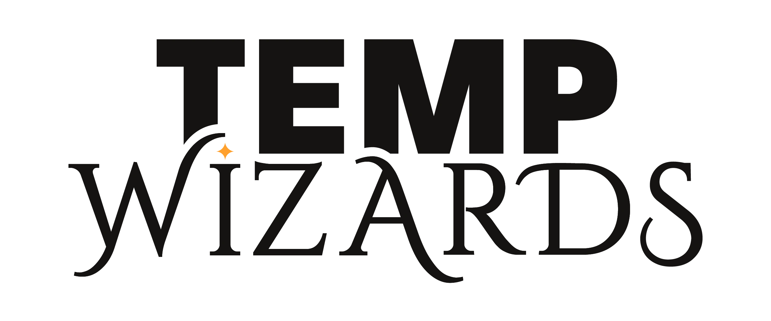 The logo combines a modern sans-serif for “TEMP” with a playful, serif-inspired style for “WIZARDS,” and a subtle star-like spark over the “I” for a touch of whimsy.