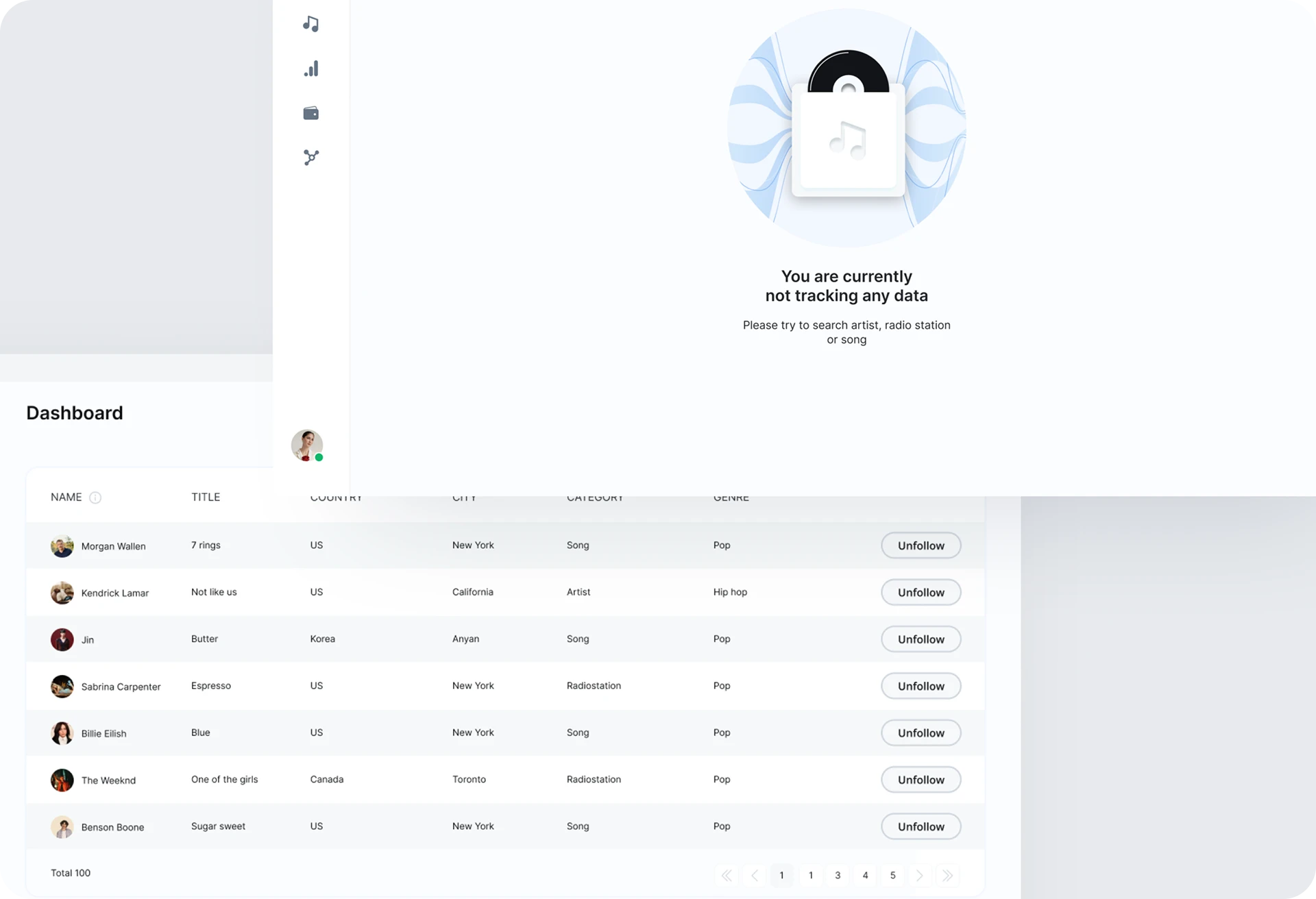 The goal was to design a blockchain-powered web platform that enables musicians to track global song plays and directly monetize their airplay through tokenized rights. Unlike traditional analytics tools, this product had to merge real-time radio data with Web3 transactions, making it understandable for artists with little to no blockchain experience.