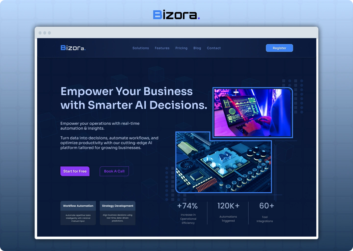 This project involved redesigning the hero section of the landing page for Bizora, an AI-powered platform designed to help businesses optimize operations through smart automation and data-driven insights.