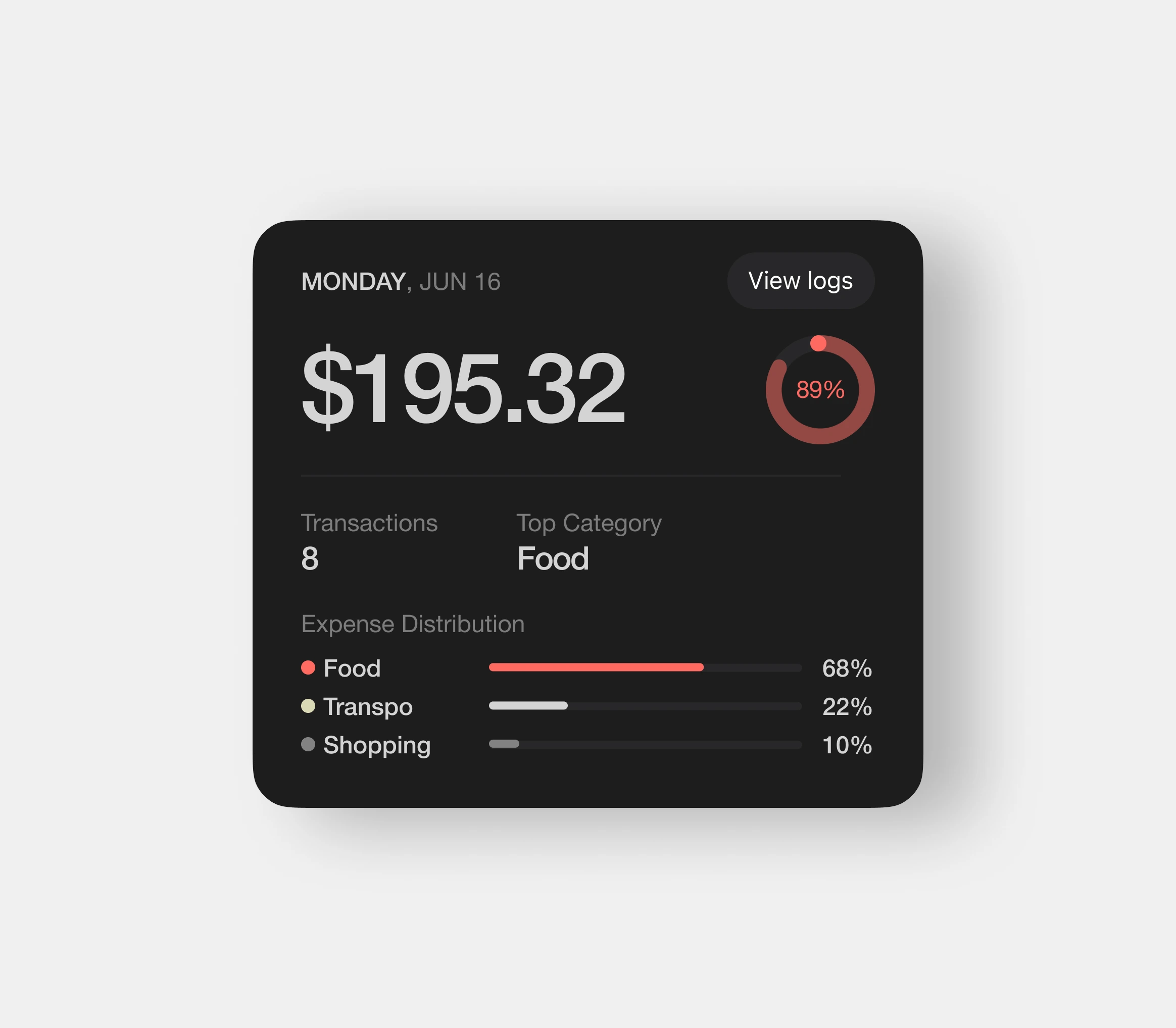 The focus is on the total amount spent, styled prominently to catch attention. Beside it is a progress pie that represents how much of the daily budget has been used—paired with a percentage value (e.g., 89%) to keep things clear without overwhelming. It’s a simple but effective way to give users a sense of how close they are to overspending.